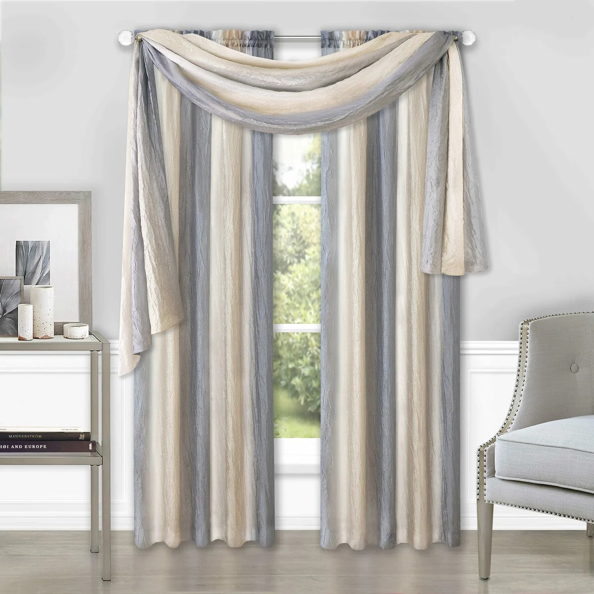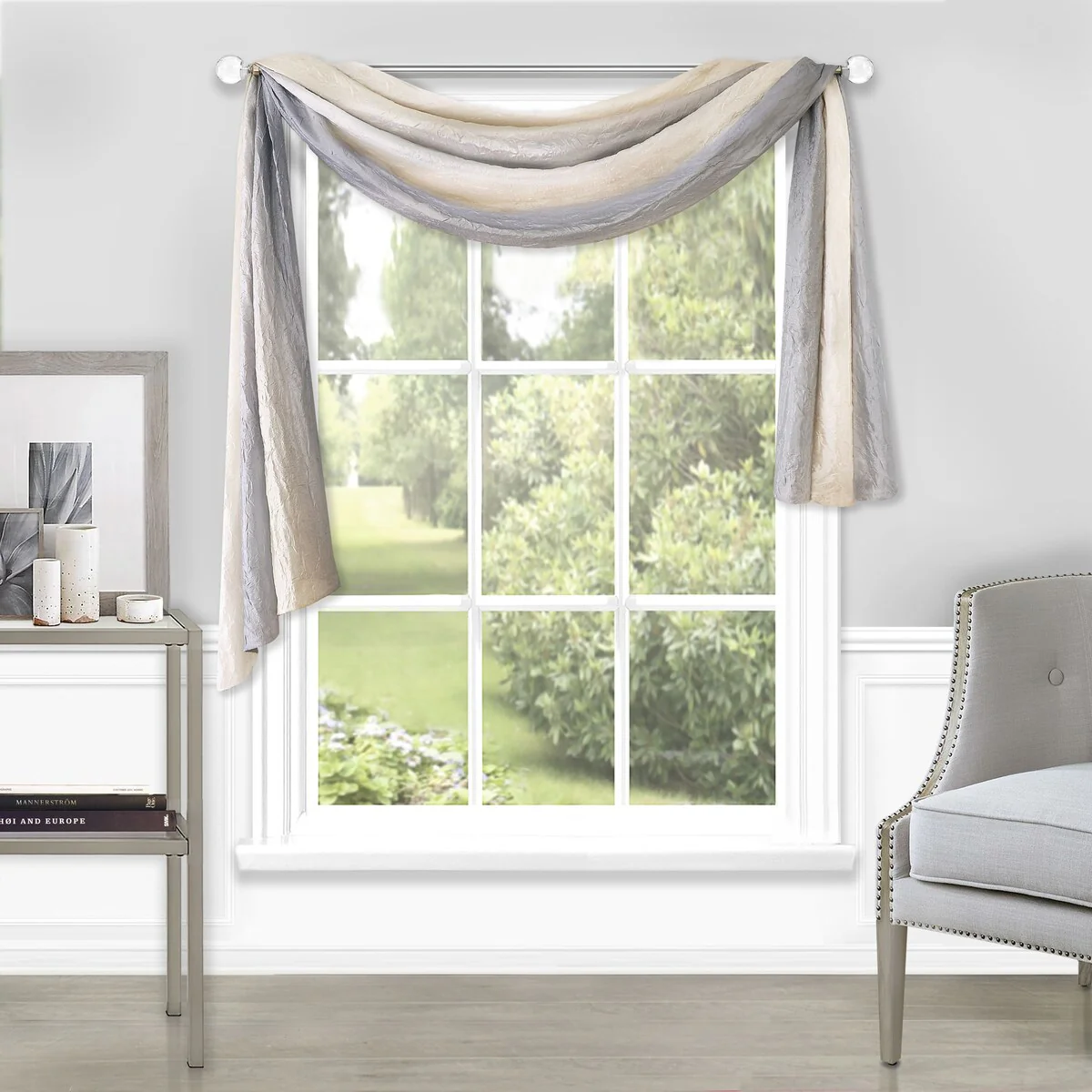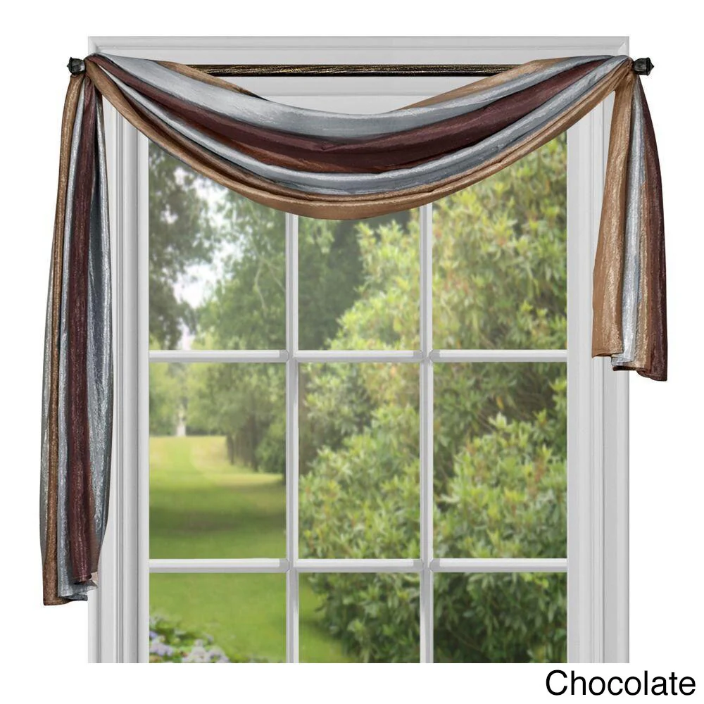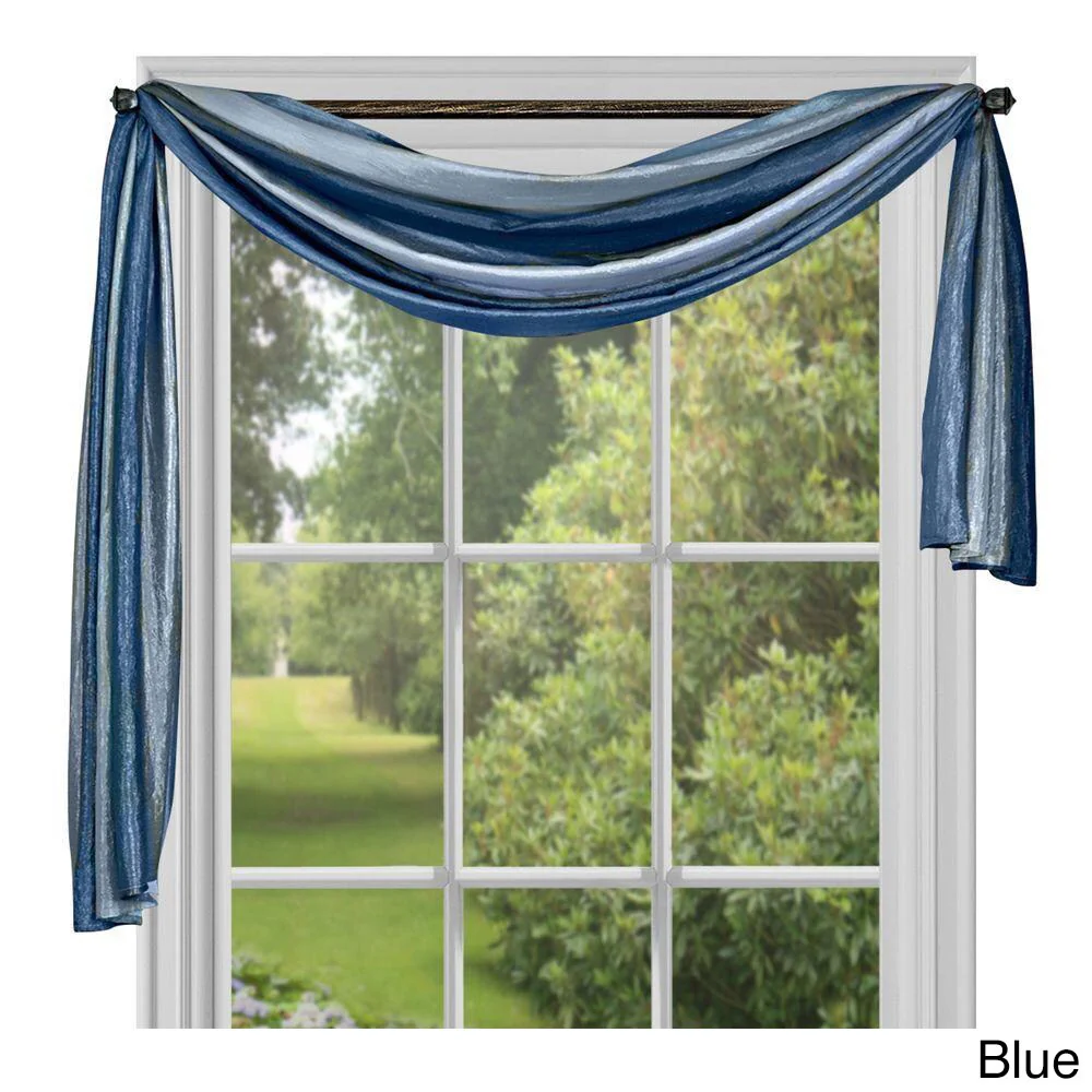 The Ombre Scarf makes a statement with its transitional array of color, creating a variegated design that is soothing and complementary to most décor styles. Each scarf is 50-inches wide by 144-inches long. Made with machine washable polyester and drapes beautifully. The image shows a single scarf. Coordinating Ombre waterfall valance, panels, and tie-up shade are available separately.