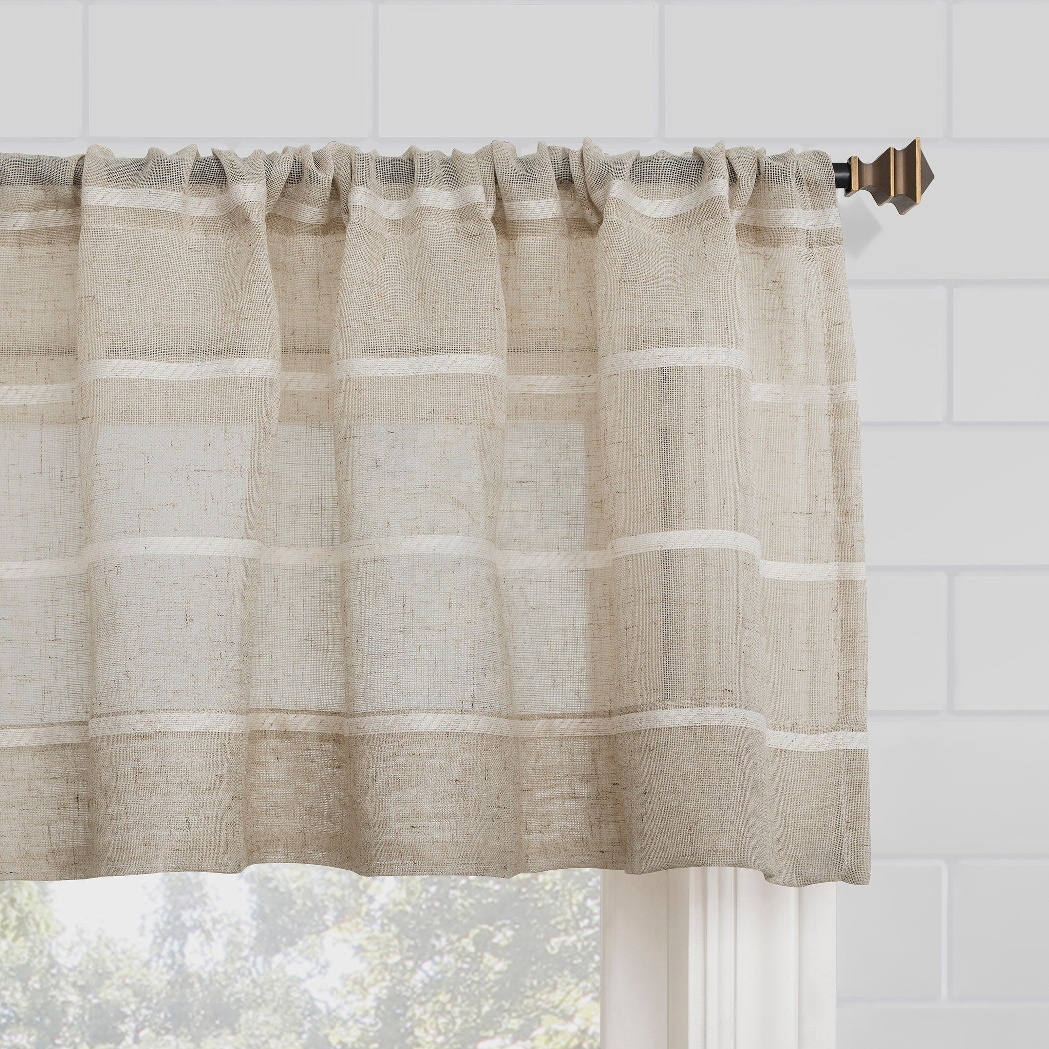 Create a healthier and more comfortable environment with Clean Window Twill Stripe Anti-Dust Linen Blend Sheer Cafe Curtain Valance. The linen blend semi-sheer fabric features twill stripes and is interwoven with ENDUR by Ascend? active fibers that inhibit static and cling, repelling dust, lint, hair, pet dander, allergens, and outdoor irritants. This makes it a perfect choice for pet owners and allergy sufferers. The rod pocket design allows for easy installation on curtain rods up to 1.5? in diameter.