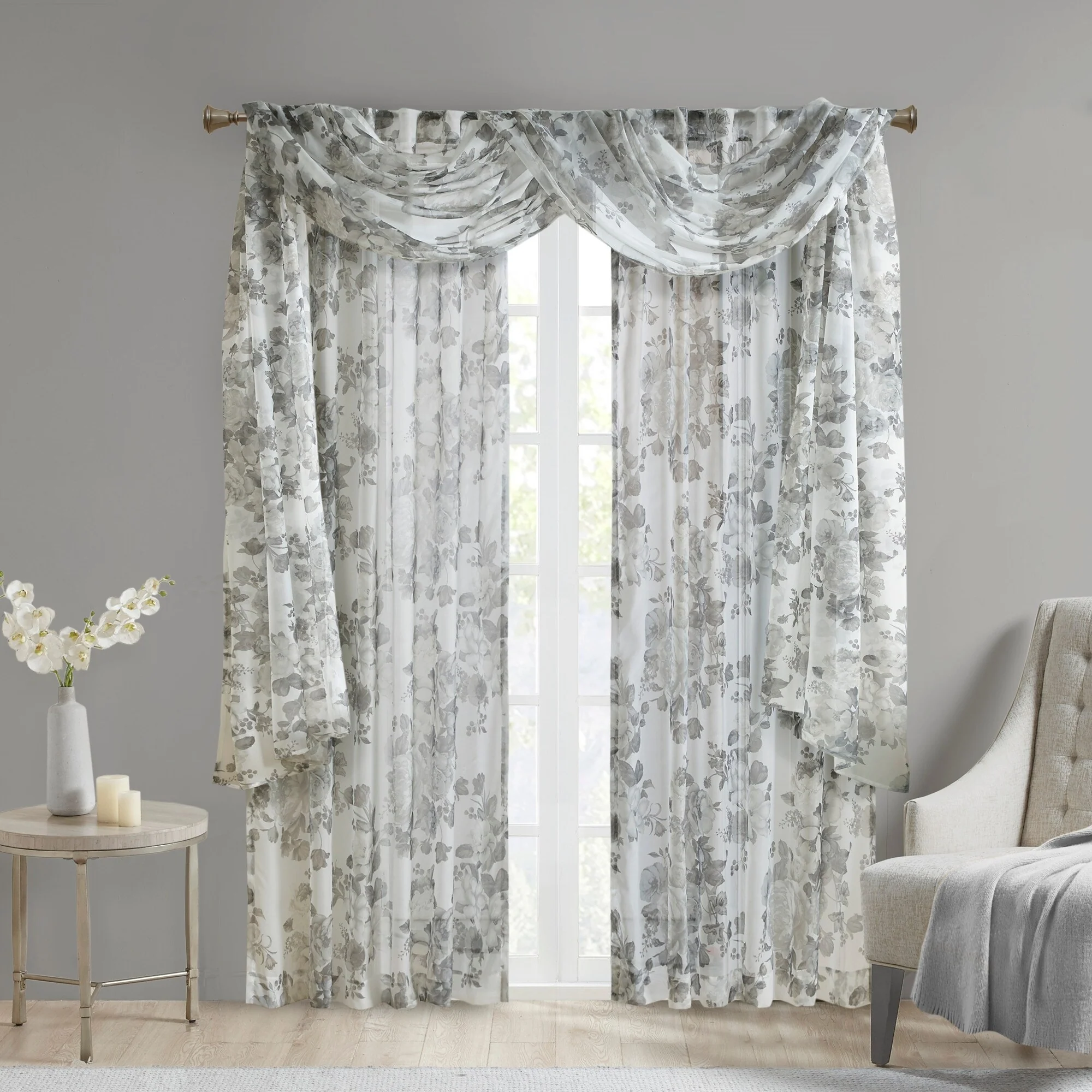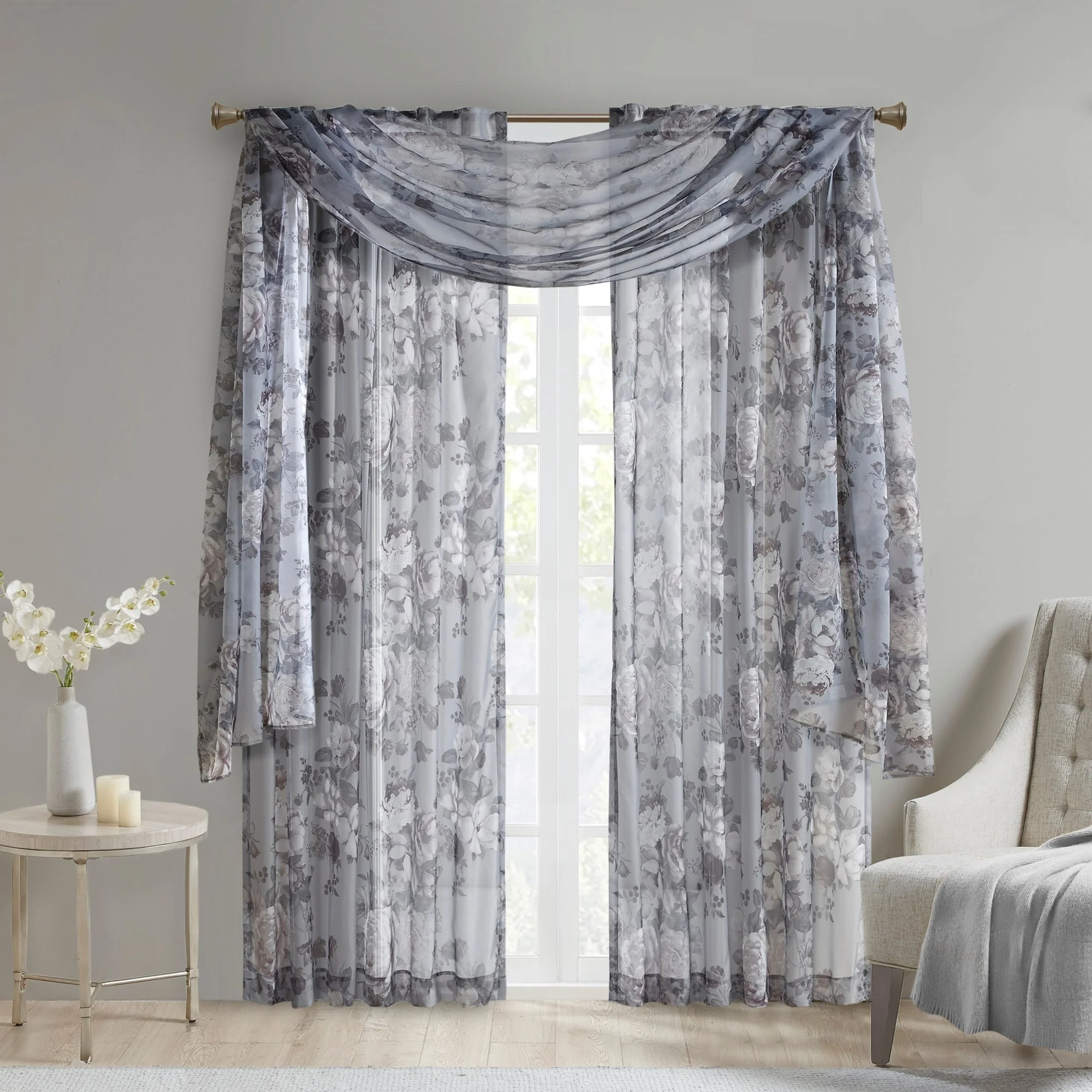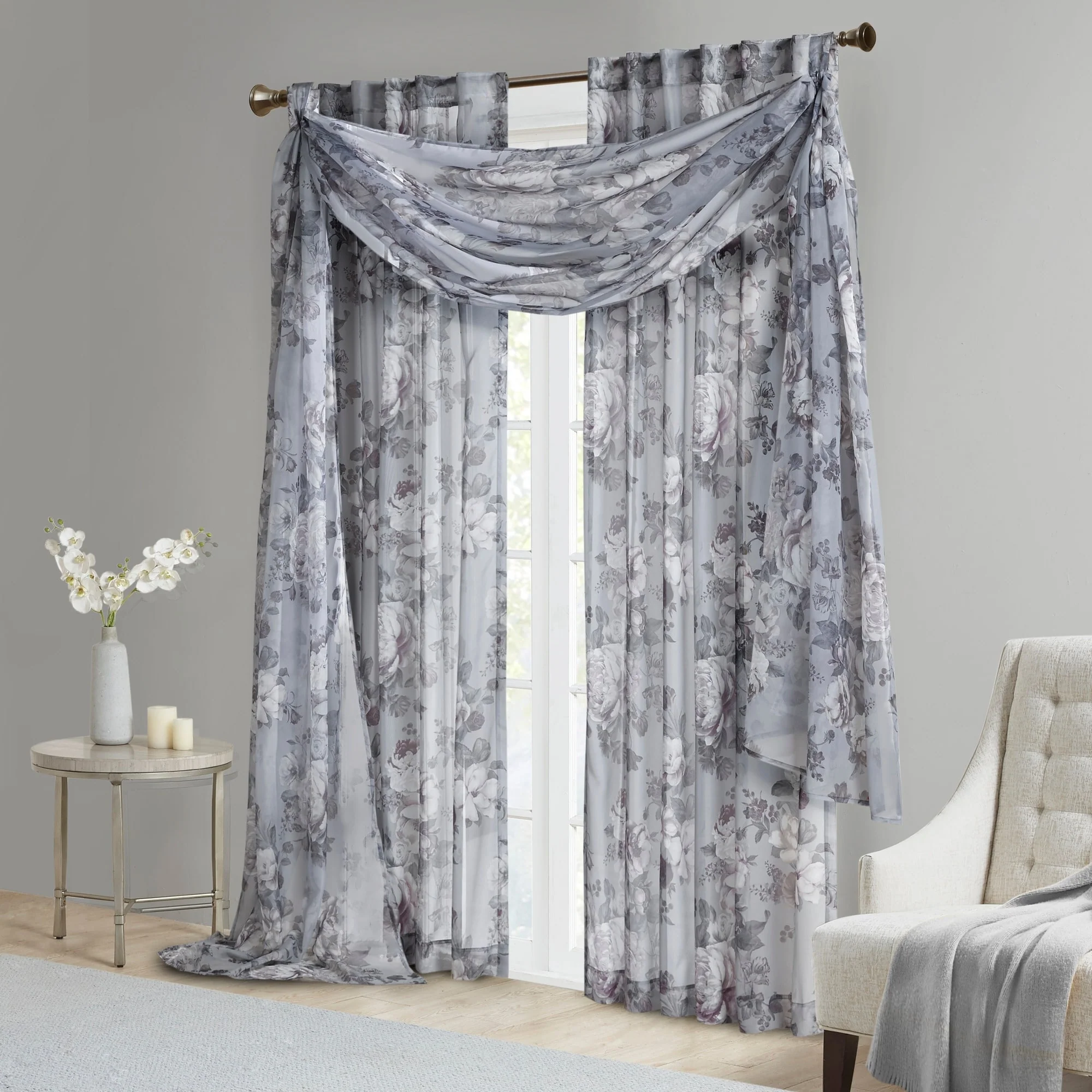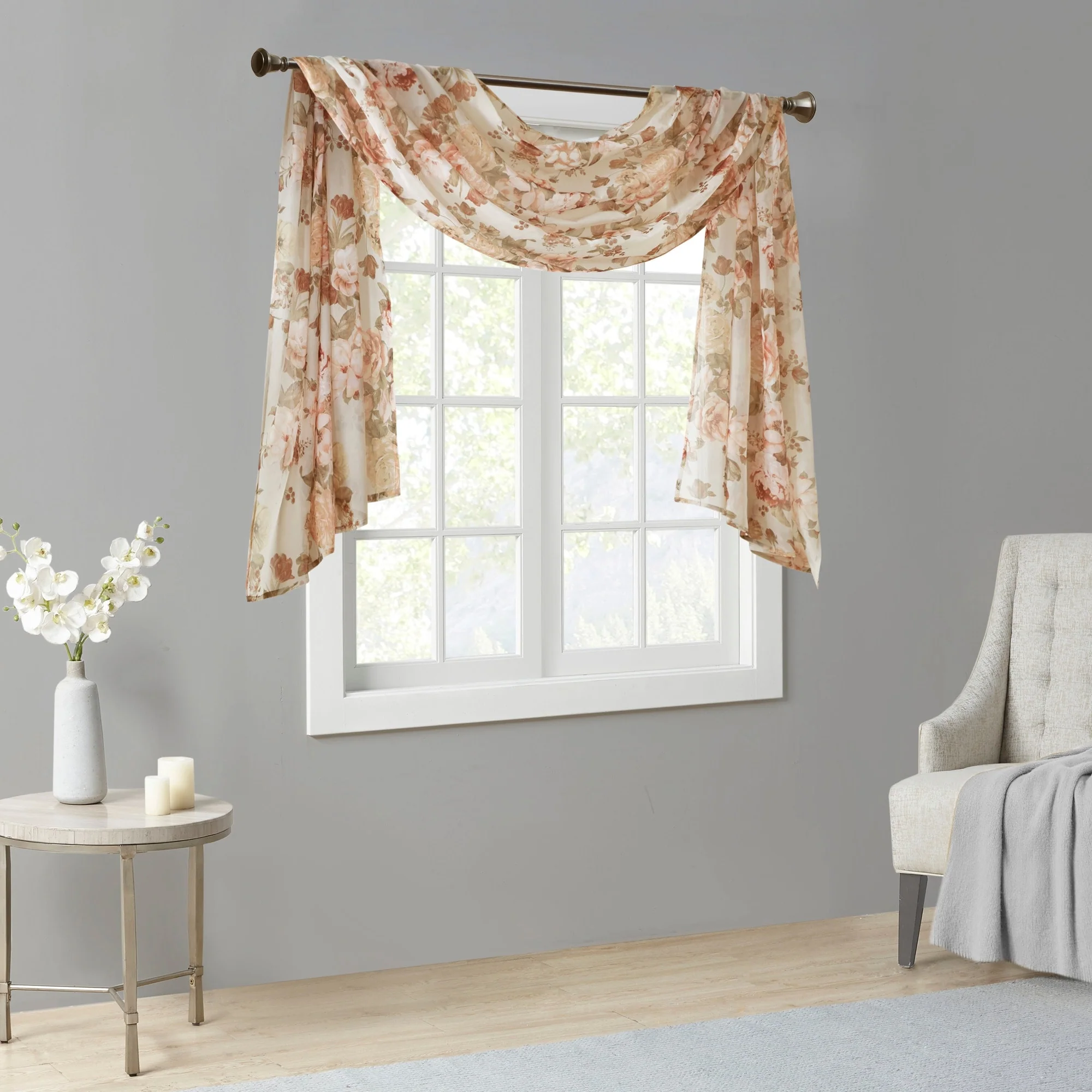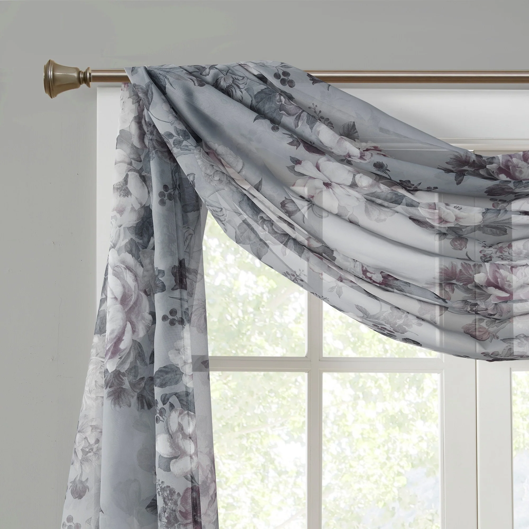 The Madison Park Abelia Printed Floral Voile Sheer Scarf adds a soft and romantic touch to your home decor. This voile sheer scarf features a beautiful soft tone printed floral on a neutral ground for a rich and stylish contrast, while the lightweight fabric adds a delicate and airy touch while it's also OEKO-TEX certified. This sheer scarf included four tabs with button closures that provide an easy way to drape it across your window curtain rod, for an elegant finishing touch.
