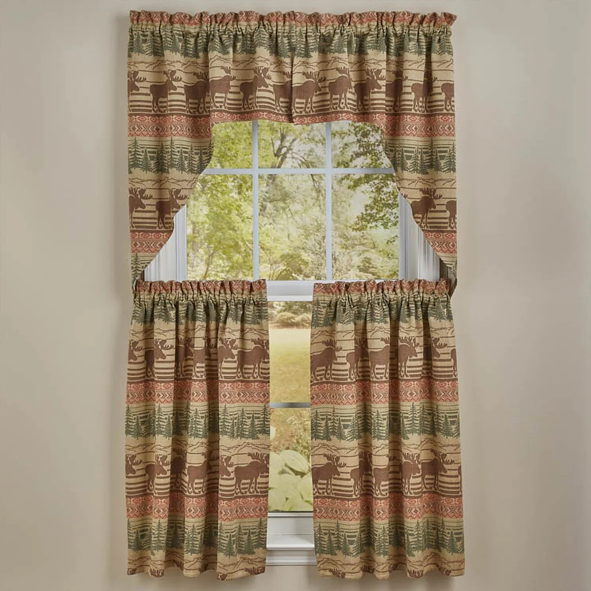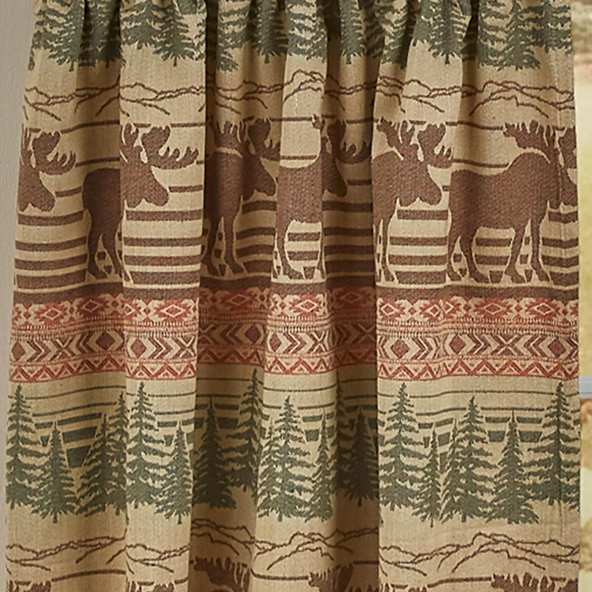 Immerse your home space with the texture and mood of the great outdoors! Crafted with attention to detail, this jacquard patterned swag curtain pairing showcases a variety of popular wilderness inspired elements including iconic mountains, trees, moose, and geometric designs. The outdoorsy desert color palette provides a rustic focal point that enhances the aesthetic appeal of your lodge and country dining room decor. The shape of this set of rustic swag curtains delicately frame a window setting to invite a fresh look without having to redecorate the entire room.
