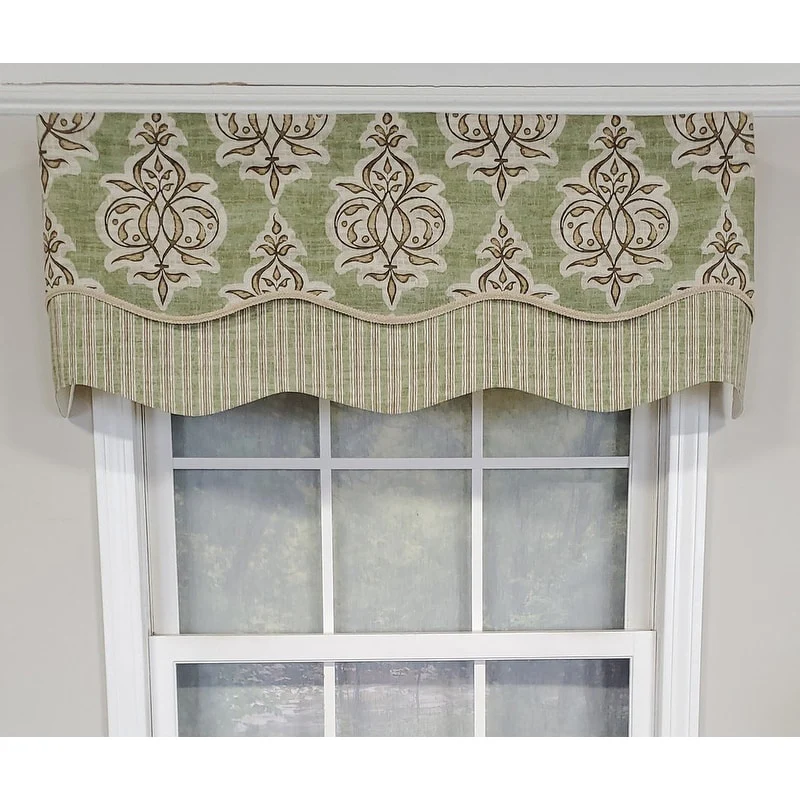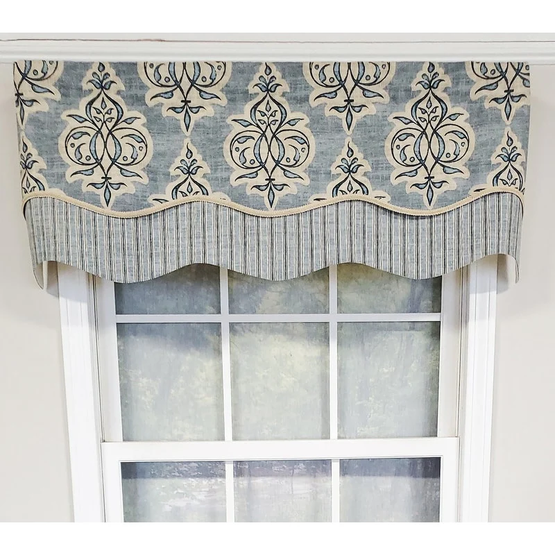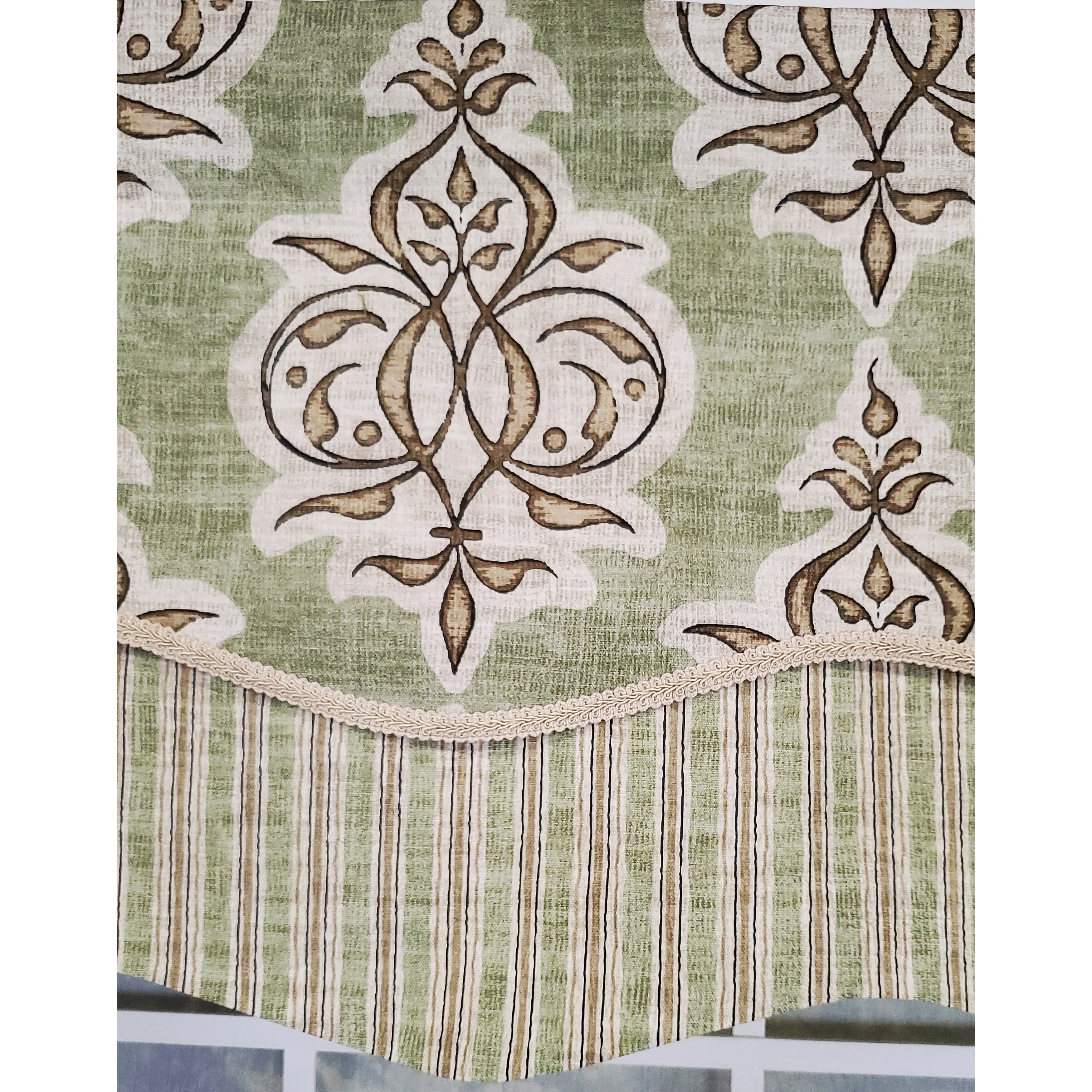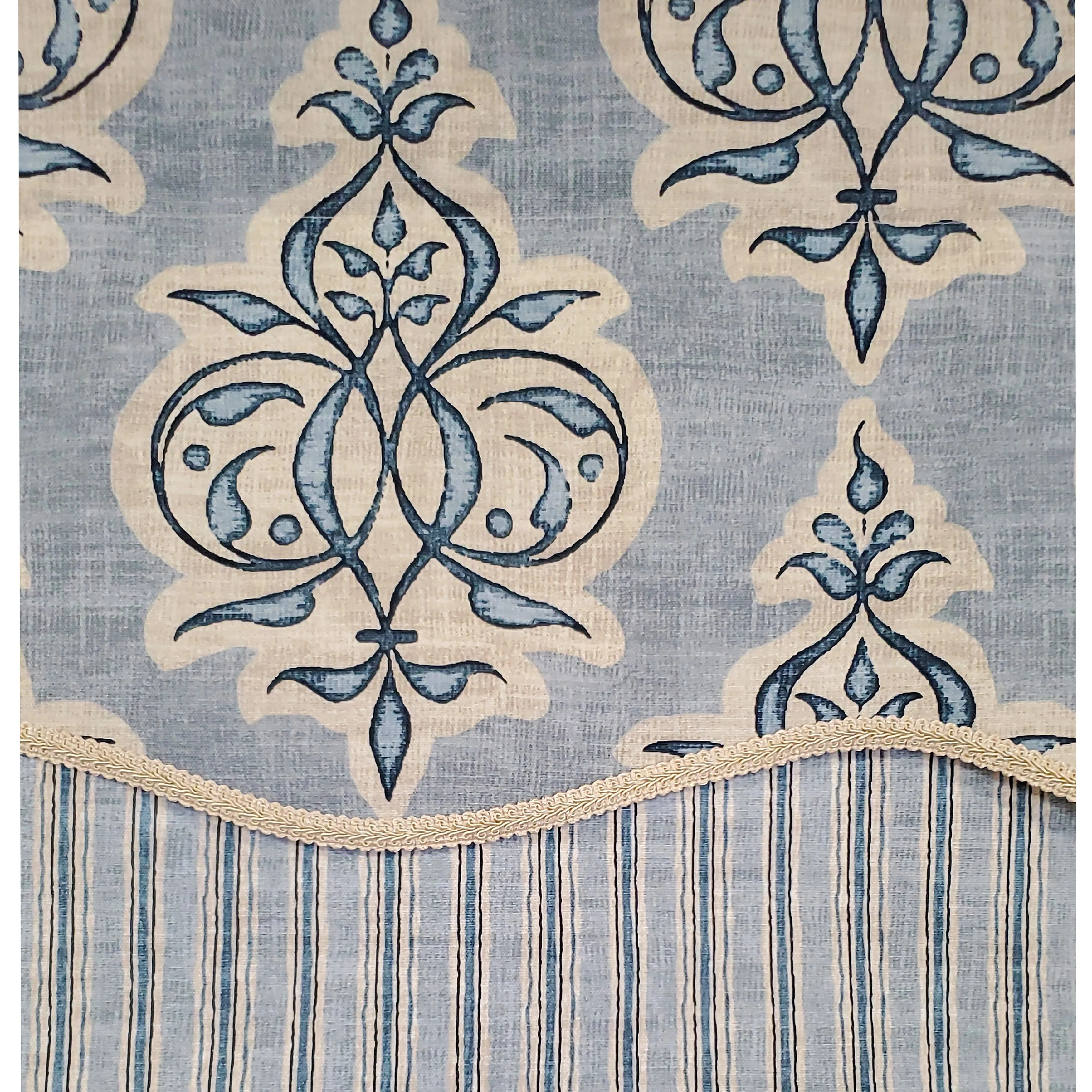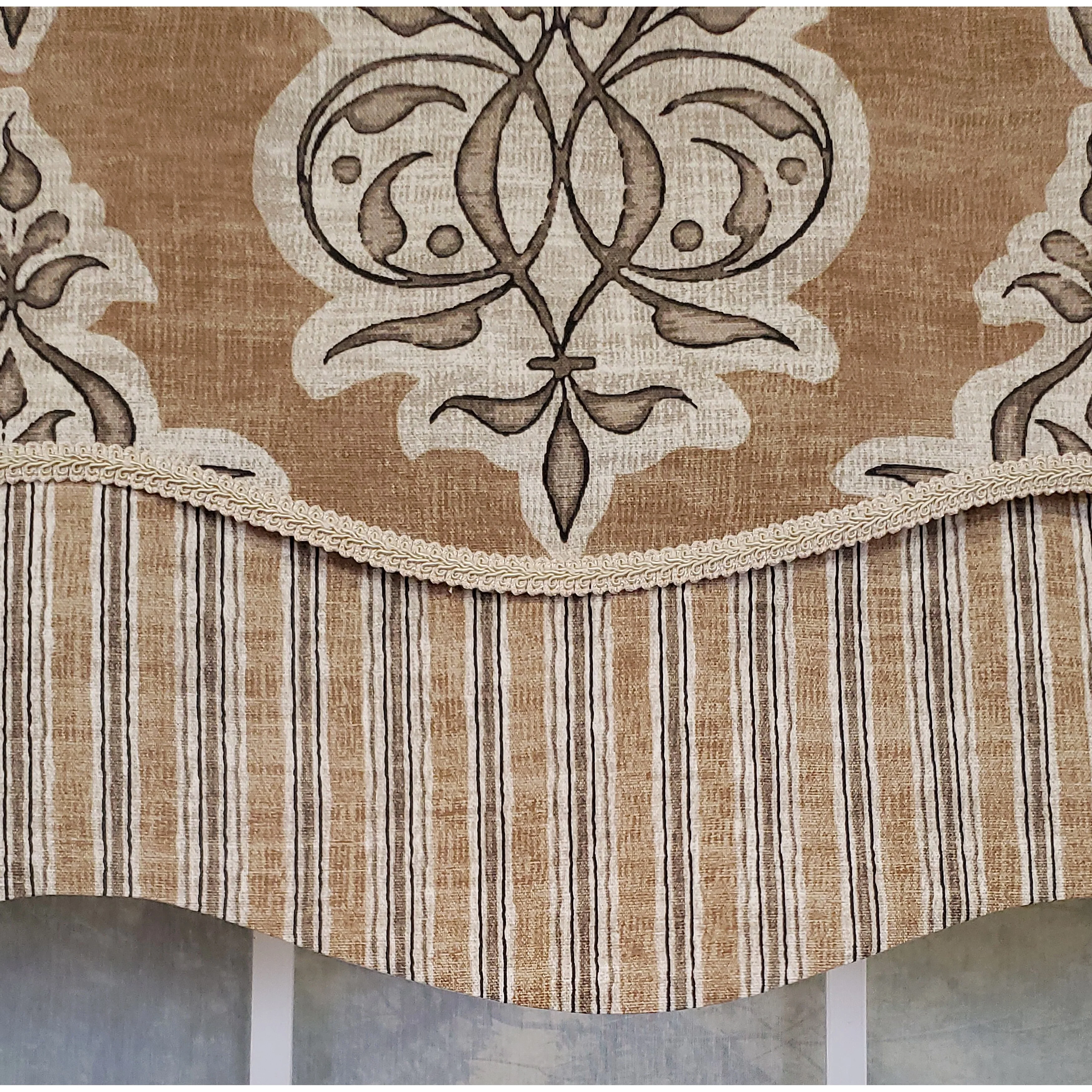 Stripe Coordinate on bottom layer. Braided coordinationg gimp. Fits Window up to 48'W. Use multiples for wider windows. Fully lined. 16'Drop by 50' Wide. RLF Home Original Petticoat style pattern