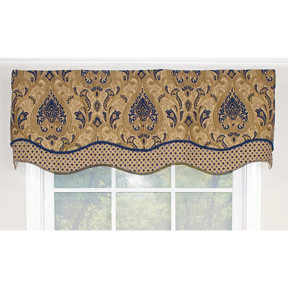 - Scalloped and layered valance with medallion pattern and French gimp trim