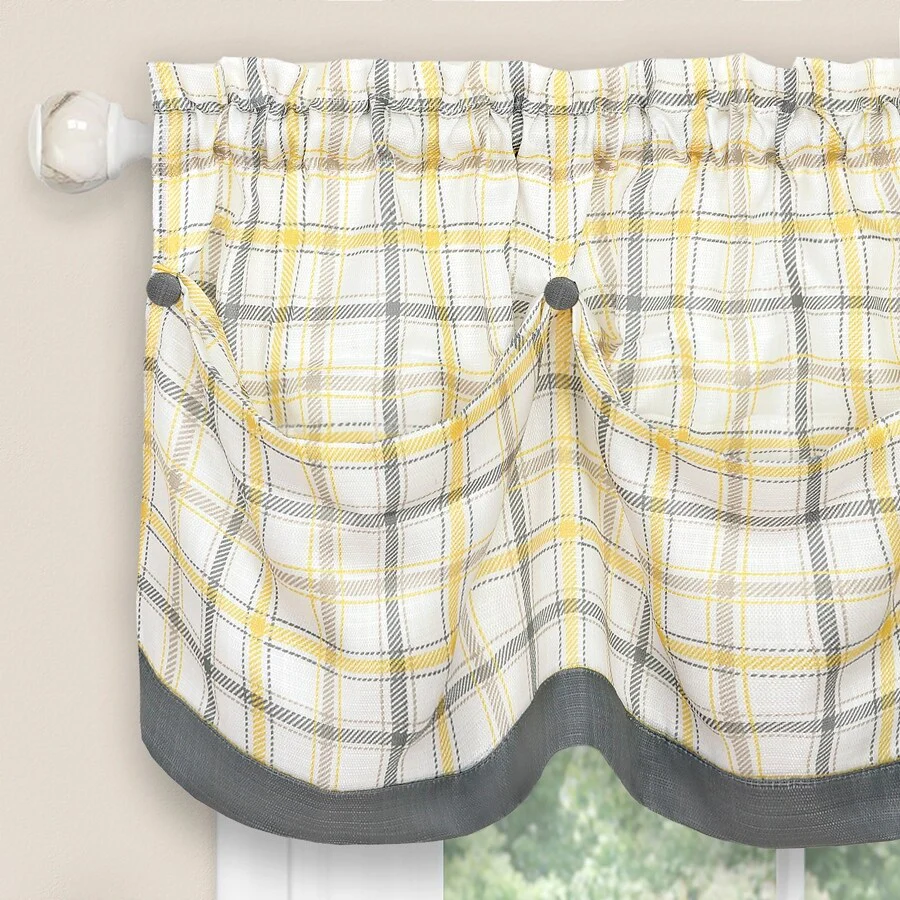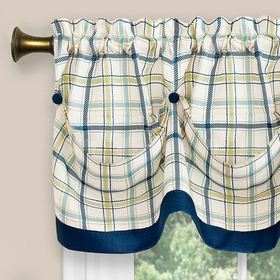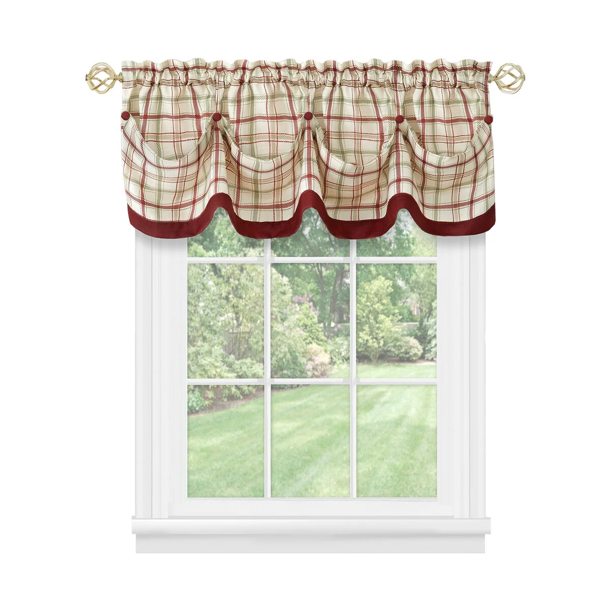 Add a touch of country charm to your windows with this lovely Tattersall Tuck Valance with Buttons. The plaid design features a coordinating solid color bottom band and is adorned with fabric covered buttons for a personalized touch. Made of light filtering polyester fabric, this valance drapes beautifully and is machine washable for easy care. The 58-inch width and 14-inch length makes it easy to fit on any type of rod. Complete the look by pairing it with the matching Tattersall Tab Top Panel or Tattersall Tier and Valance Set (sold separately).