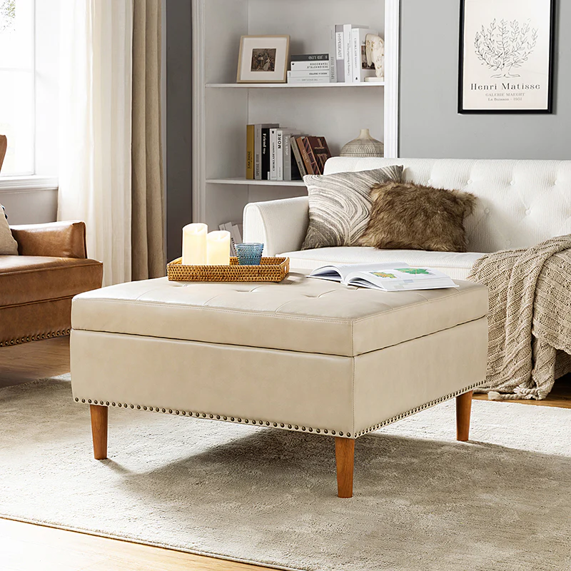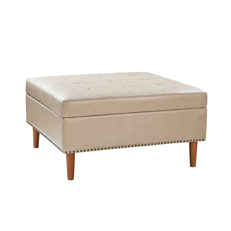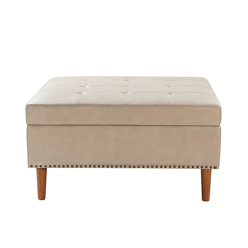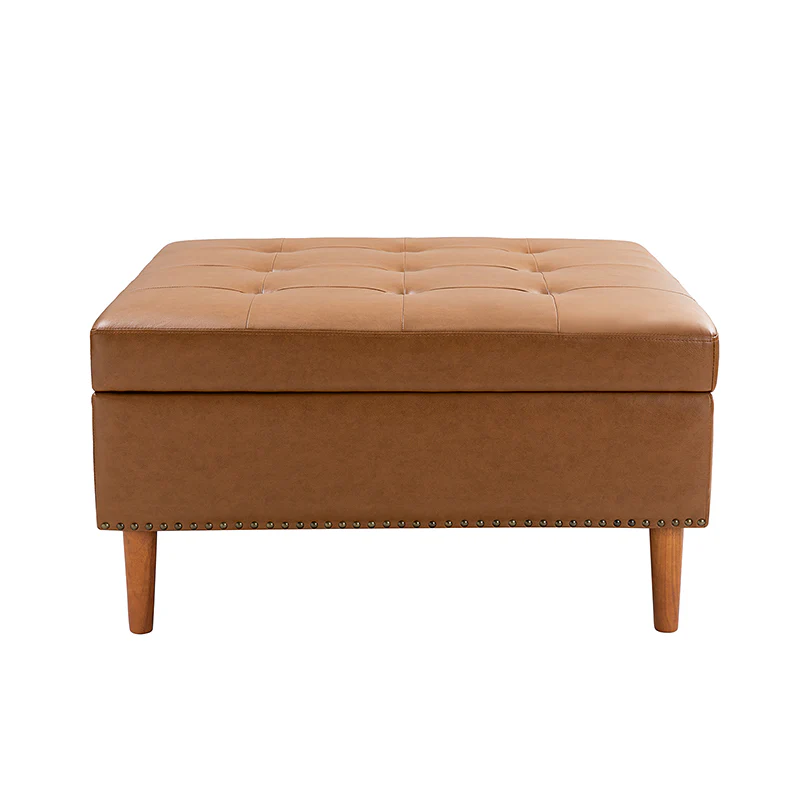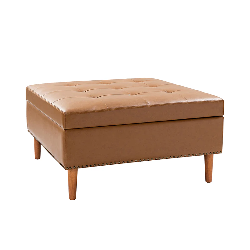 This is a versatile storage ottoman that doubles as a coffee table, featuring mid-century modern style and functionality. It's upholstered with premium vegan leather that's waterproof and resistant to oil stains and has a tufted top with a storage compartment underneath. The fabric is easy to wash which is pet and kid friendly. The ottoman also has four tapered legs and a soft-edged bottom with copper studs. It's the perfect addition to any living space, regardless of your decor style. can be paired with various seating options. Order now to elevate your home decor with this versatile and stylish piece.