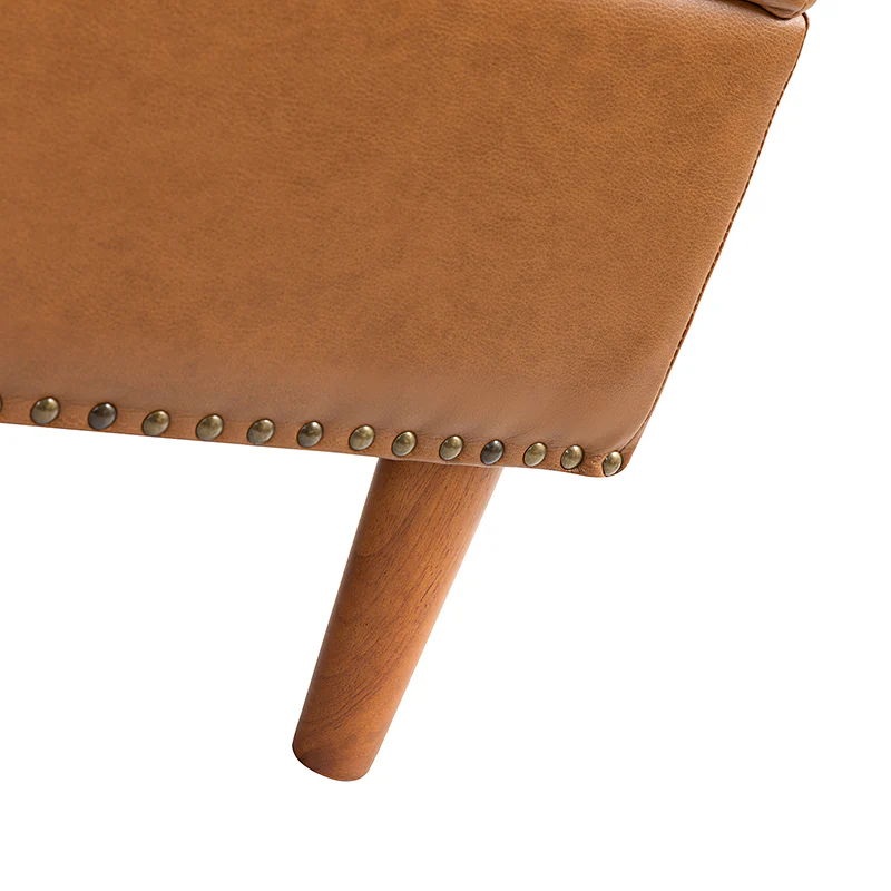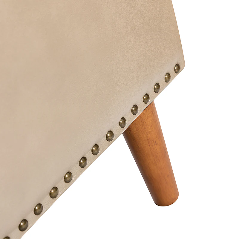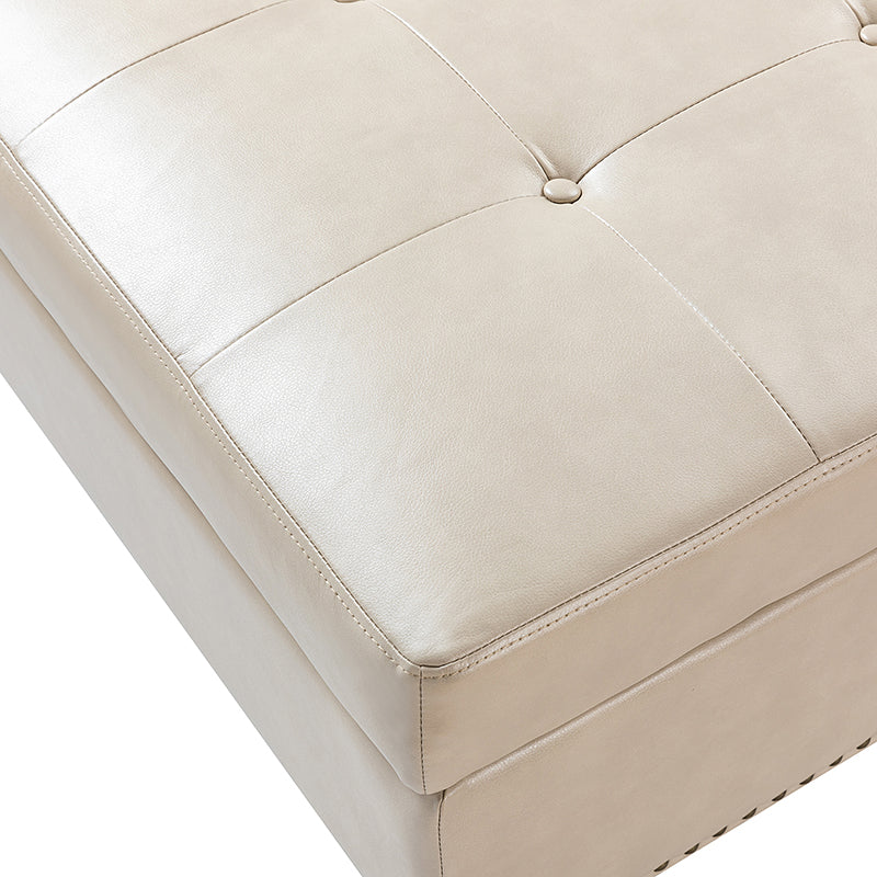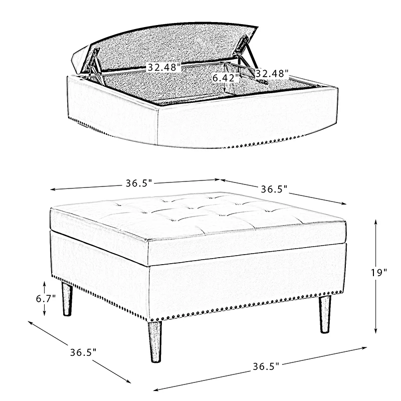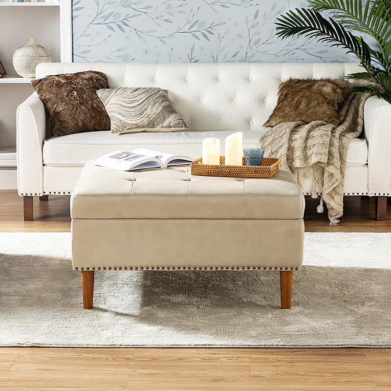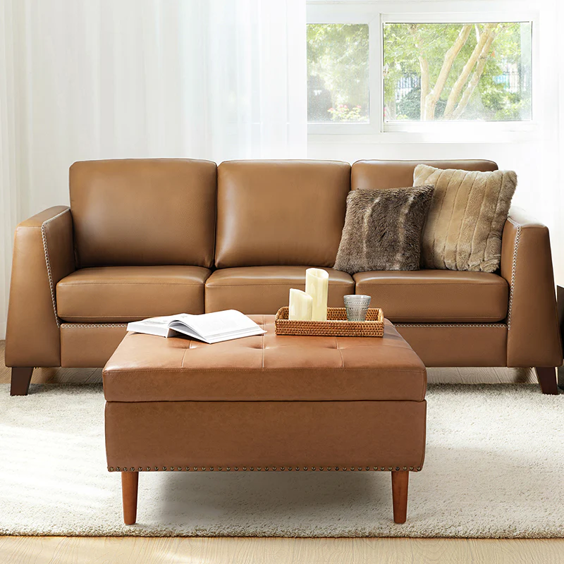 This is a versatile storage ottoman that doubles as a coffee table, featuring mid-century modern style and functionality. It's upholstered with premium vegan leather that's waterproof and resistant to oil stains and has a tufted top with a storage compartment underneath. The fabric is easy to wash which is pet and kid friendly. The ottoman also has four tapered legs and a soft-edged bottom with copper studs. It's the perfect addition to any living space, regardless of your decor style. can be paired with various seating options. Order now to elevate your home decor with this versatile and stylish piece.
