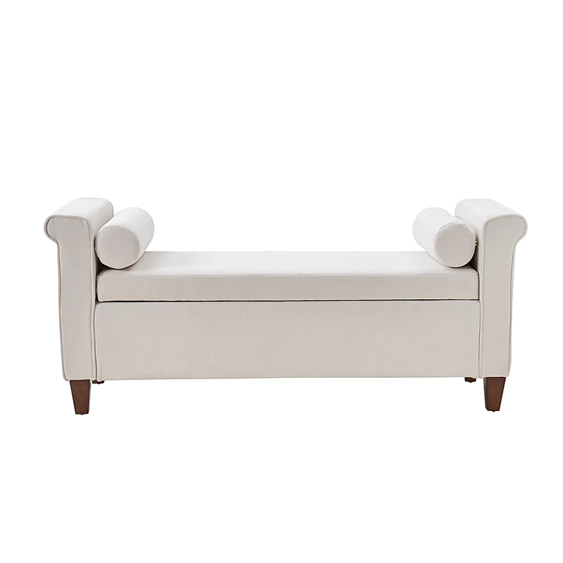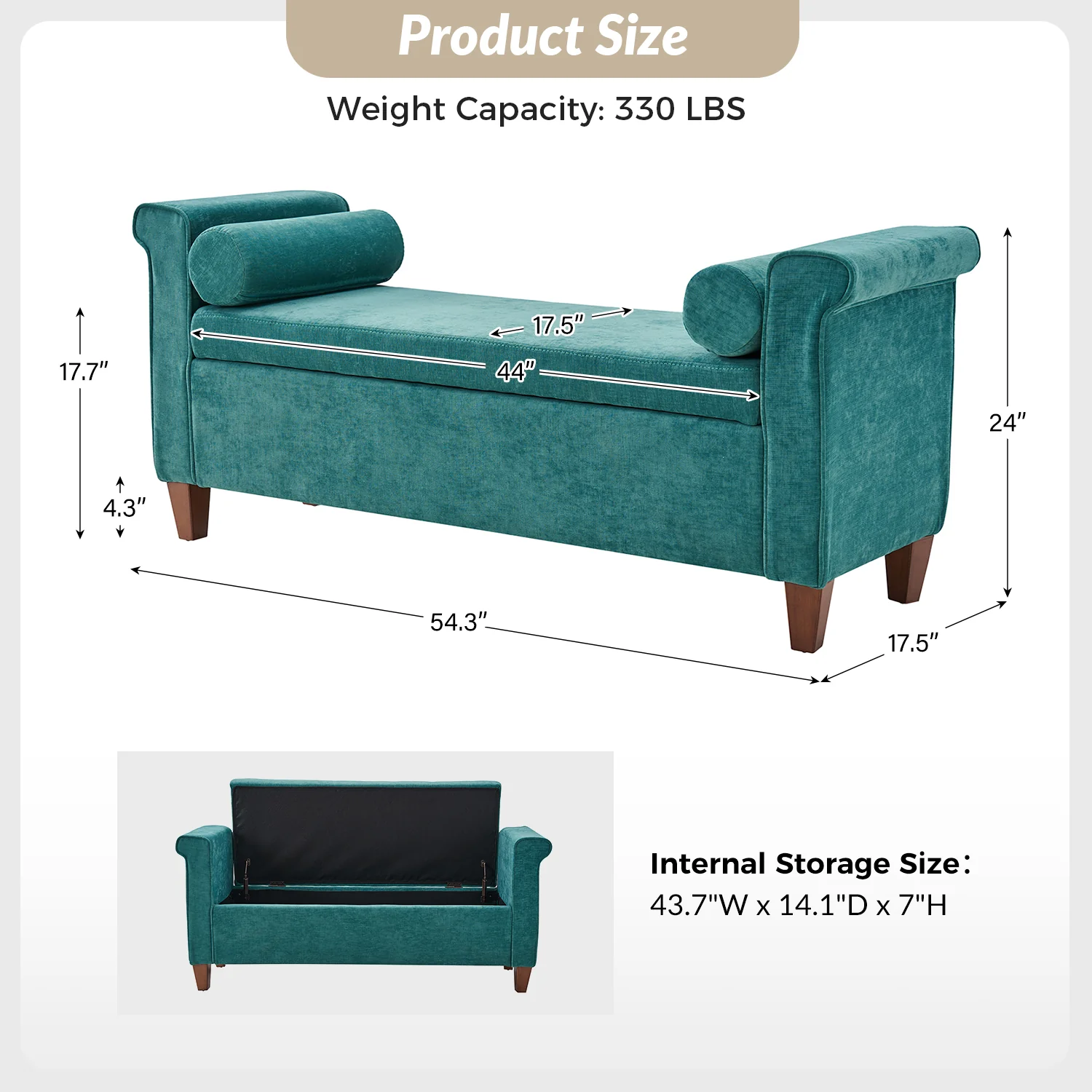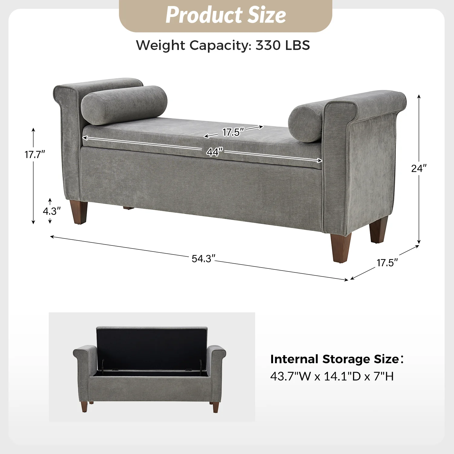 The 54-inch wide storage bench boasts a traditional allure, adorned with a charming armrest in a lovely shade, ensuring it effortlessly complements any decor. The bench not only exudes style but also offers ample storage space within its well-crafted frame. This traditional style bench comes complete with two round pillows, enhancing both comfort and visual appeal. Its versatility knows no bounds, making it a perfect addition to your living room, bedroom, or entryway. Crafted with durability in mind, the bench stands firmly on solid wood legs, adding a touch of sturdiness to its classic charm. Elevate your home with this storage bench that transcends mere functionality, embodying the perfect blend of traditional elegance and contemporary convenience.