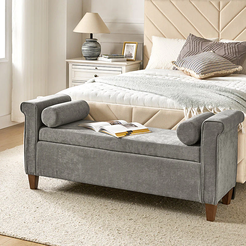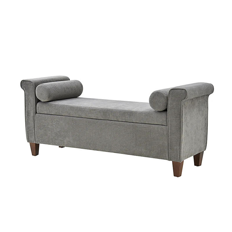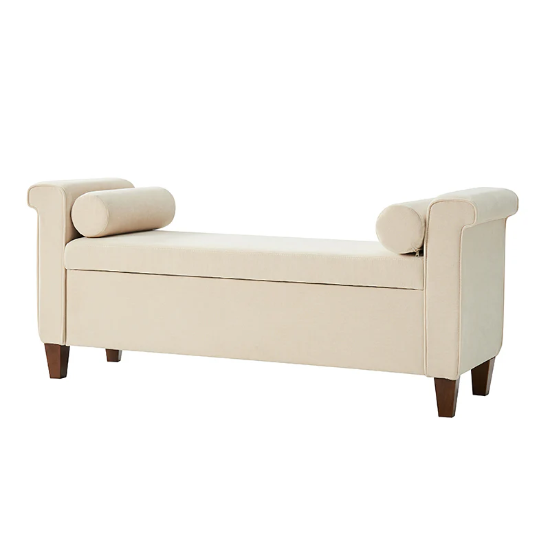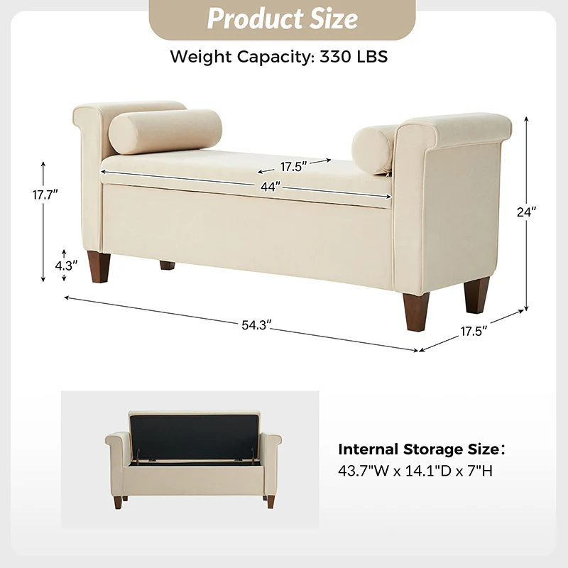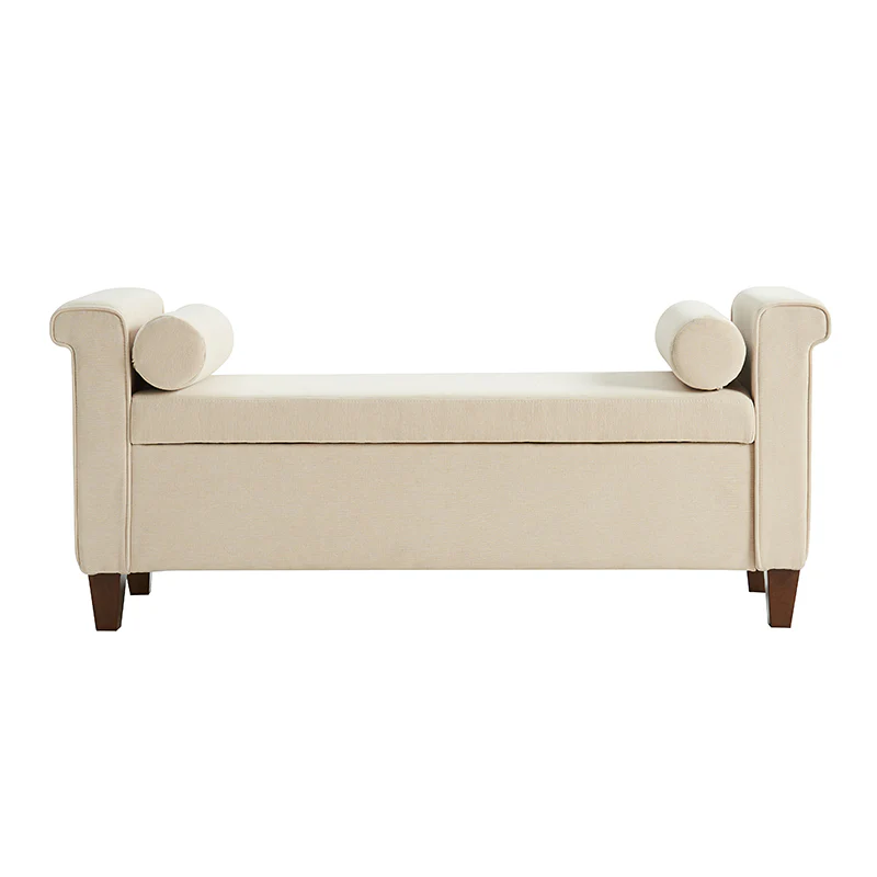 The 54-inch wide storage bench boasts a traditional allure, adorned with a charming armrest in a lovely shade, ensuring it effortlessly complements any decor. The bench not only exudes style but also offers ample storage space within its well-crafted frame. This traditional style bench comes complete with two round pillows, enhancing both comfort and visual appeal. Its versatility knows no bounds, making it a perfect addition to your living room, bedroom, or entryway. Crafted with durability in mind, the bench stands firmly on solid wood legs, adding a touch of sturdiness to its classic charm. Elevate your home with this storage bench that transcends mere functionality, embodying the perfect blend of traditional elegance and contemporary convenience.