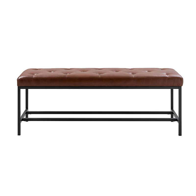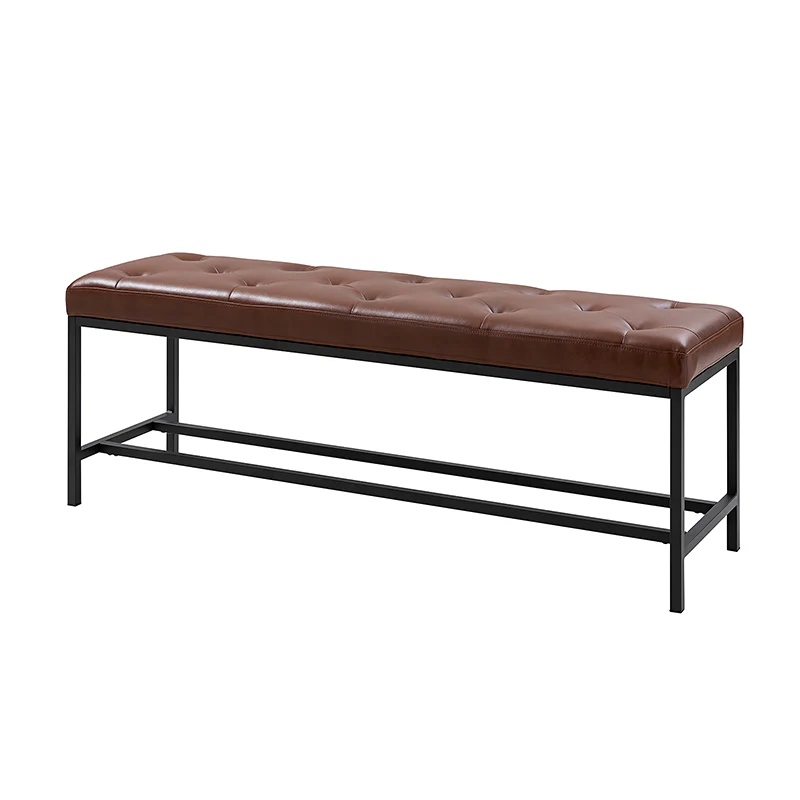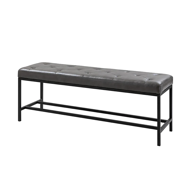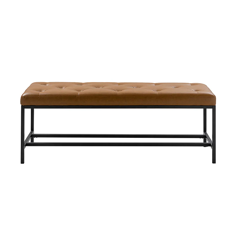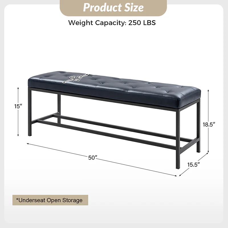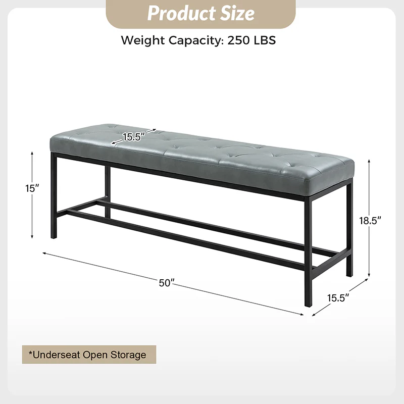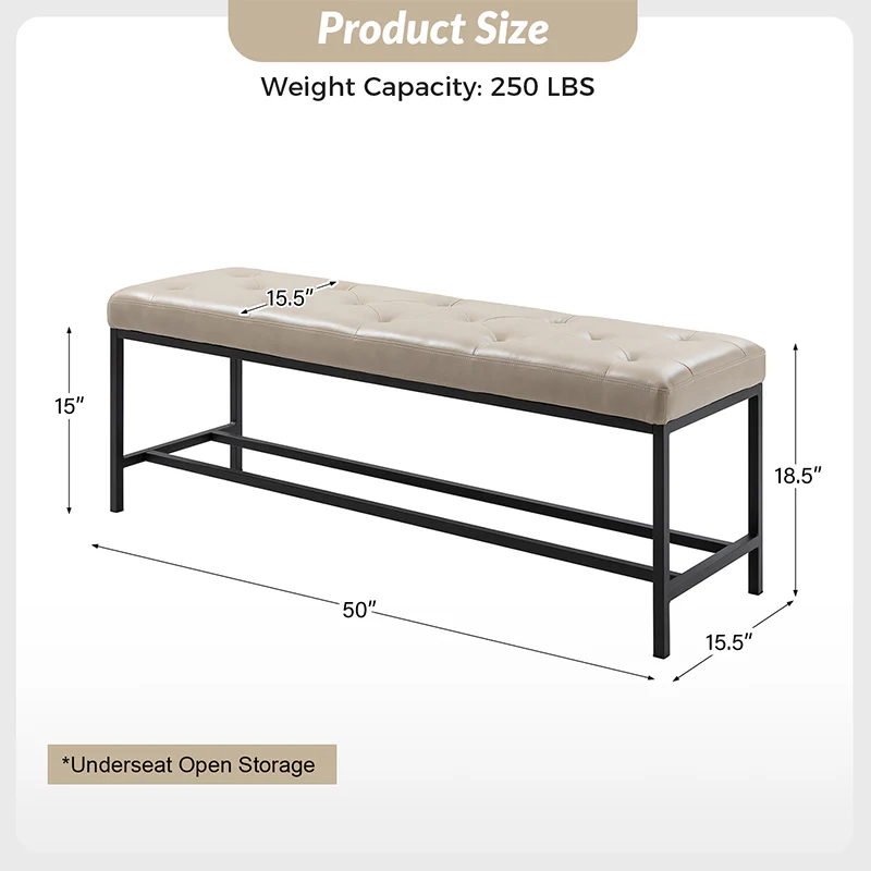 Presenting the epitome of elegance, behold this exquisite bench that flawlessly combines the finest elements of industrial, contemporary, transitional, vintage, and modern styles. Crafted with meticulous precision, its vegan leather upholstery showcases its timeless beauty and ensures effortless cleaning. With its versatile placement options, this bench becomes a dining companion, an end-of-bed luxury, a comfy footrest, or even a makeshift coffee table, adapting effortlessly to your ever-changing needs. The inclusion of a storage shelf adds practicality to its charm, while the button-tufted accents elevate its sophistication. Embrace the ease of maintenance and revel in its multifunctional design, as this remarkable bench enhances your home with its aesthetics and functionality.