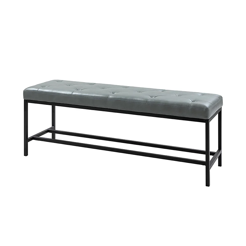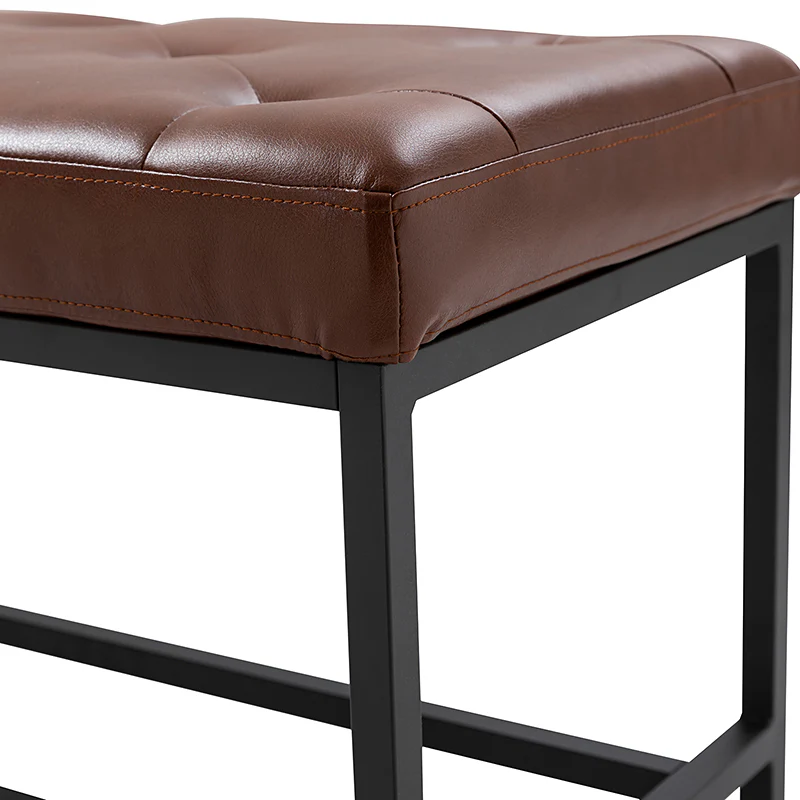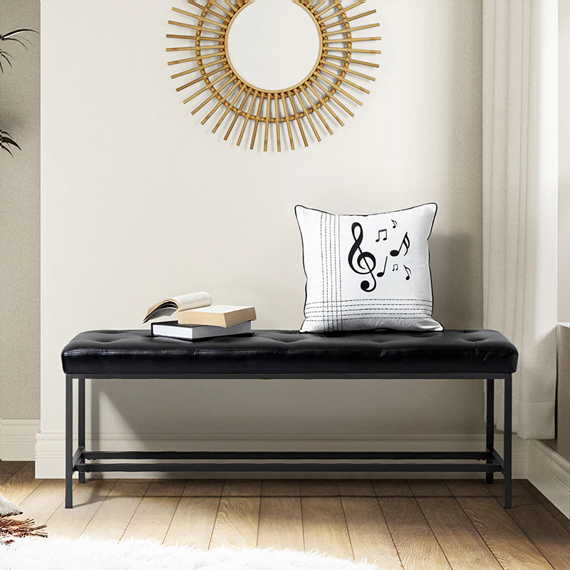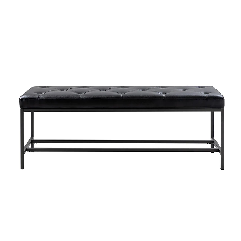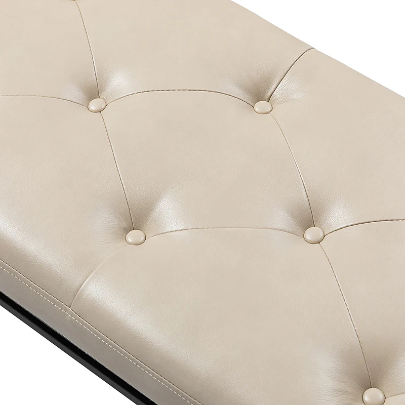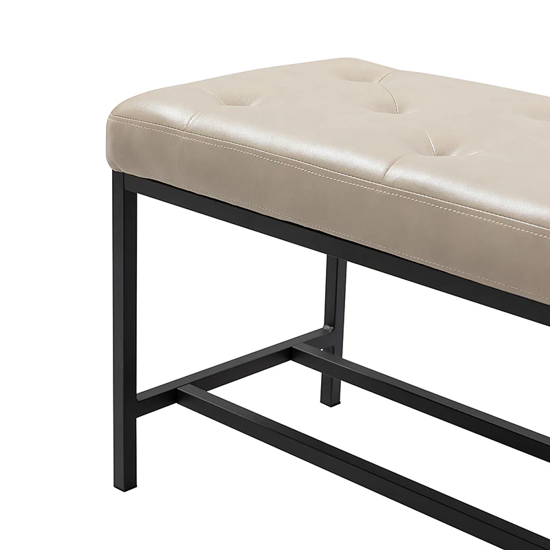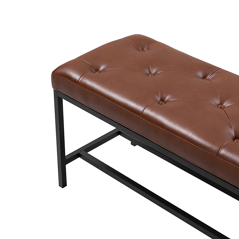 Presenting the epitome of elegance, behold this exquisite bench that flawlessly combines the finest elements of industrial, contemporary, transitional, vintage, and modern styles. Crafted with meticulous precision, its vegan leather upholstery showcases its timeless beauty and ensures effortless cleaning. With its versatile placement options, this bench becomes a dining companion, an end-of-bed luxury, a comfy footrest, or even a makeshift coffee table, adapting effortlessly to your ever-changing needs. The inclusion of a storage shelf adds practicality to its charm, while the button-tufted accents elevate its sophistication. Embrace the ease of maintenance and revel in its multifunctional design, as this remarkable bench enhances your home with its aesthetics and functionality.
