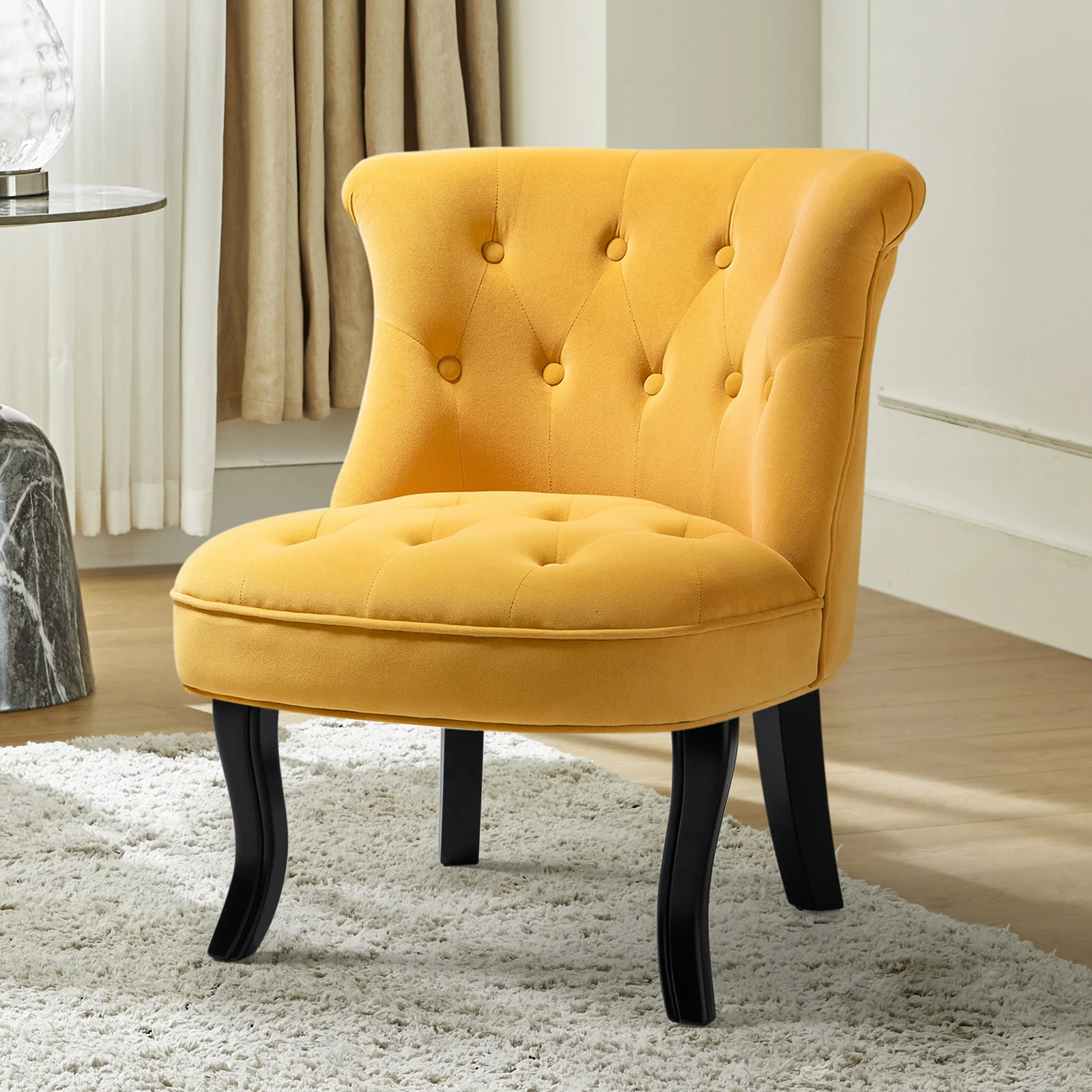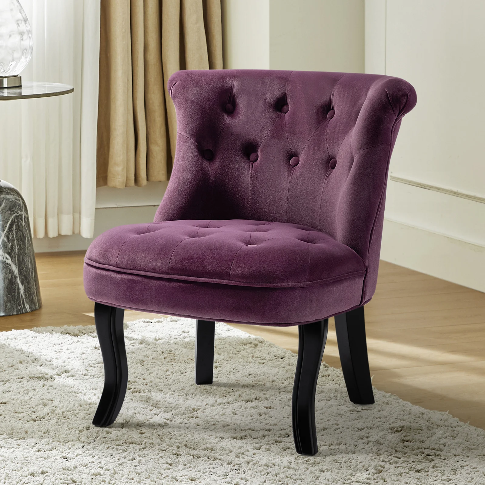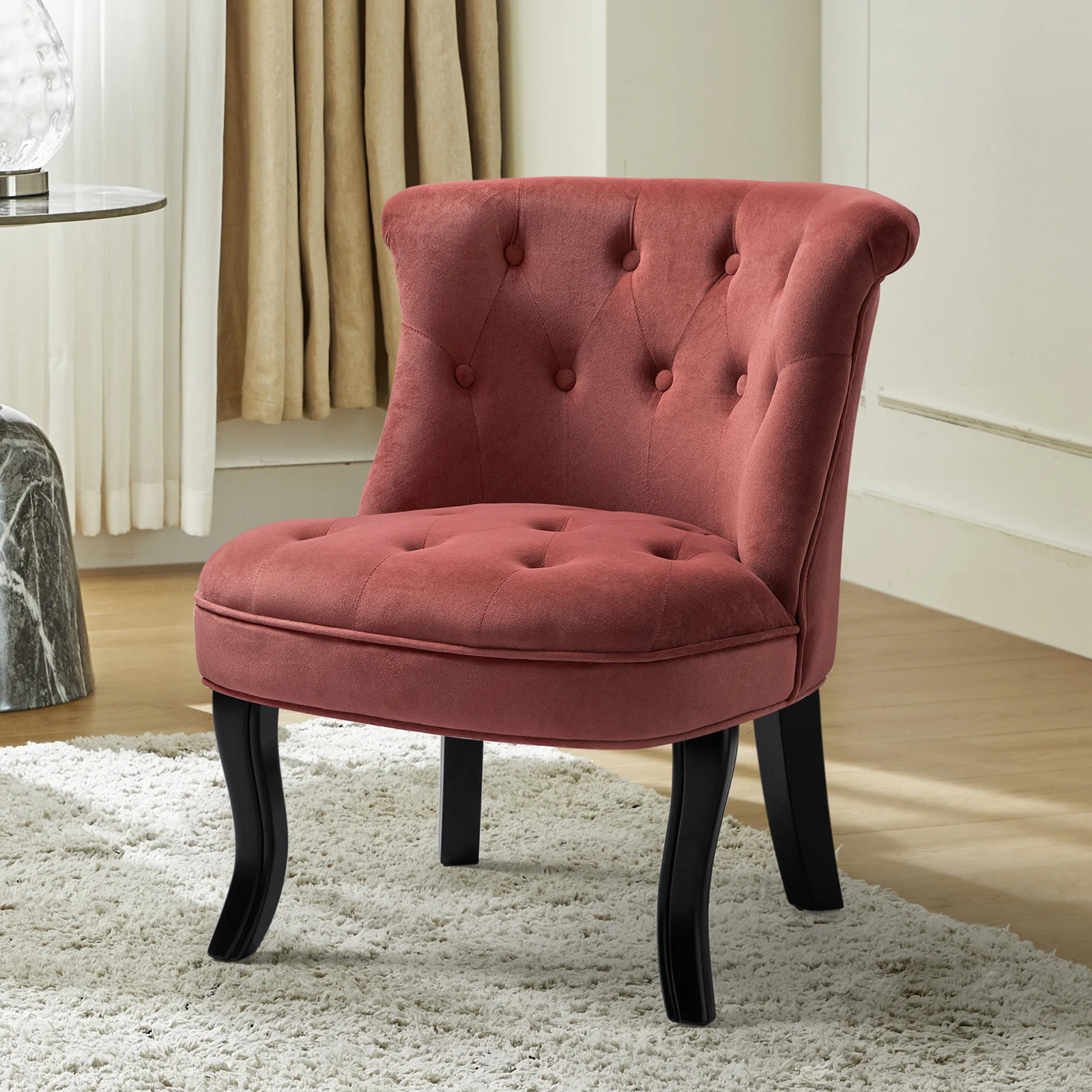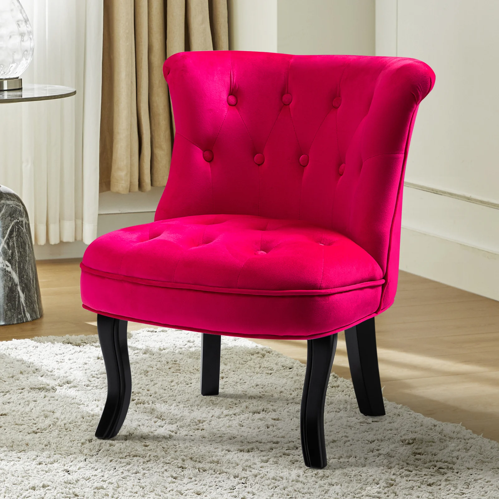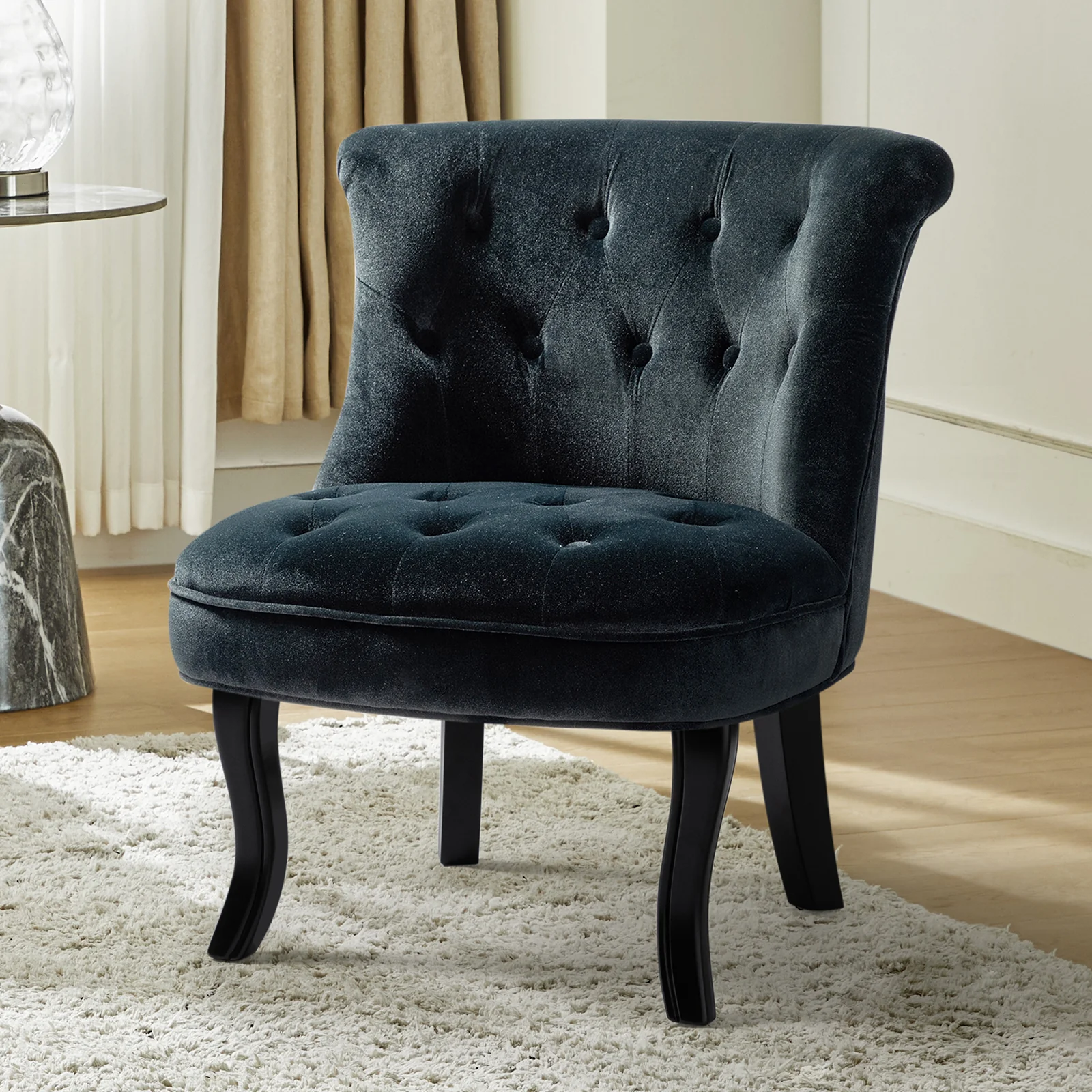 Add a pop of color with this side chair. Sitting atop briarwood legs, the velvet upholstered chair is functional and decorative. This small accent chair features a lovely tufted fabric on the seat and back, perfect for any design aesthetic. This chair can be placed in any room or office space.
