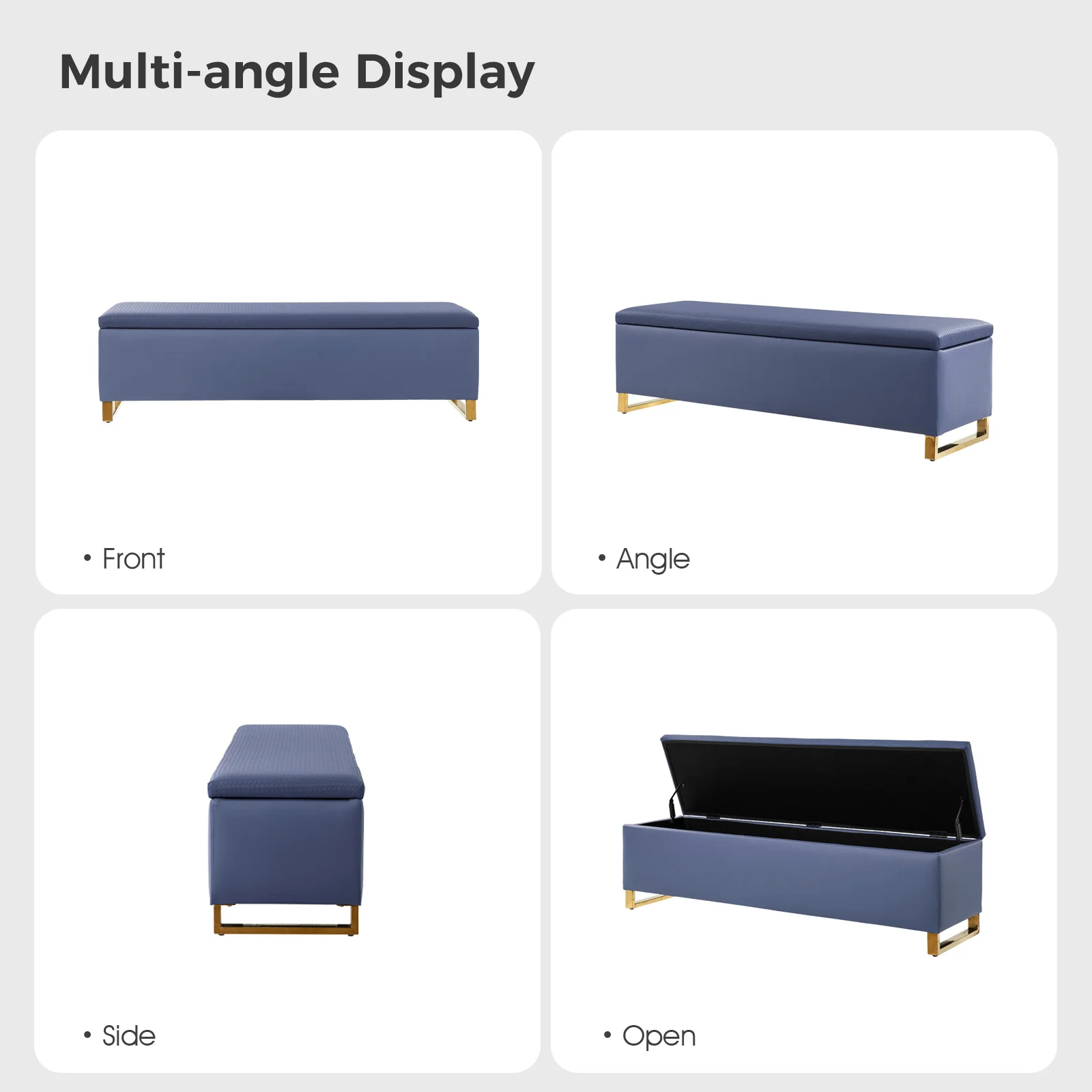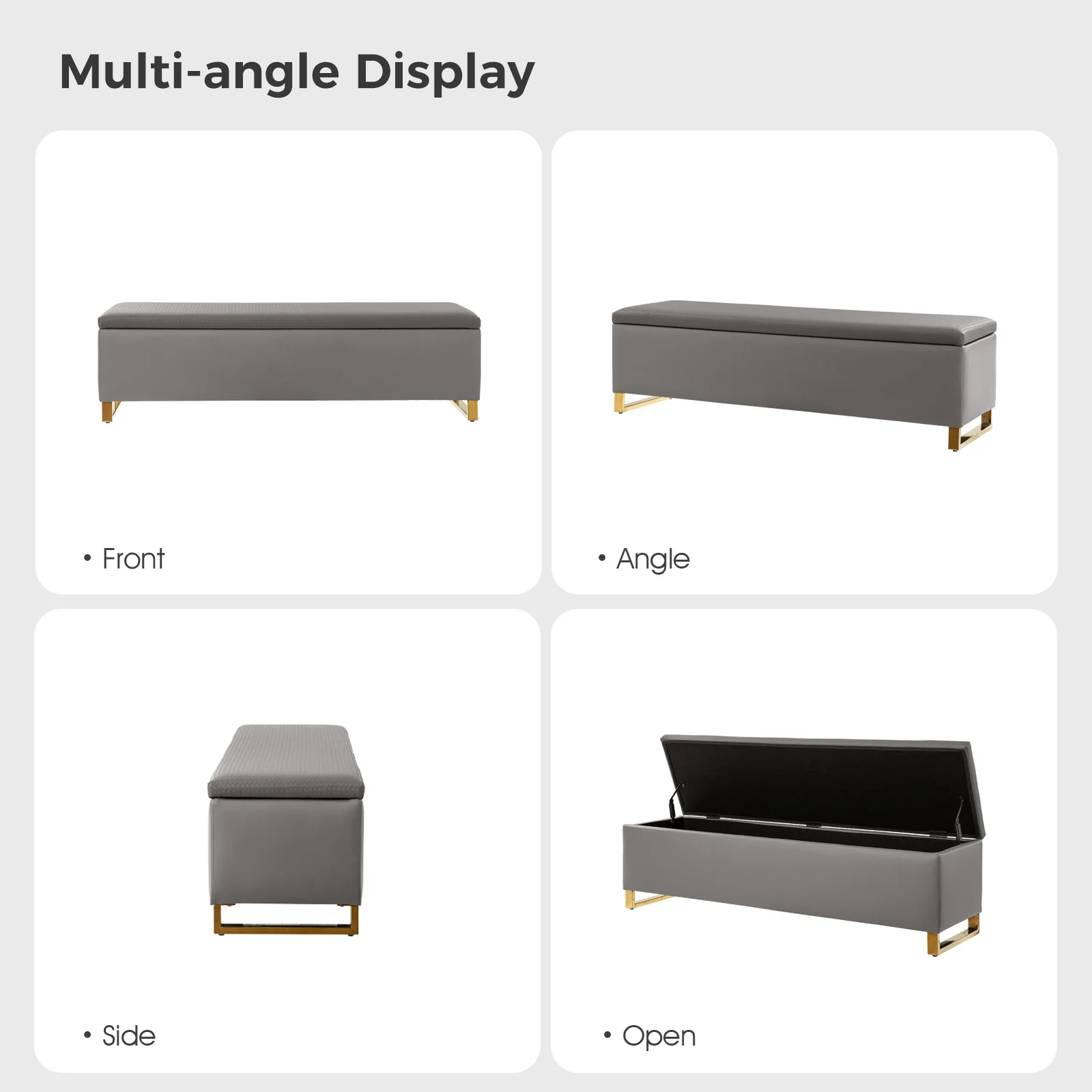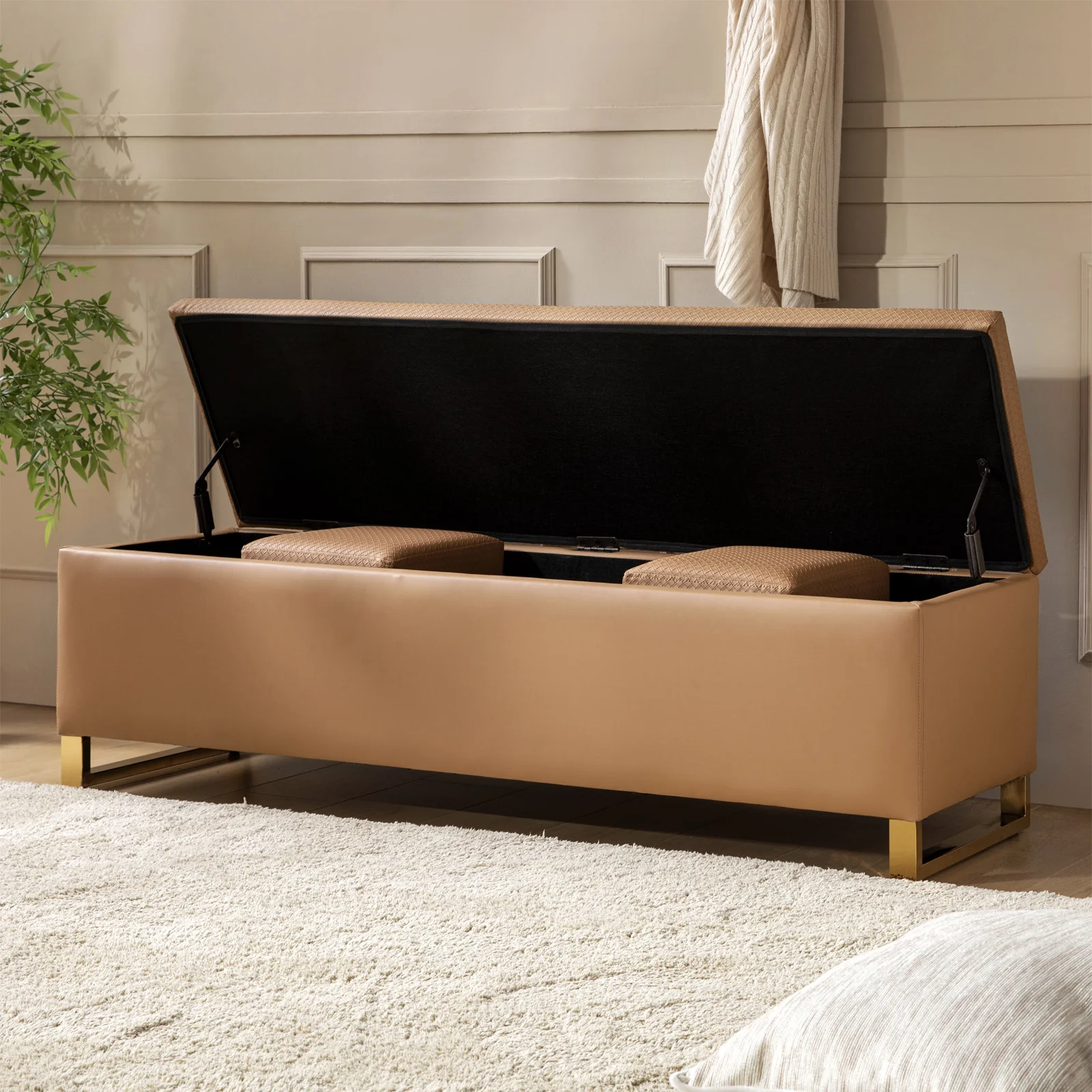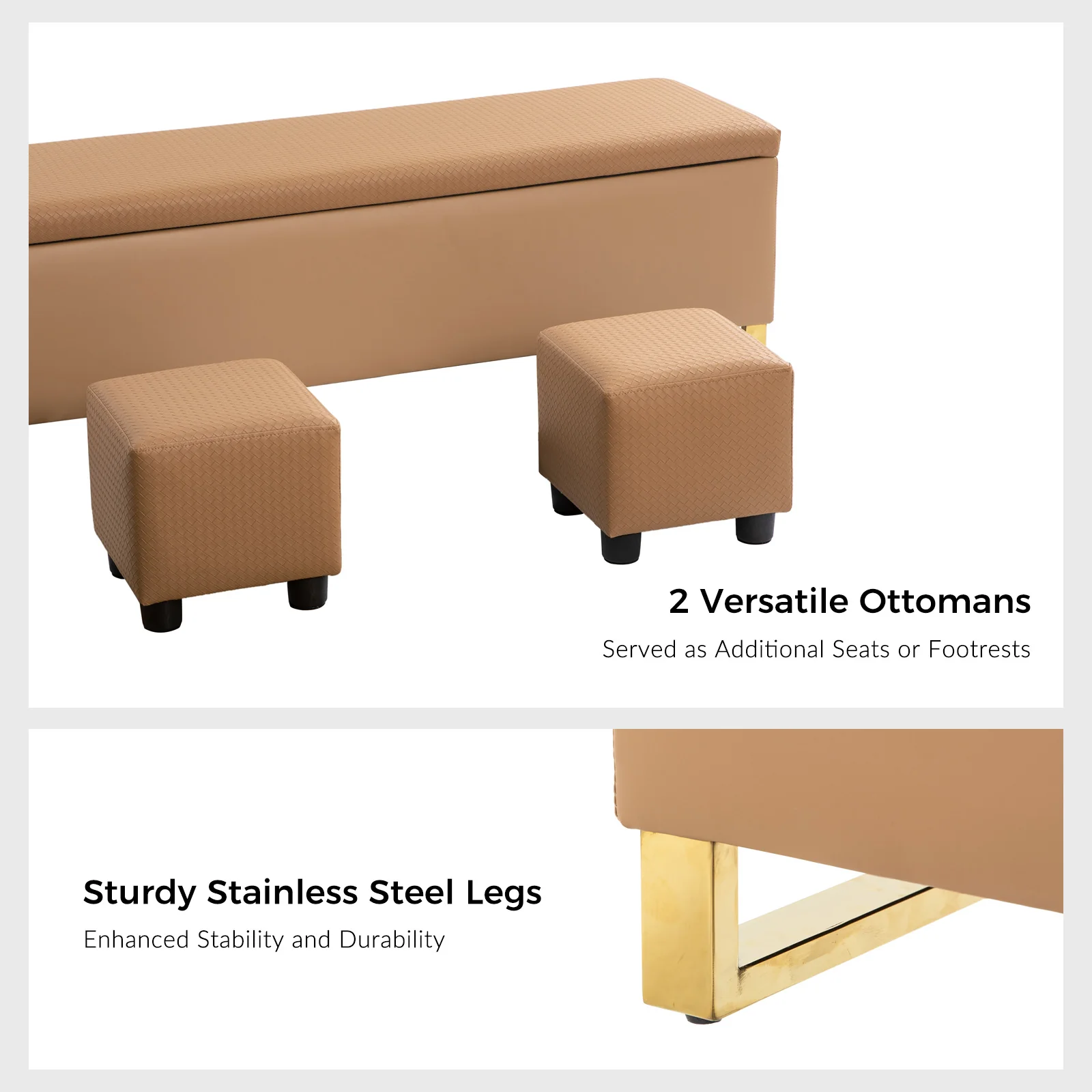 This elegant storage bench combines functionality with style, making it an addition to your room. The bench features a spacious compartment beneath the seat, suitable for storing blankets, pillows, or other household items, helping you keep your space tidy and organized. Included are two small ottomans, conveniently tucked away when not in use, and are perfect for additional seating or as footrests. The bench stands on sturdy stainless steel electroplated legs, adding a touch of modern sophistication and ensuring durability. The seat cushion is crafted with a diamond weave pattern, offering a unique and stylish texture. Its rectangular shape provides ample seating space, while the comfortable padding ensures a pleasant sitting experience. Whether placed in a living room, bedroom, or hallway, this storage bench enhances the decor and adds practical storage and seating solutions to your living space.