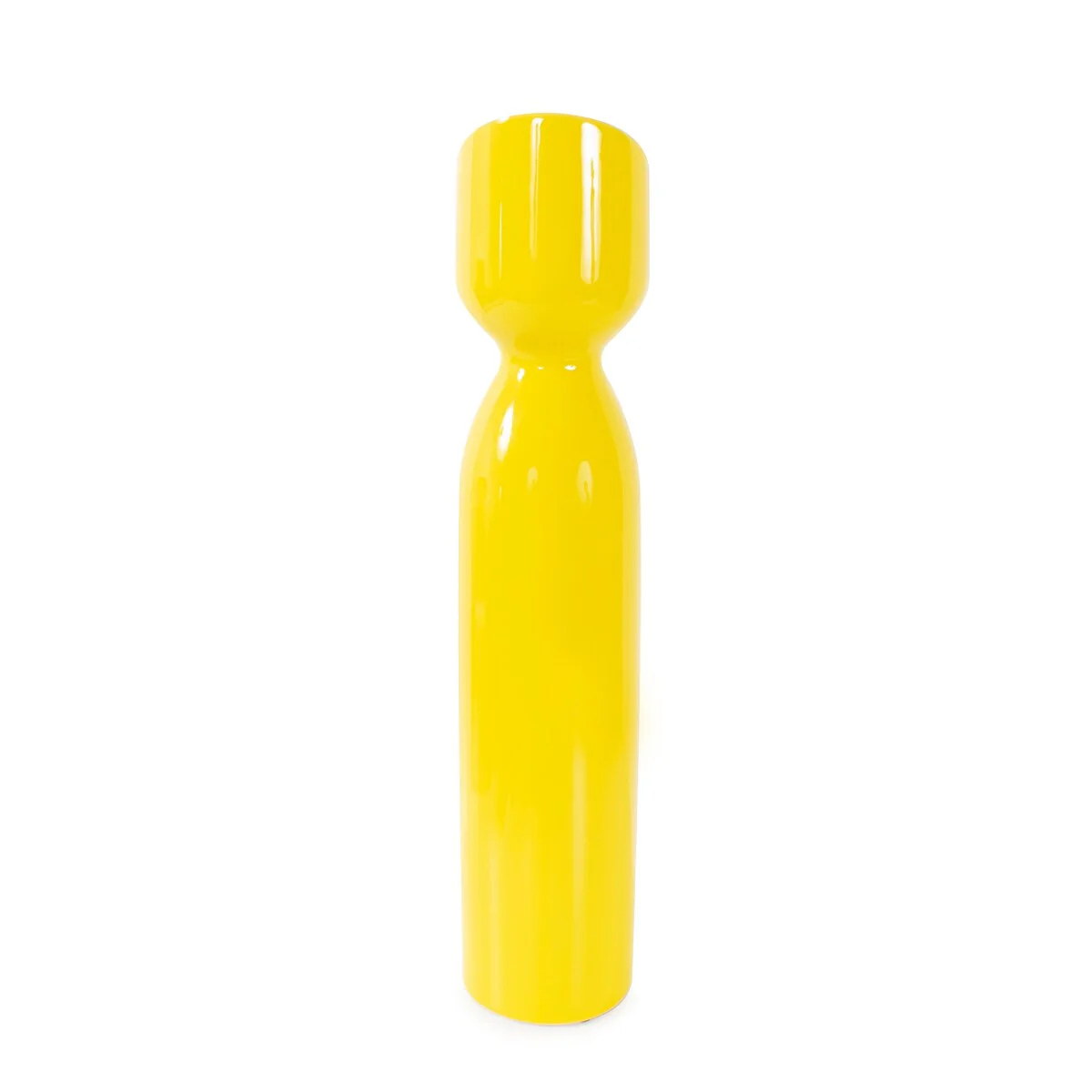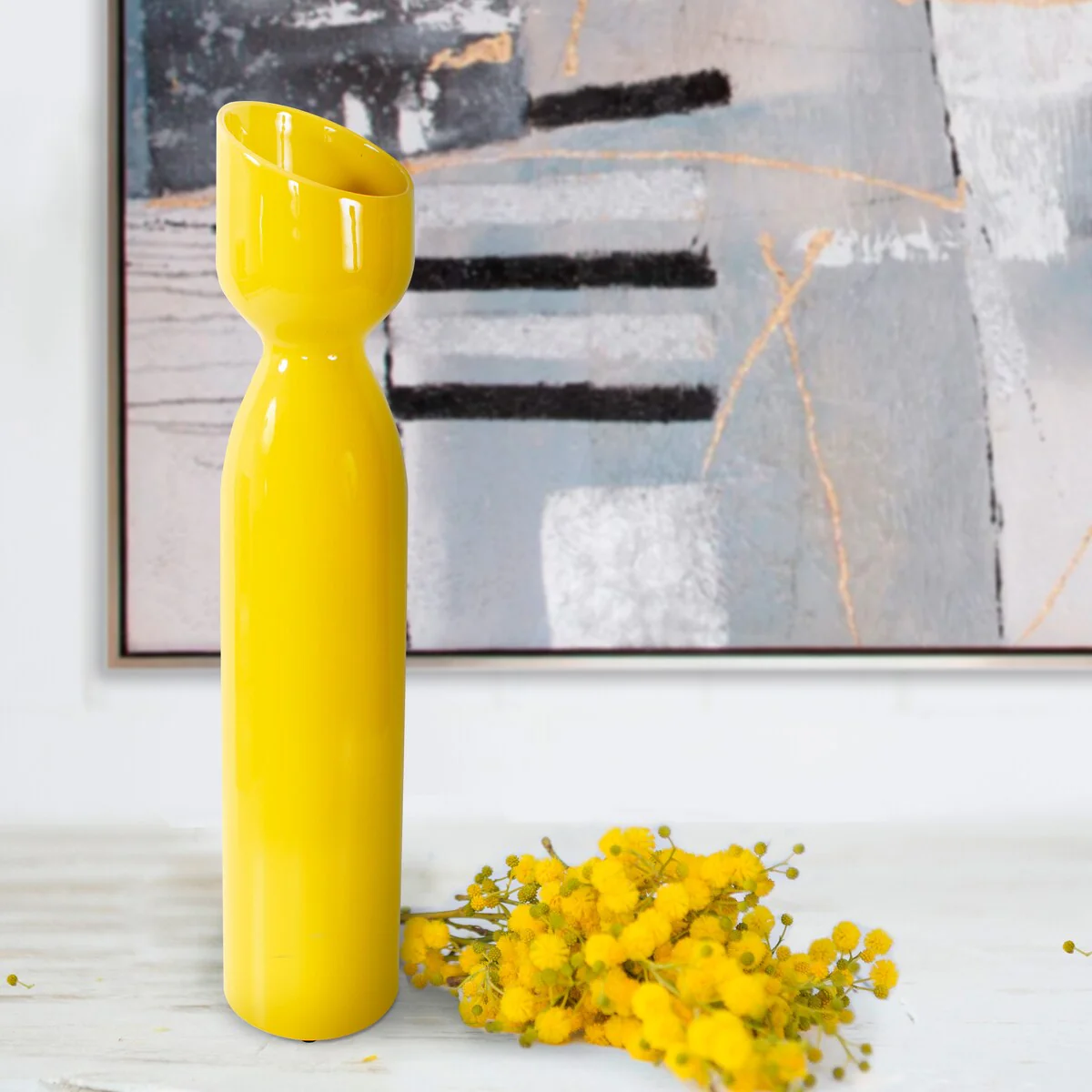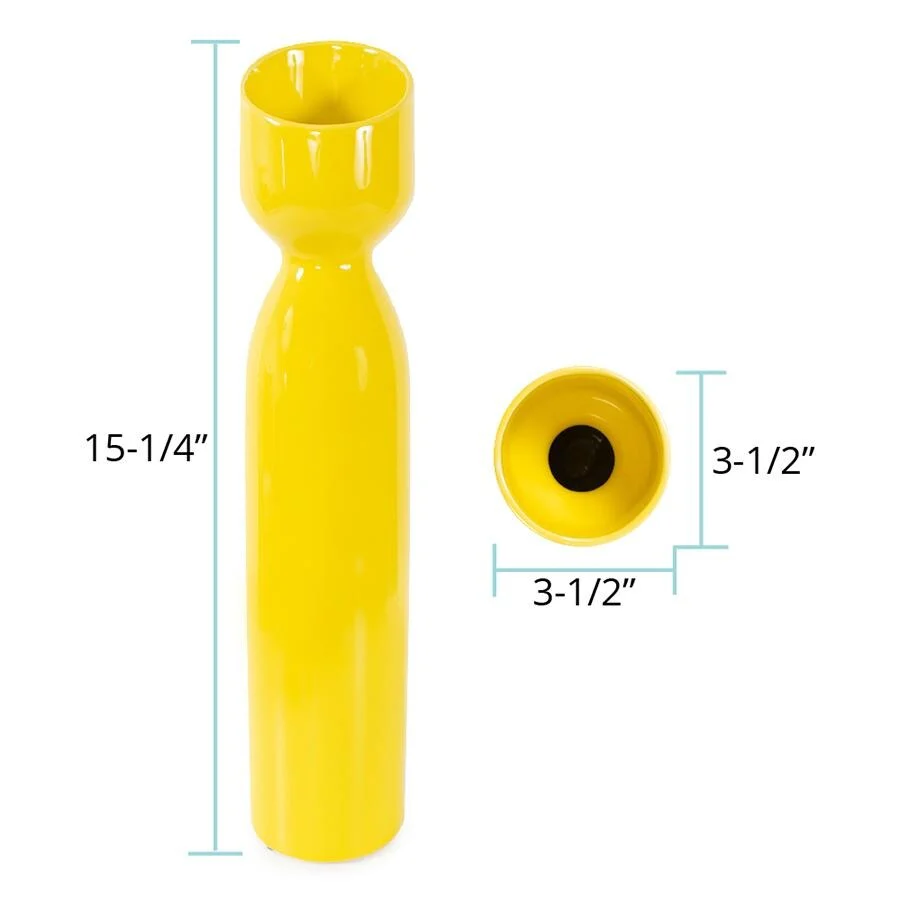 Introducing a striking and contemporary addition to your d茅cor that radiates positivity and energy. This unique vase provides versatility for various spaces and design needs. Its bold hue of bright yellow instantly captures attention, injecting a cheerful spirit into any room. Its distinctive slanted top, adds a modern twist to its classic form. Whether showcasing a single bold bloom or serving as a standalone statement piece, this vase elevates your interior with its dynamic color and innovative design.