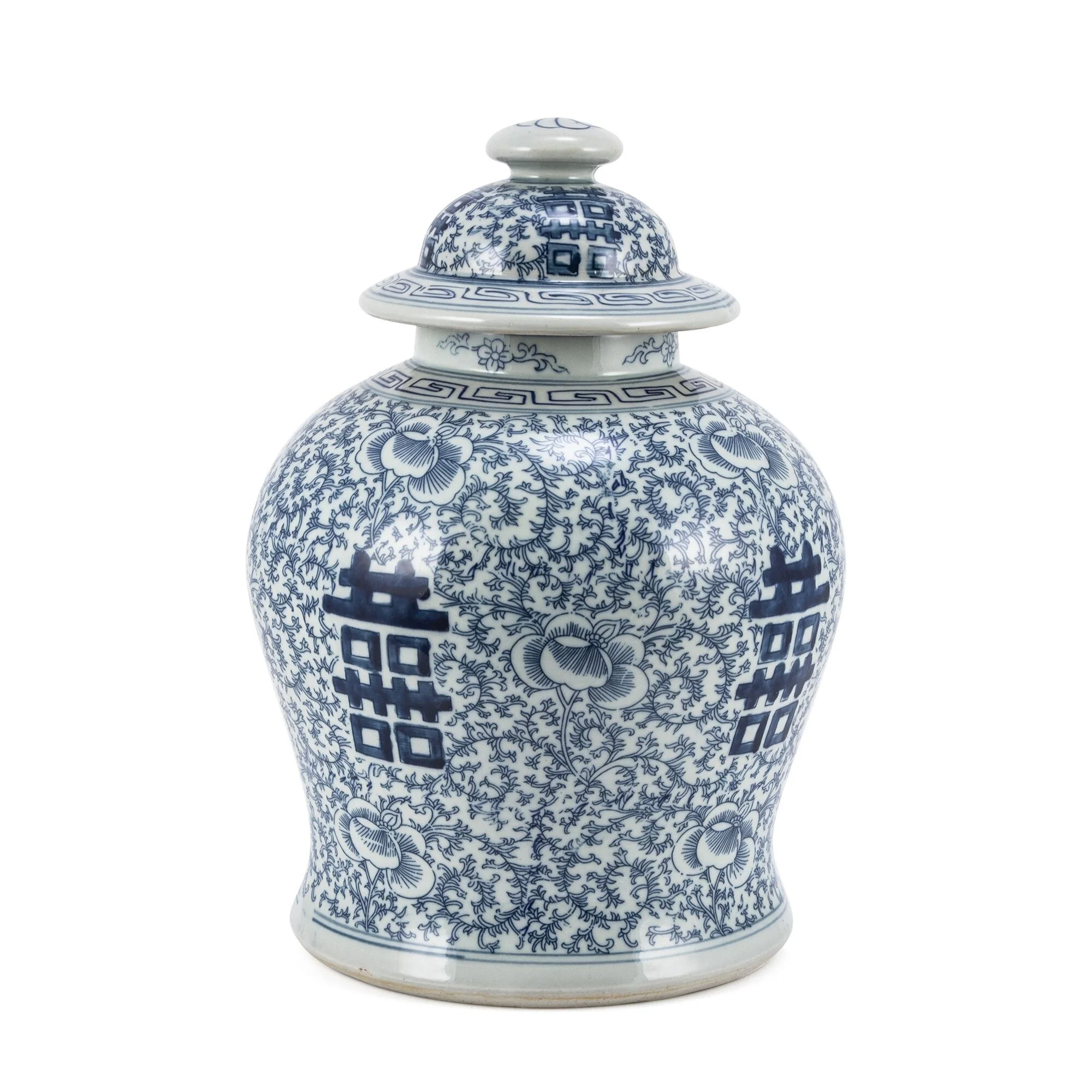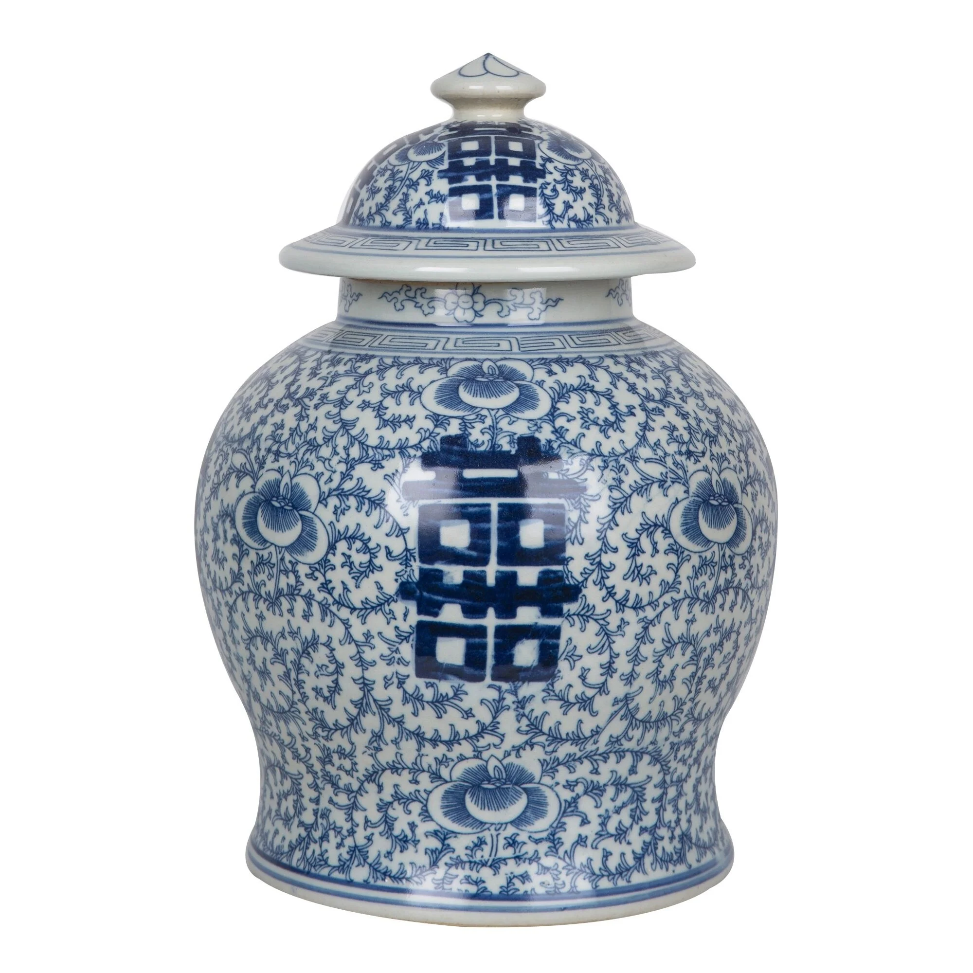 Blue and White Double Happiness Floral Temple Jar - SmallThe special antique process makes it looks like a piece of art from a museum. High fire porcelain, 100% hand shaped, hand painted. Square shape is never perfect. Distress, chips and other imperfections create great characters of this special vintage style porcelain temple jar. From a small town Jingdezhen in the southern part of China, where ceramic and porcelain were originated 5000 years ago. It is known as the capital of ceramics.