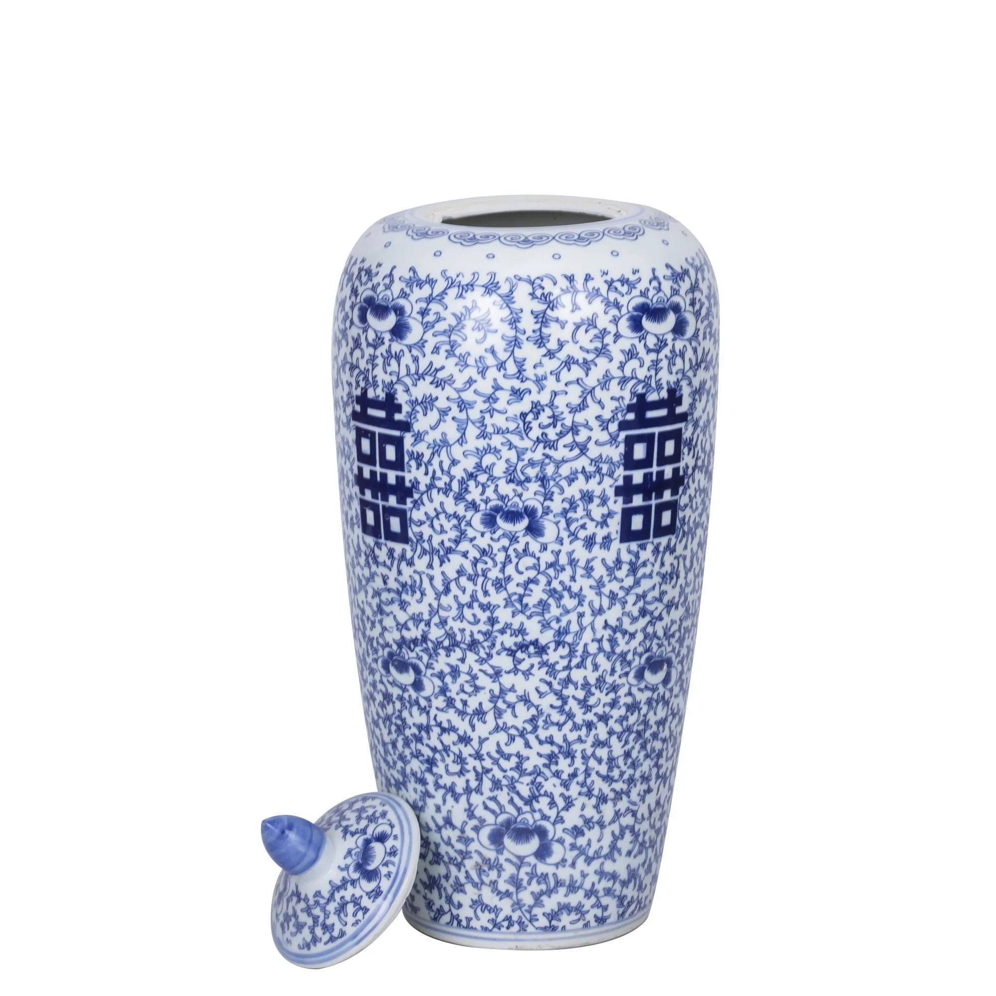 Add a touch of elegance and sophistication to any room with this Blue and White Floral Double Happiness Tall Ginger Jar. Handcrafted from high fire porcelain, each piece is 100% hand shaped and hand painted using a special antique process that makes it look like a museum-worthy work of art. The square shape of the jar is intentionally imperfect, with distress, chips, and other imperfections that add to the unique vintage style. Originating from Jingdezhen, the capital of ceramics in southern China, this temple jar is a true testament to the rich heritage and craftsmanship of porcelain.