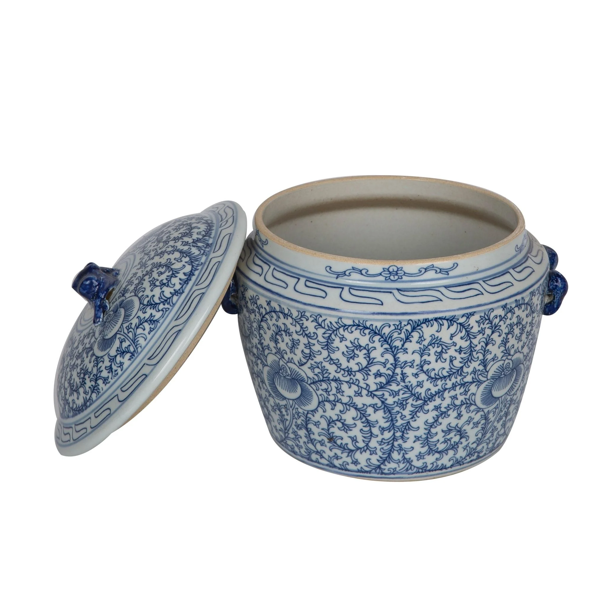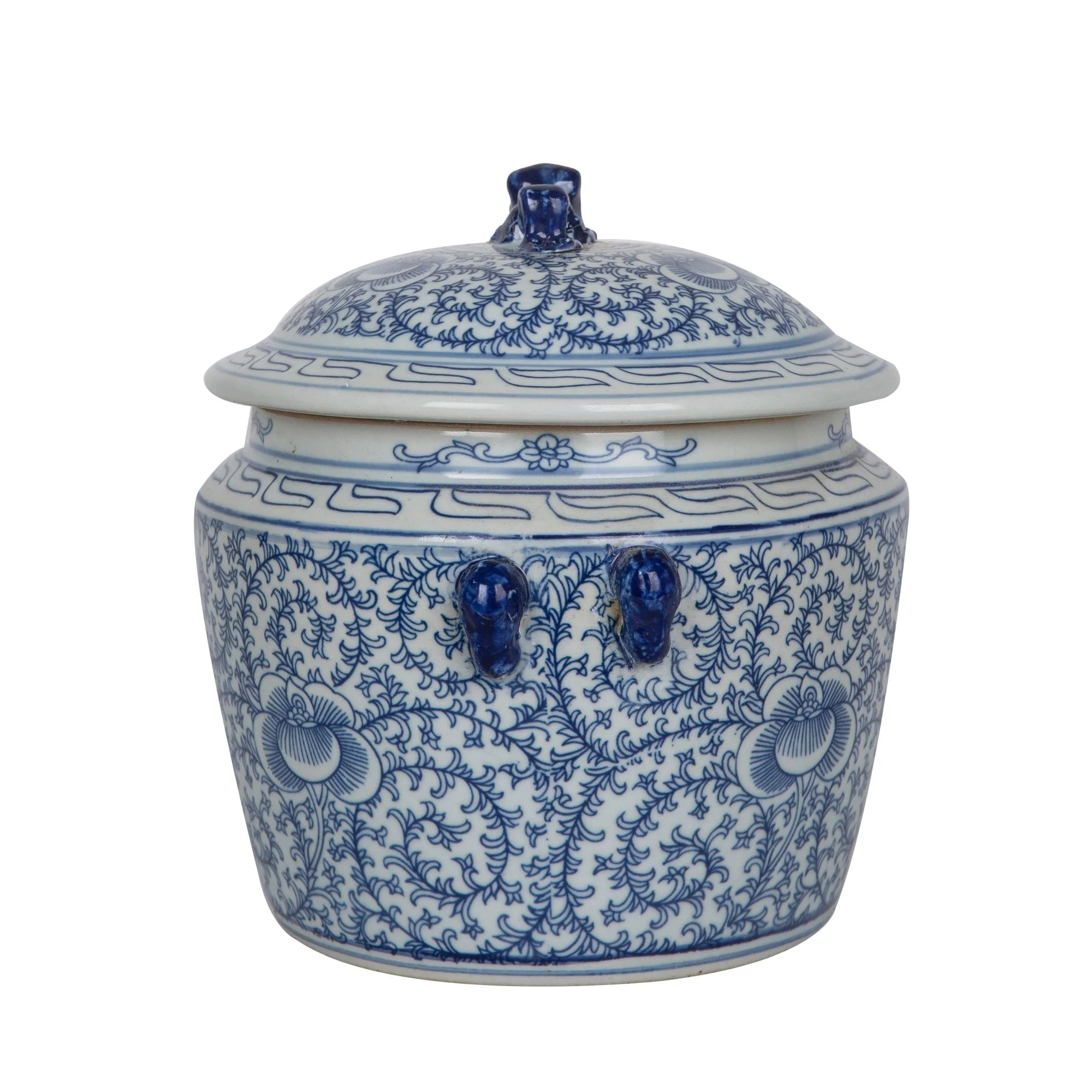 This Blue and White Lidded Rice Jar with a Floral Motif is a stunning piece of art, made using a special antique process that gives it an authentic museum-like appearance. Crafted from high-fire porcelain, it is 100% hand-shaped and hand-painted, showcasing the unique imperfections that come with vintage-style porcelain. This square-shaped jar is full of character, with distress, chips, and other charming irregularities that add to its charm. Made in Jingdezhen, a small town in southern China known as the capital of ceramics for 5,000 years.