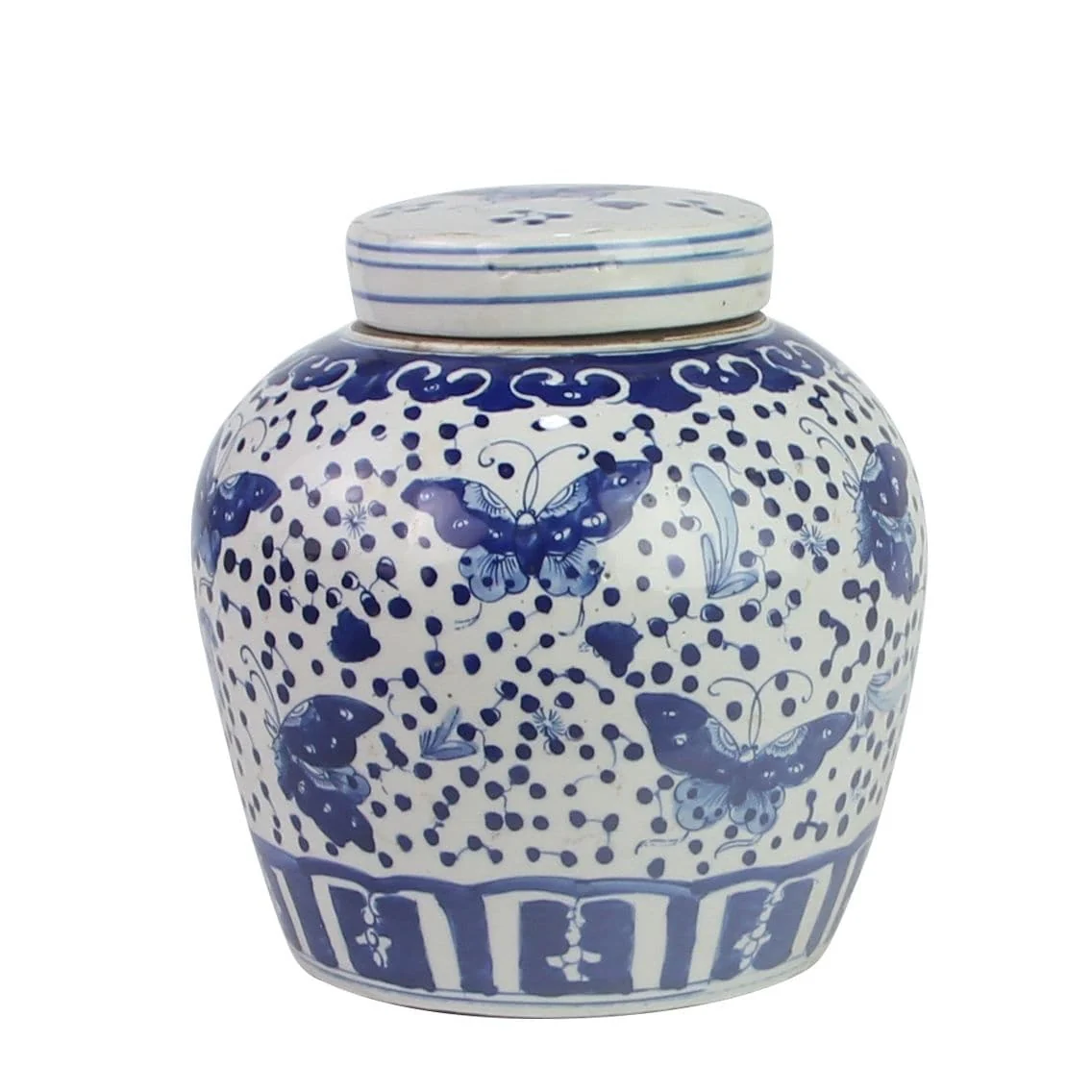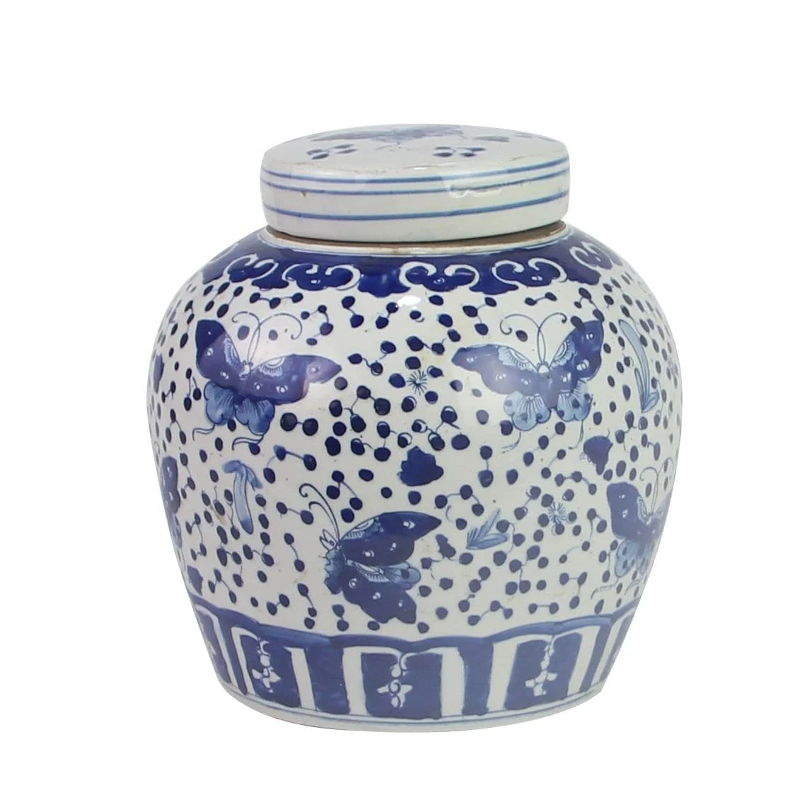 Blue And White Ming Jar Butterfly Dots. High fire porcelain, hand shaped, hand painted. Made from the region where ceramic and porcelain was invented, a small town in southern China, known as the Capital of Ceramic. Hand crafted item, minor shape, size, finish variation is expected, it is part of the character. Can be used in-door or out-door, water proof, weather proof.