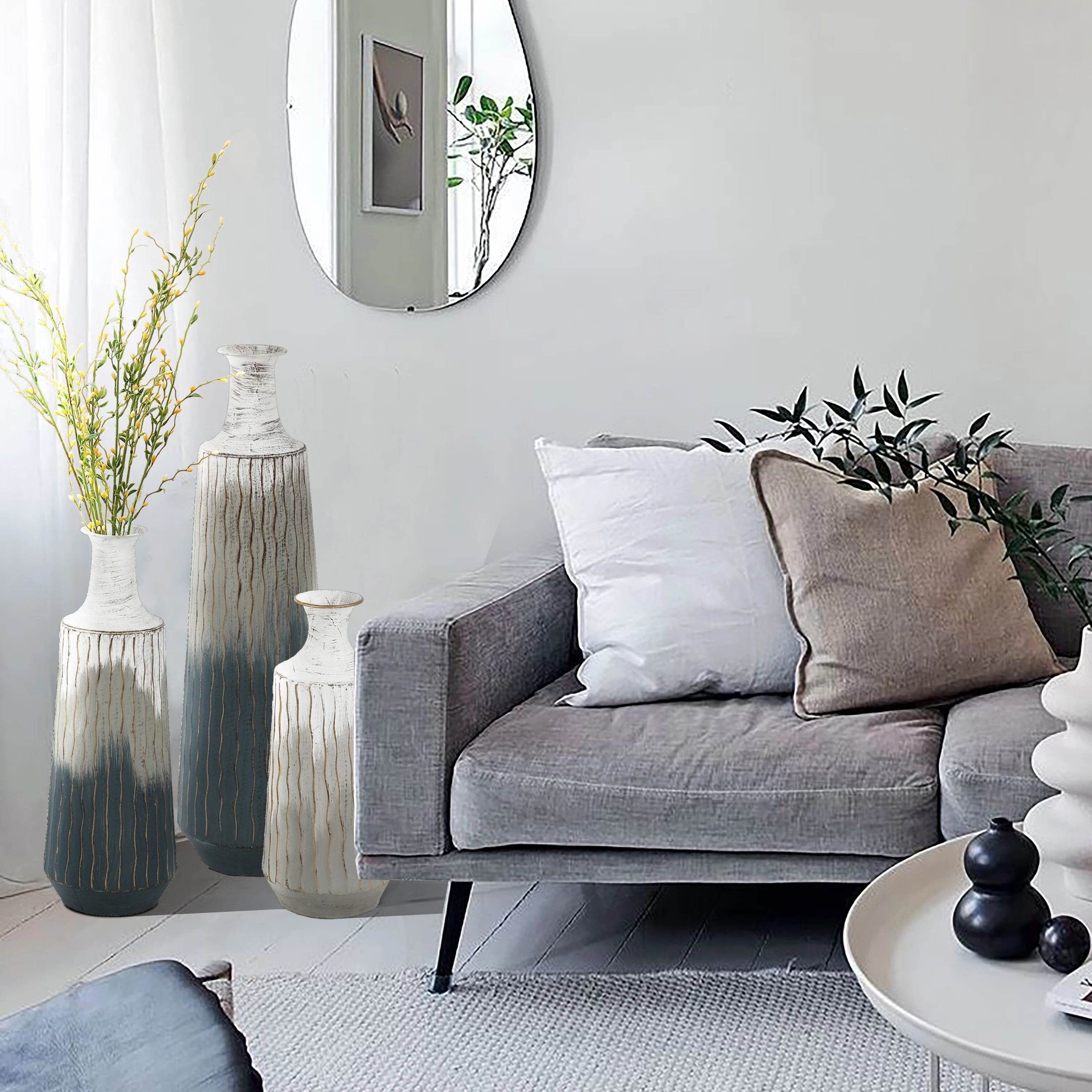 Add a touch of modern elegance to your decor with this set of three handcrafted metal bottle vases. Featuring a beautiful ombre distressed blue, gray, and white design with gold highlights, these vases make a stunning statement in any room. The tapered shape and fluted bud opening of each vase add a unique touch to your floor or tabletop display. These vases are perfect for displaying dried or faux flowers and come in three different sizes for a complete look. Whether you group them together or place them separately, these vases are sure to add depth and height to your decor.