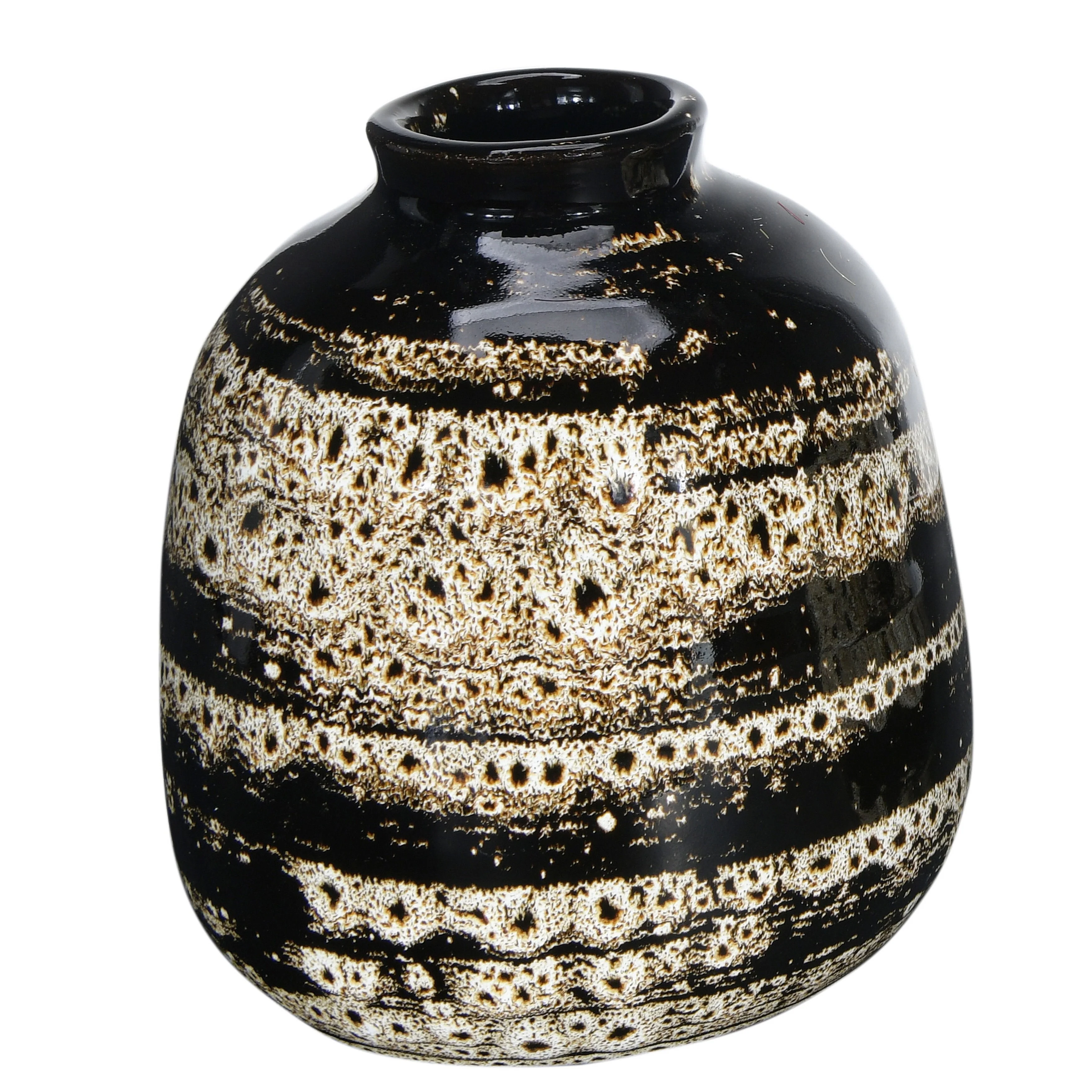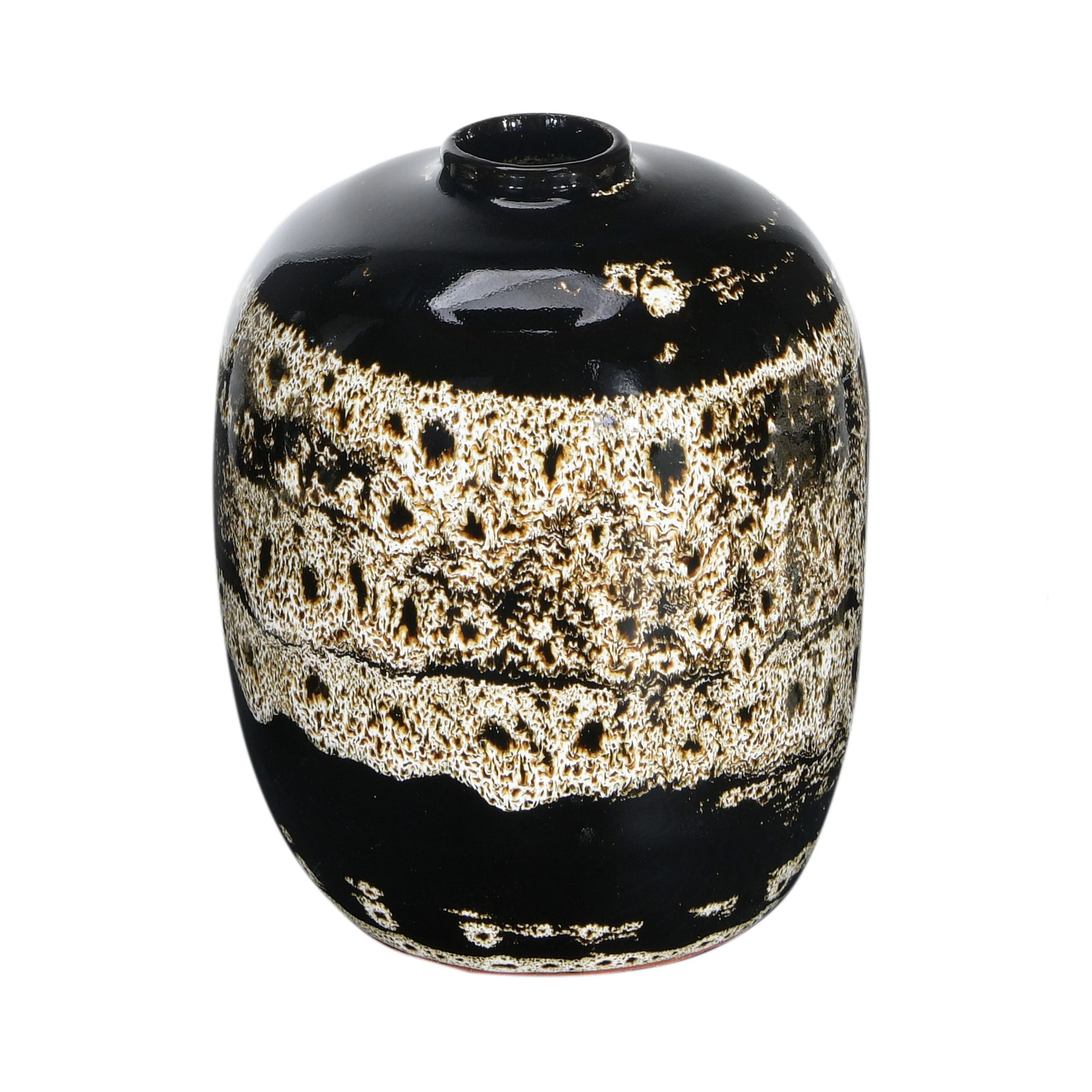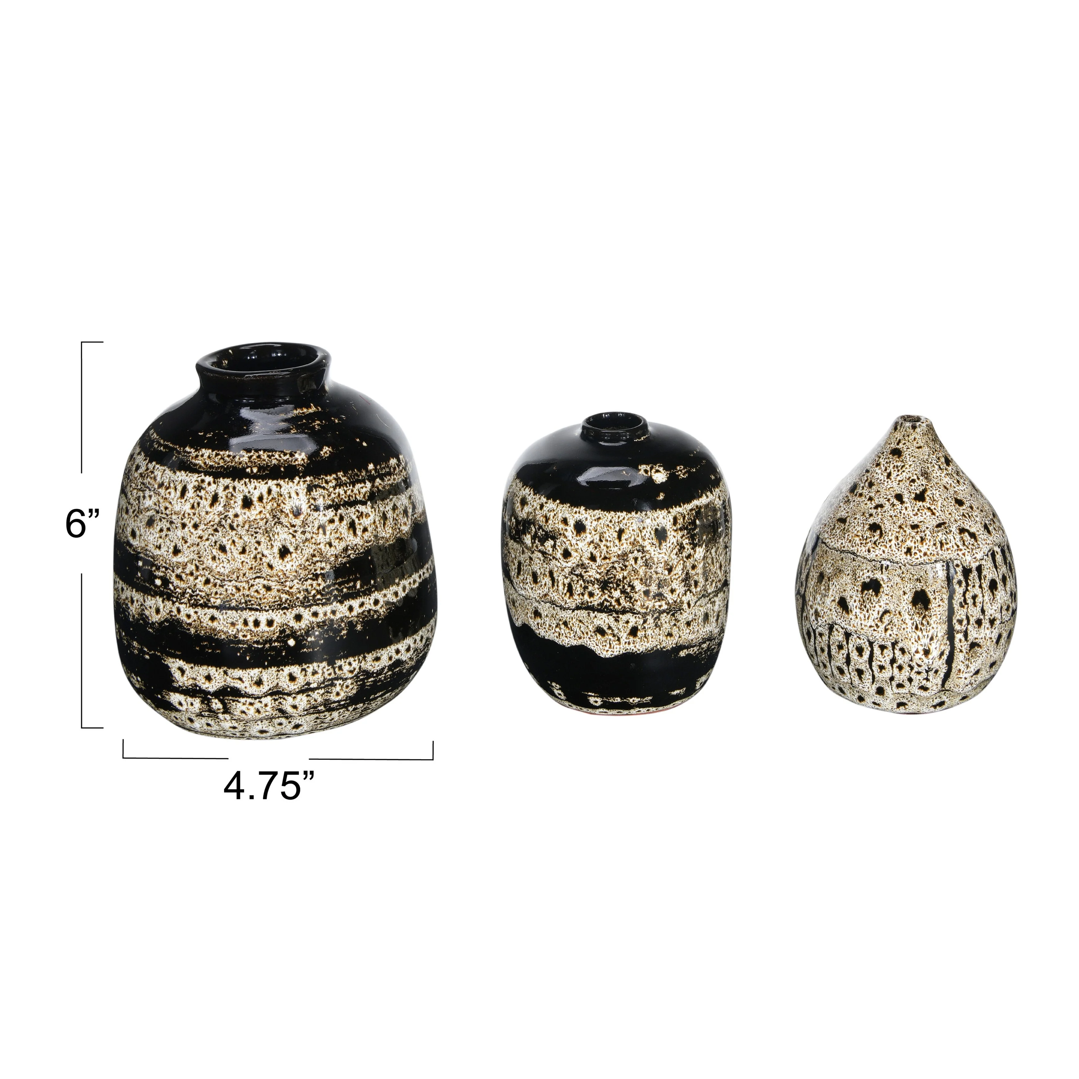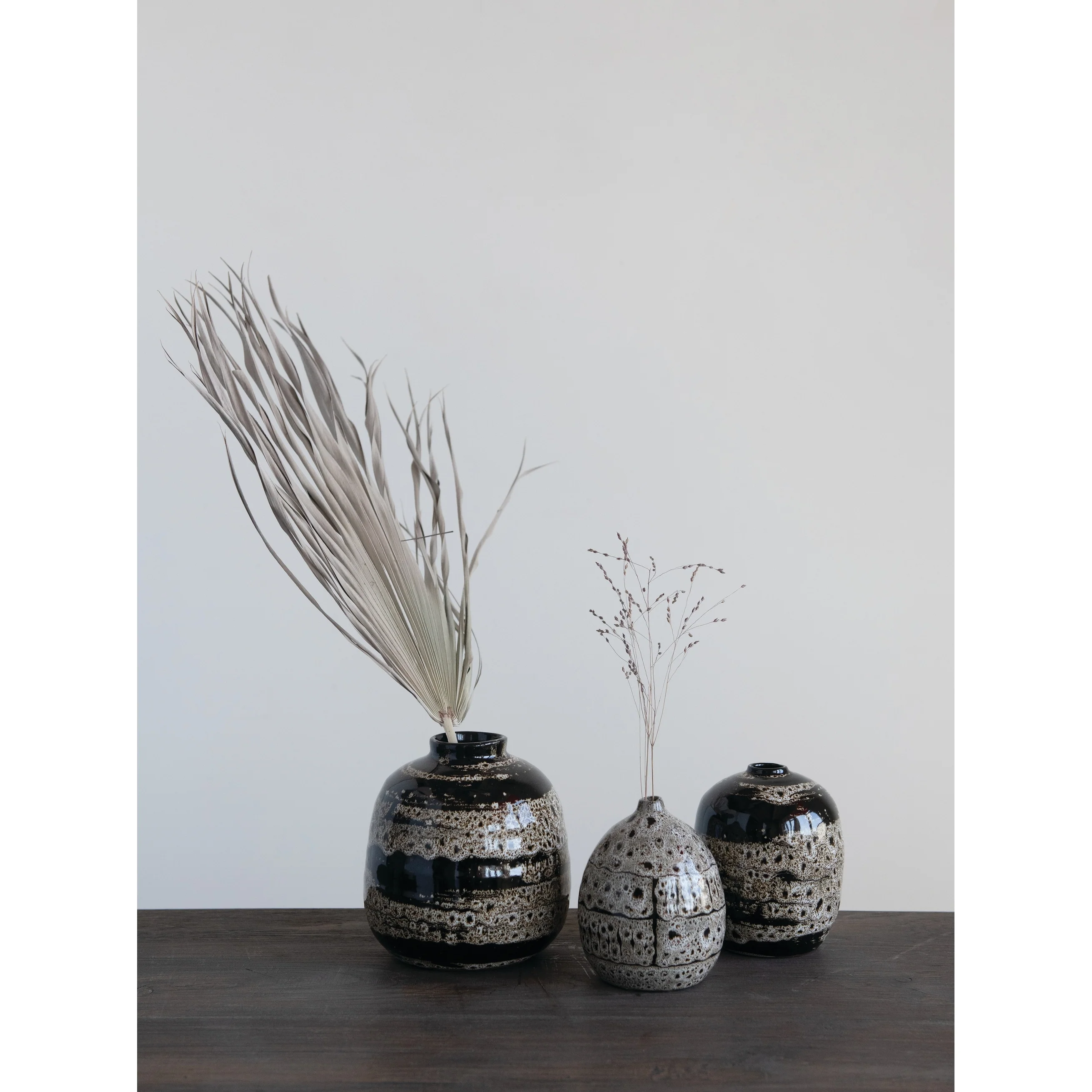 A beautiful way to add some character and coziness to any space, these brown terra-cotta vases with a reactive glaze, set of 3, feature a reactive glaze in a distressed design, creating a rustic and charming look that enhances the beauty of the brown color. The vases do not have any drainage holes, so they are suitable for holding dried or artificial flowers, or as decorative accents on their own. The vases are made of durable terra-cotta, a natural material that has a porous and earthy feel. The vases come in three different sizes, measuring 4.75 inches in diameter and 6 inches in height, 4 inches in diameter and 5 inches in height, and 3 inches in diameter and 4.75 inches in height. This set of three vases will look great in any farmhouse, country, or boho-style d茅cor, adding some texture and warmth to any space.�