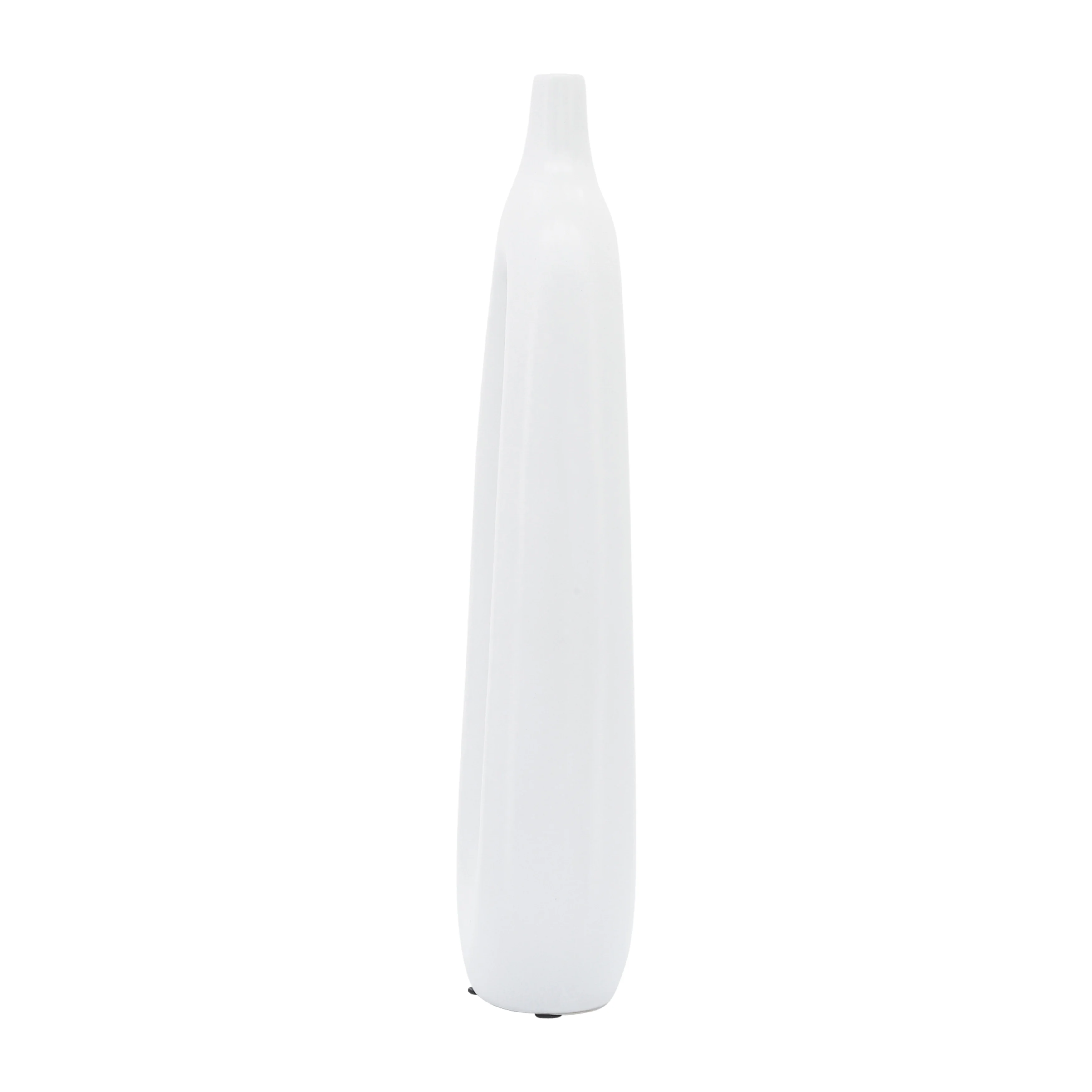 - This ceramic vase comes in a tall and narrow unique design with a creative oblong cut-out in the center. The skinny top opens for your choice of flower or greenery. It comes in a solid colors.