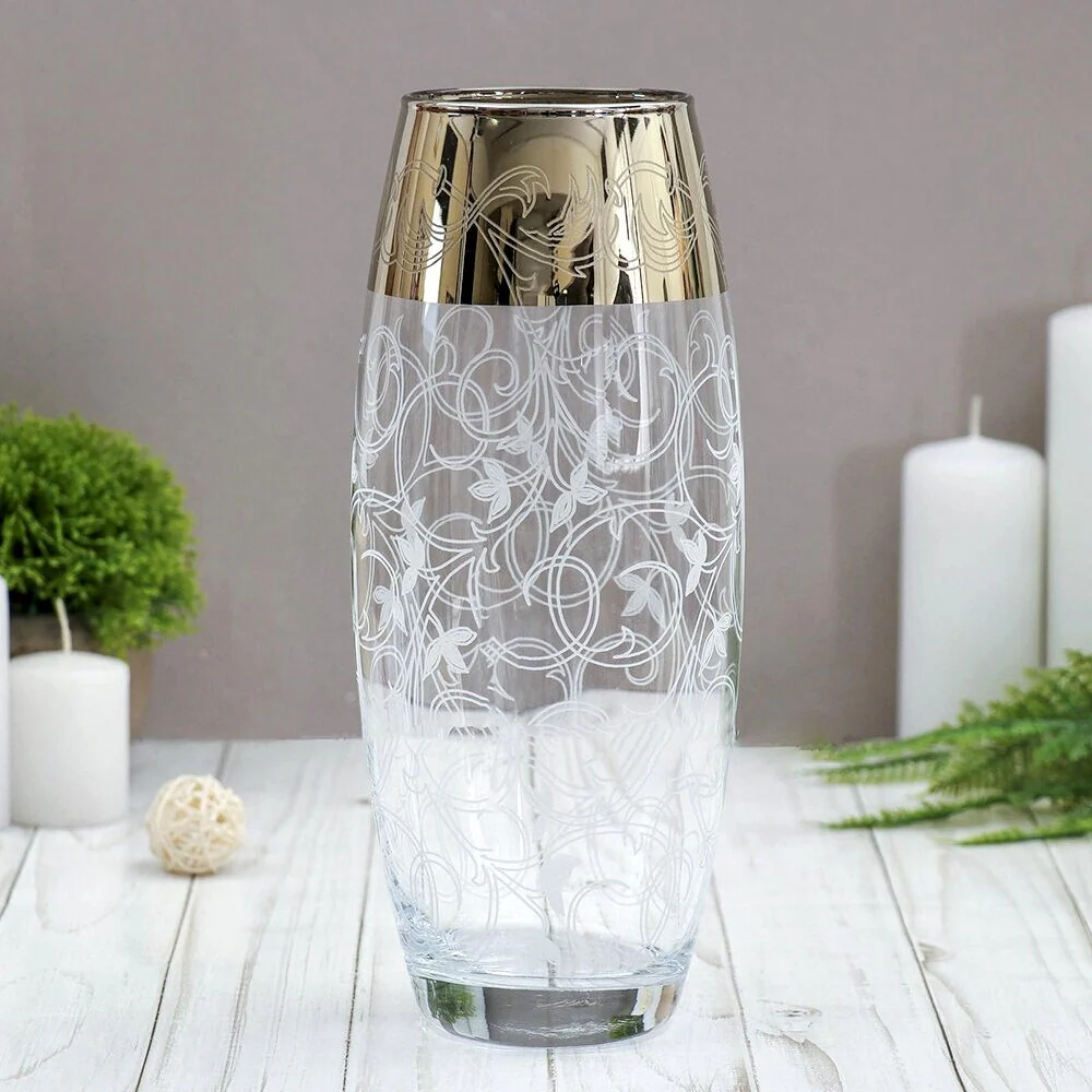 Clear Tall Neck 10 Glass Floral Engraved Gold Plated Vase