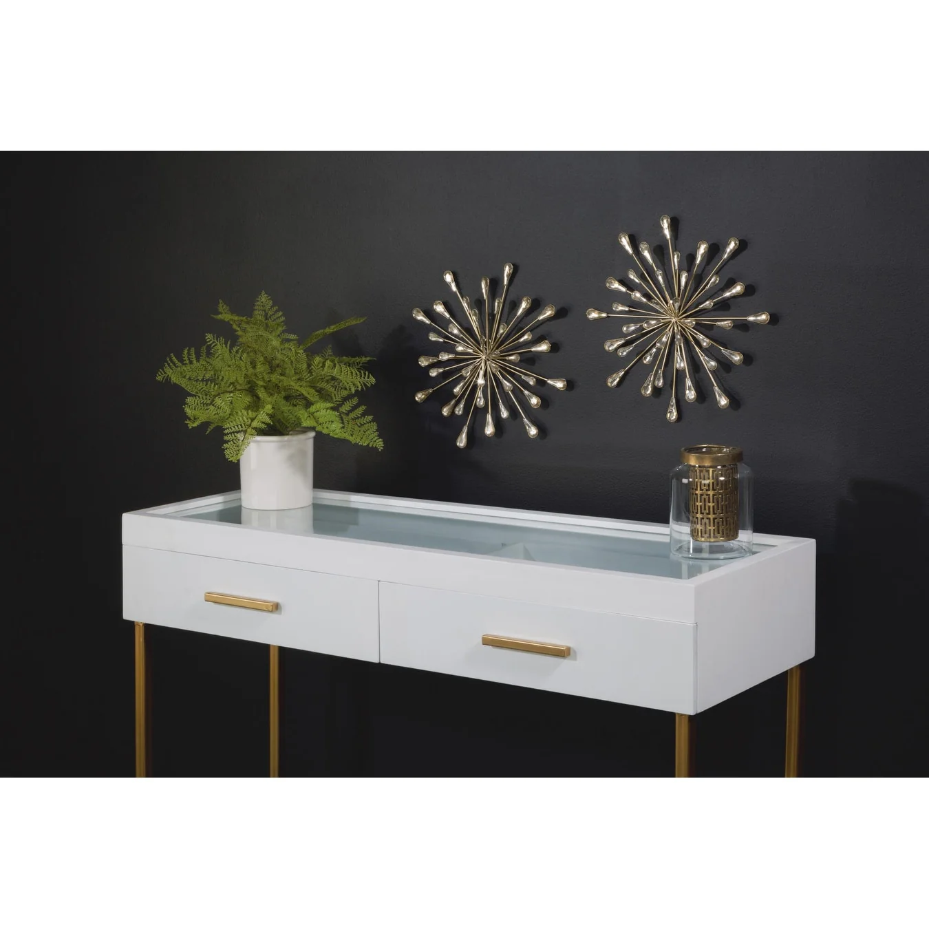 Add a touch of elegance to your wall with our Medium Gold Starburst Wall Art. With its gold painted metal and gold acrylic beads, this piece is the perfect accent to any room. At just under 2 inches deep, it won't take up too much space on your wall. Create a unique and stylish wall scape by hanging multiples.