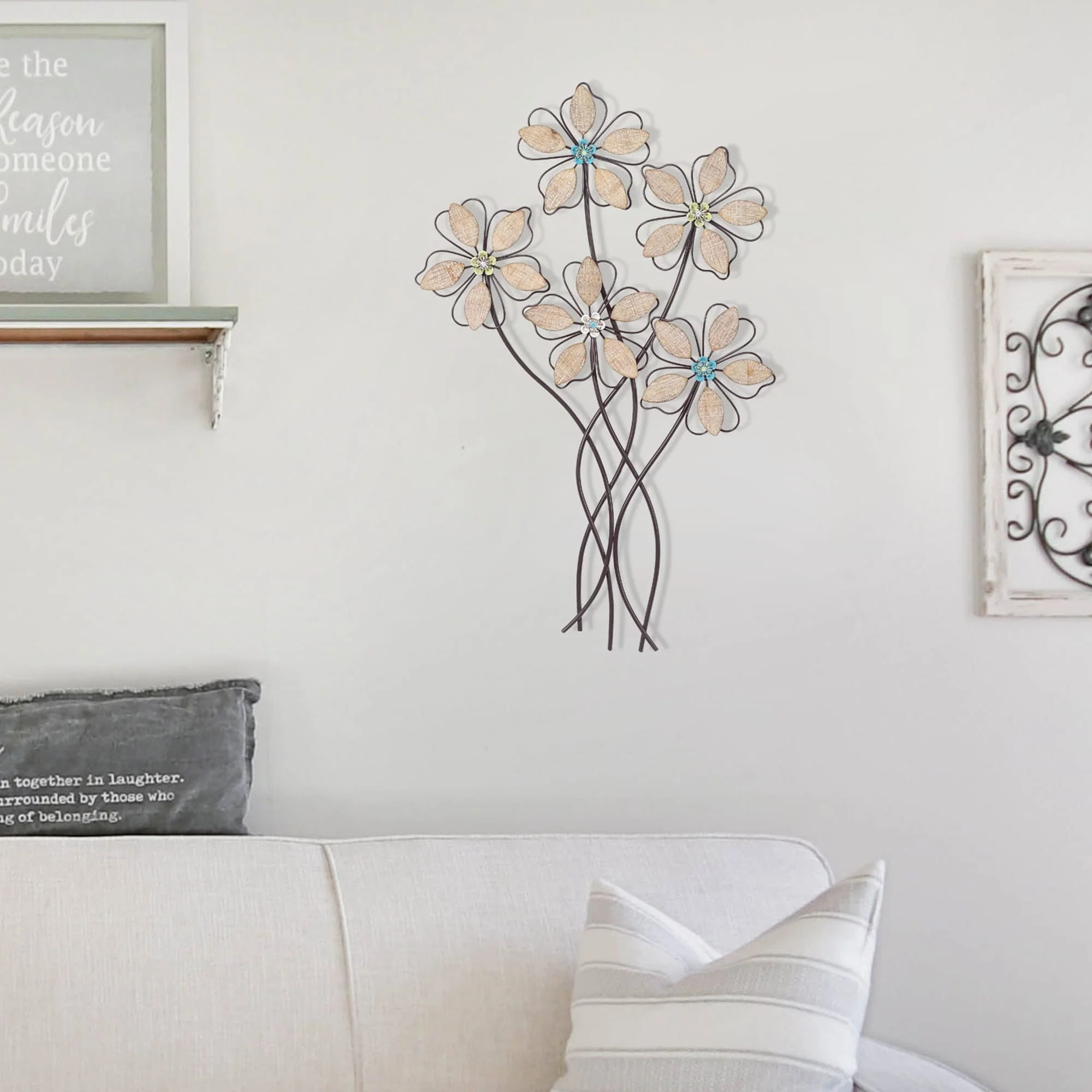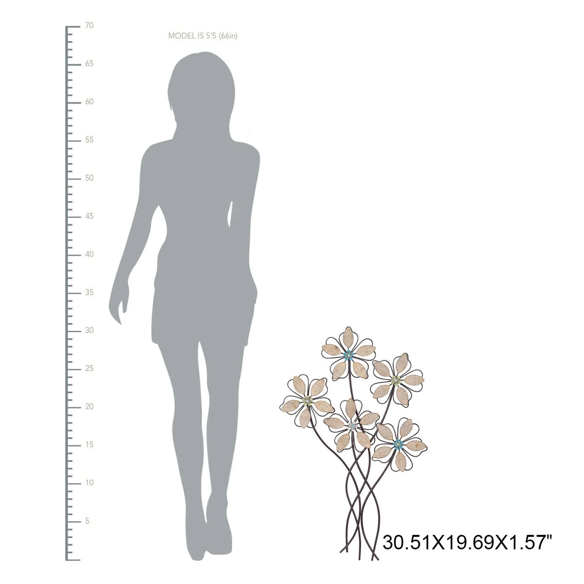 - · METAL FLOWER WALL DECOR - 5 flowers with rustic petals and blue, green and white stamens. With distressed and rustic finish, its an eye-catching accent piece for any room.