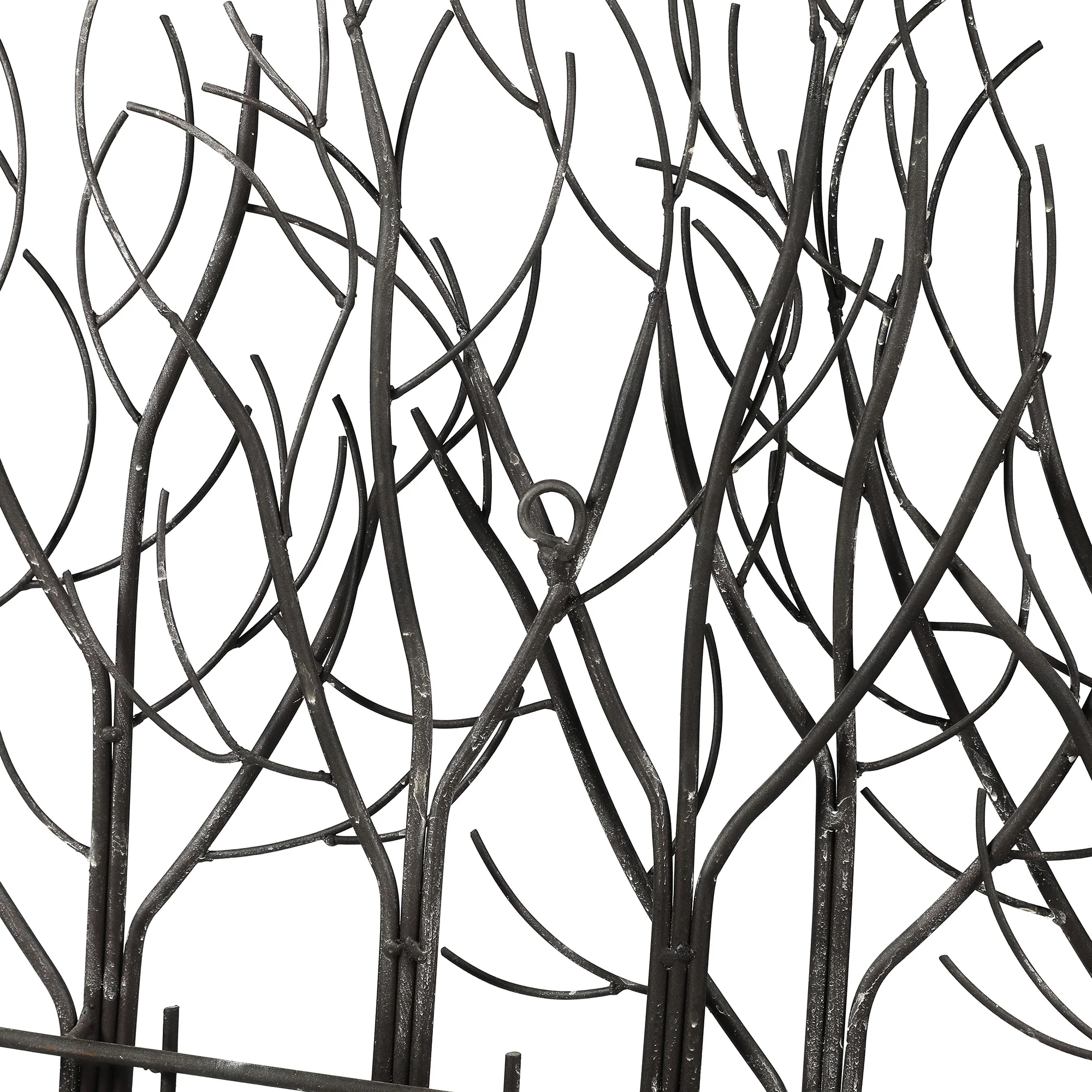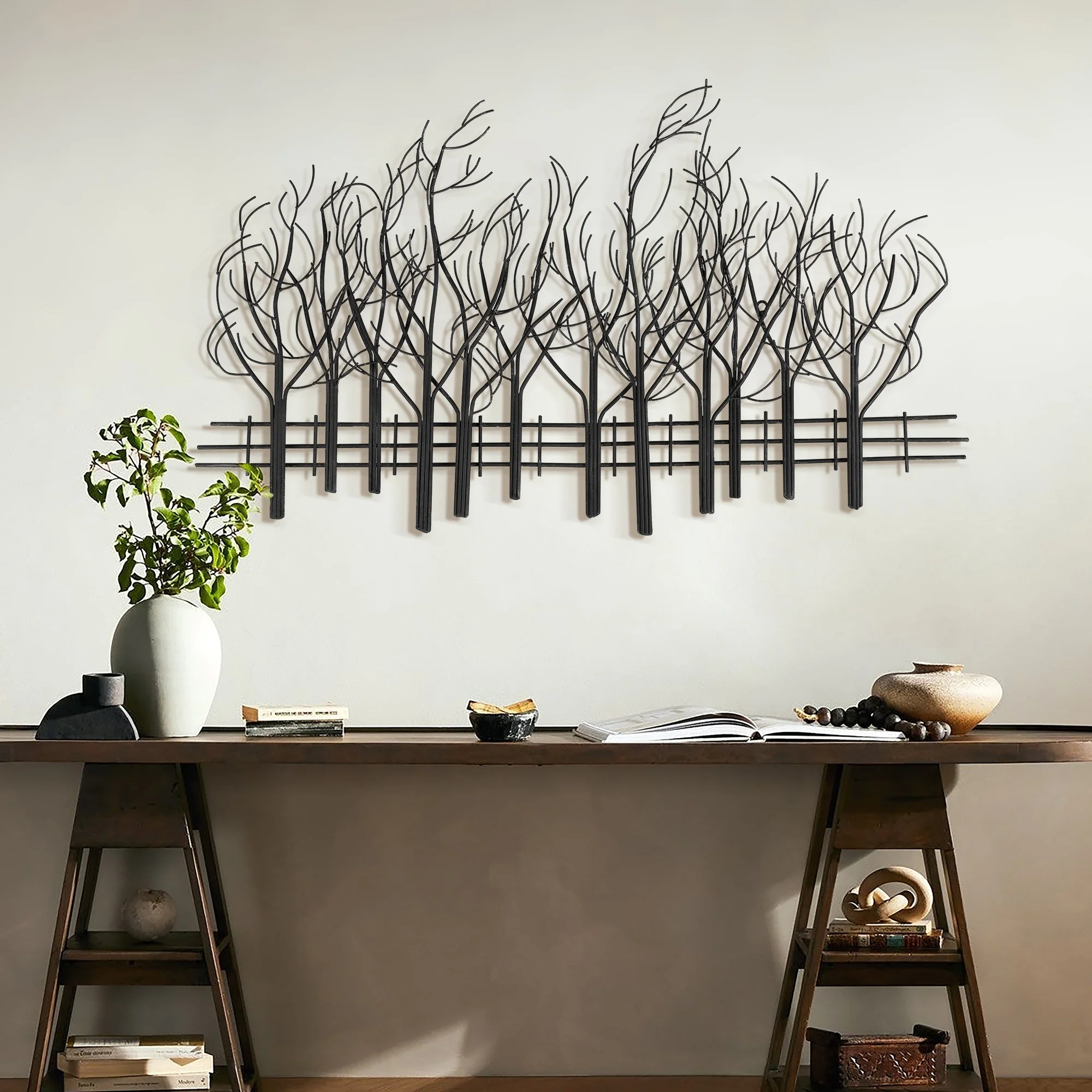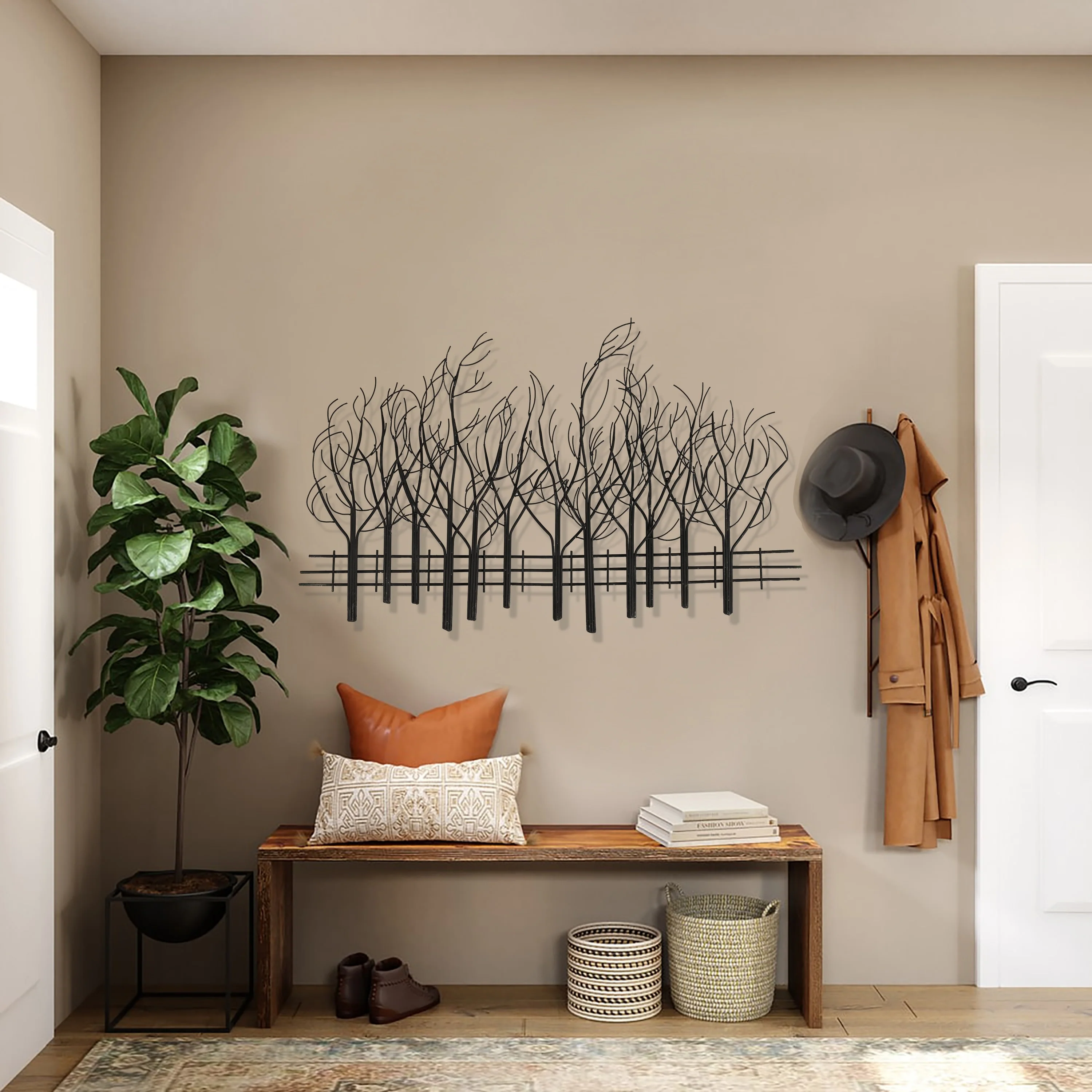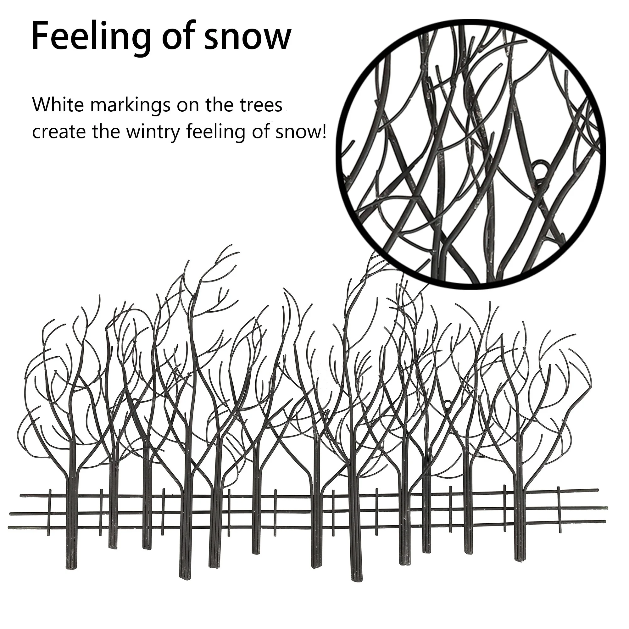 Bring the beauty of nature into your home with this stunning Black Metal Field of Trees Wall Decor. This handcrafted metal sculpture features twelve trees staggered in a 3D effect, with a fence line behind that adds depth and farmhouse charm. The matte black finish with white accents gives the piece a light snowy look, and the intentional scrapes and rubs make it look distressed. The contemporary style of this nature-themed wall art will complement any interior decor trend, and it comes ready to mount with included hardware. Perfect for your living room, bedroom, family room, dining room, or entryway, this piece will complete any room in your home!