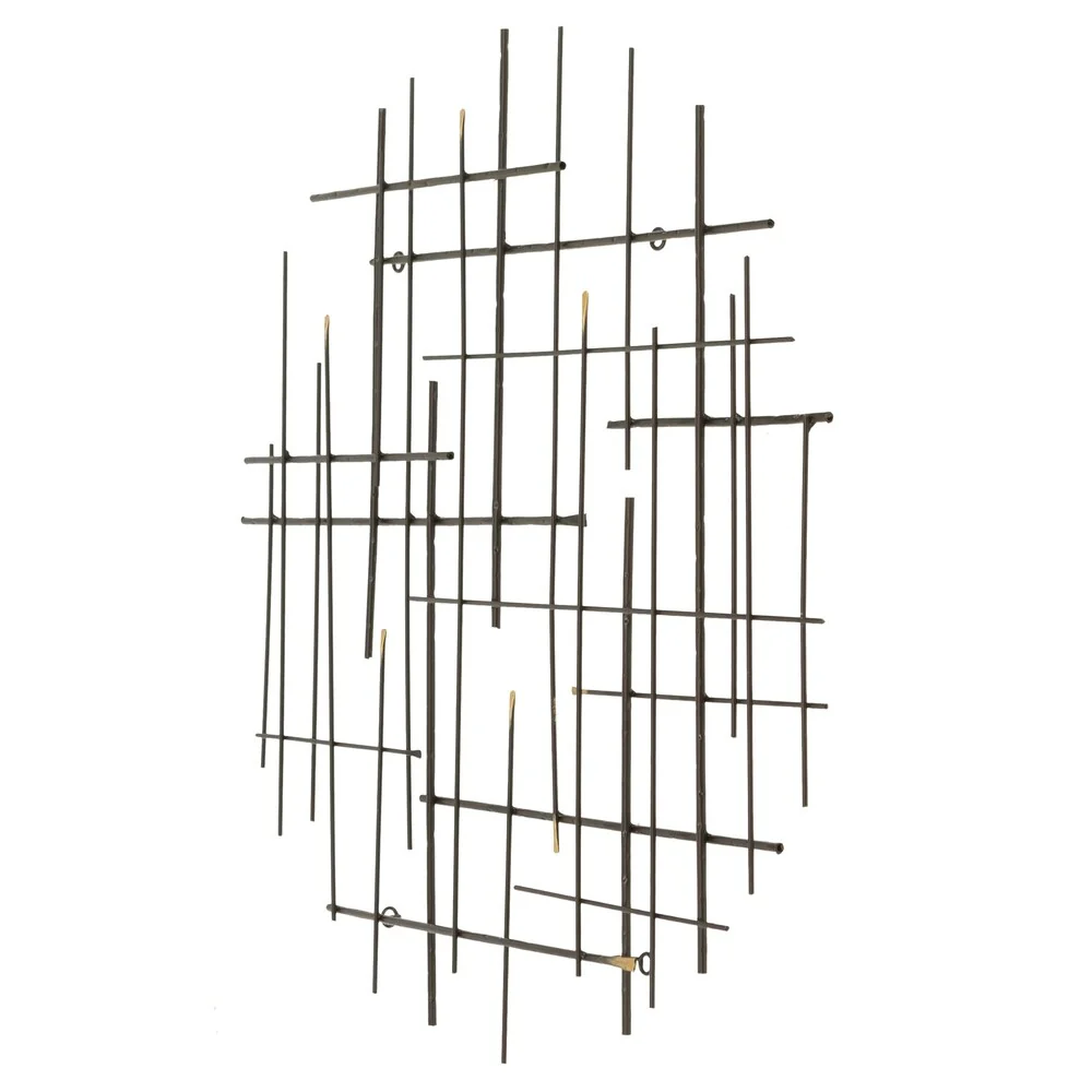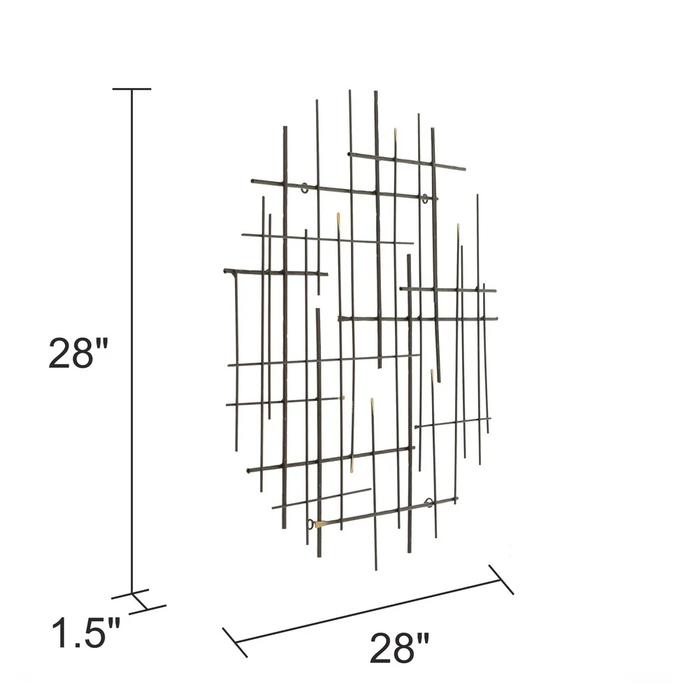 A crosshatched design of varying line lengths, this metal wall decor is the epitome of mid-century modern. Black metal lines accented with gold flair throughout the entire three-dimensional piece. Boost the character in your modern space with this chic addition.