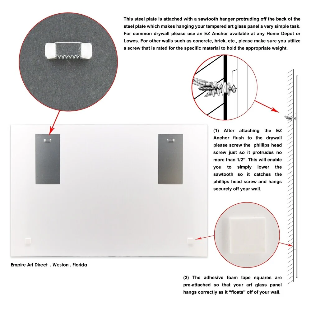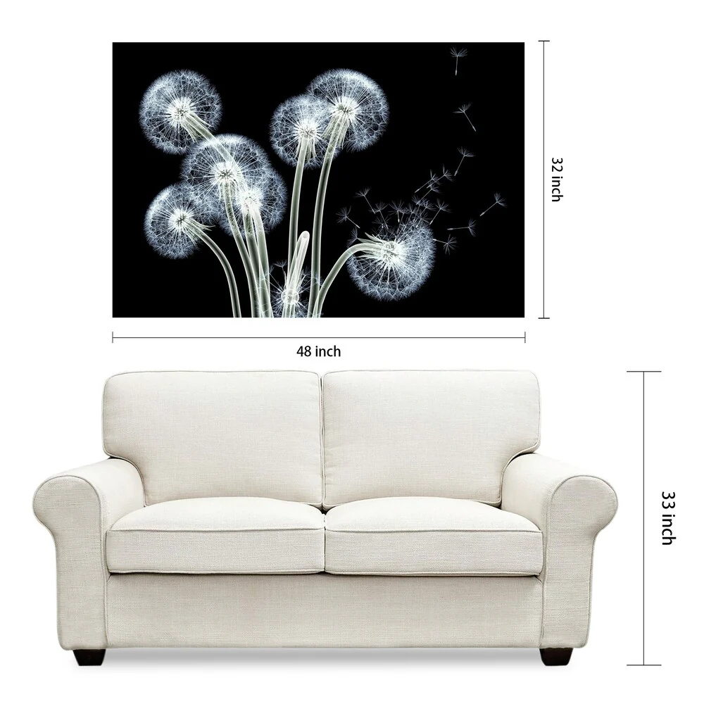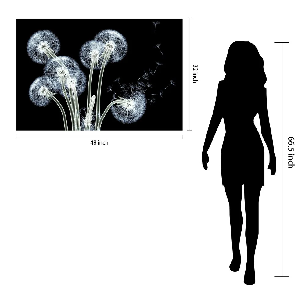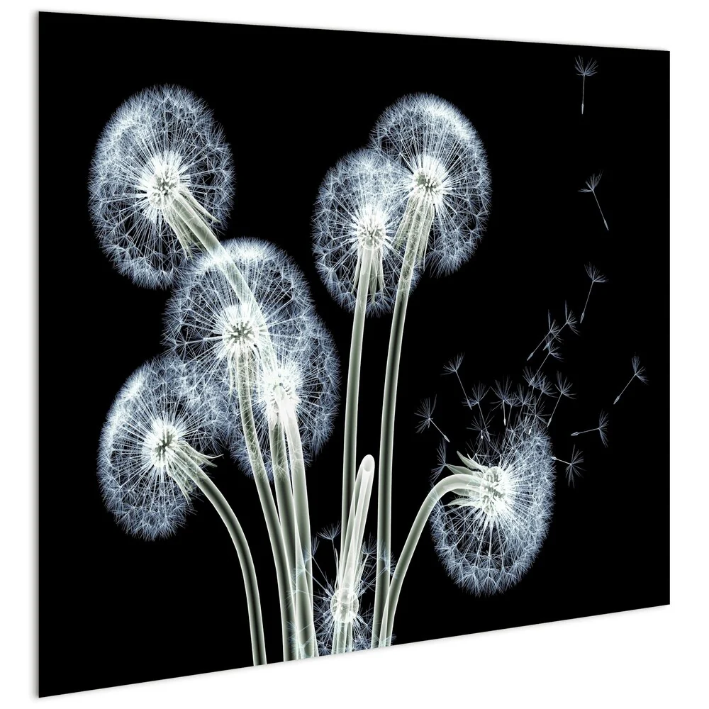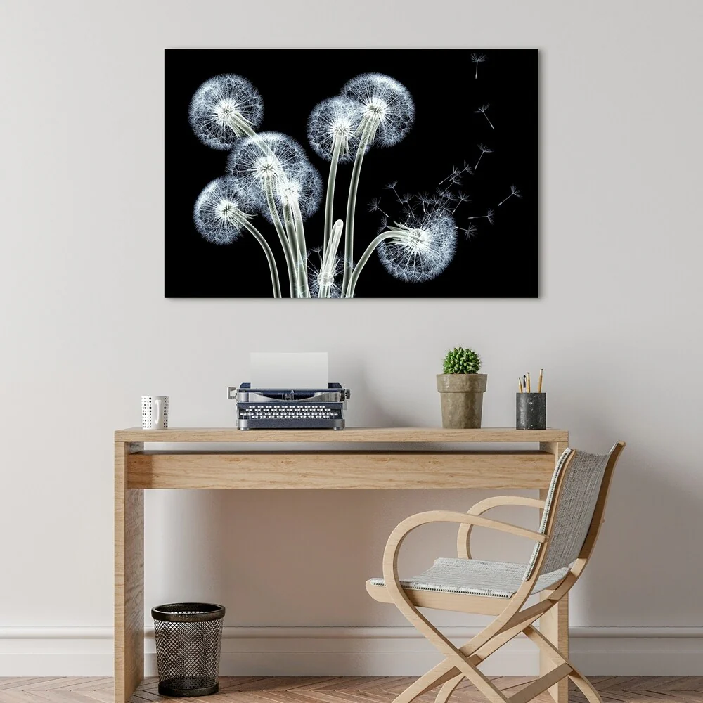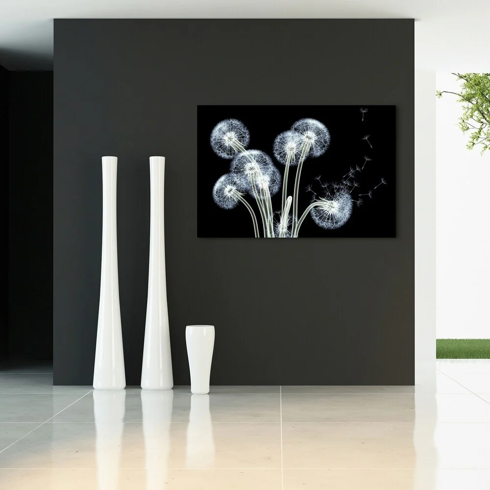 This unusual piece shows several dandelions recreated as 3D models, then given the slight transparency of an x-ray. This allows us to see how the parts of the plant overlap, with the heads having particular complexity. There is a curious contradiction in the frozen appearance of the colorless flowers, against the floating seeds which show movement and life. Those with an eye for detail, who appreciate the patterns that nature creates, will see a lot in this image. 2 Strong steel hangers are attached to the back of the product for quick and easy installation.