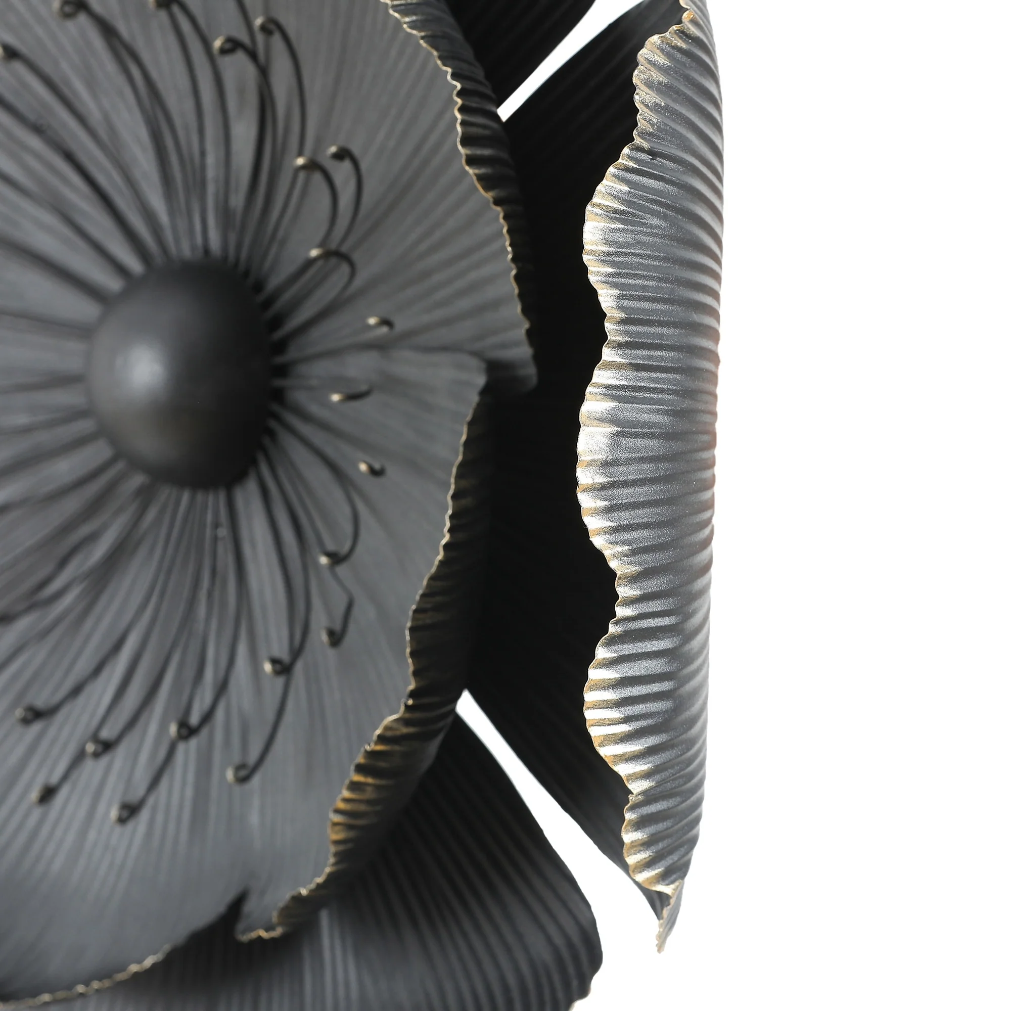 - This handcrafted metal flower wall decoration features a dark gray finish complemented by elegant gold accents, making it a stylish addition to any decor.