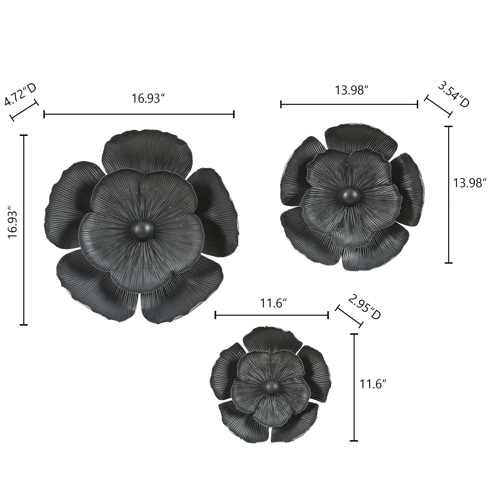 Transform your home with this elegant dark gray and gold metal flower wall decor set. The gold accents at the tips of the petals beautifully contrast with the dark finish, making it a versatile addition that complements a variety of color palettes, especially when placed against a light-colored wall. Each piece is meticulously handcrafted from high-quality metal, bringing both visual interest and a touch of sophistication to any room. Hang each piece individually to enhance a larger space or arrange them as a cohesive series for a more sophisticated look. The largest piece measures 16.9 inches in diameter, the medium piece is 13.98 inches, and the smallest is 11.6 inches in diameter. These wall sculptures are ideal for those who have an eye for the unique and a taste for modern design.