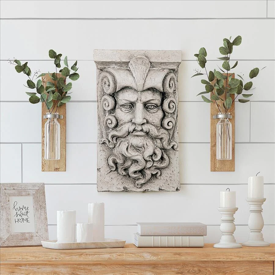 Adorn your pool, beach house or indoor spa with the Greek god Poseidon, protector of all waters. Sculpted with characteristically dramatic expression, wave-like beard and ornate shell motif crown, this oceanic, archetypal keystone wall ornament adds instant architecture and a decorative exclamation point to your decor. Epitomizing the powerful spirit of the sea, our nautical Design Toscano-exclusive wall statue is cast in quality designer resin with a faux stone finish.