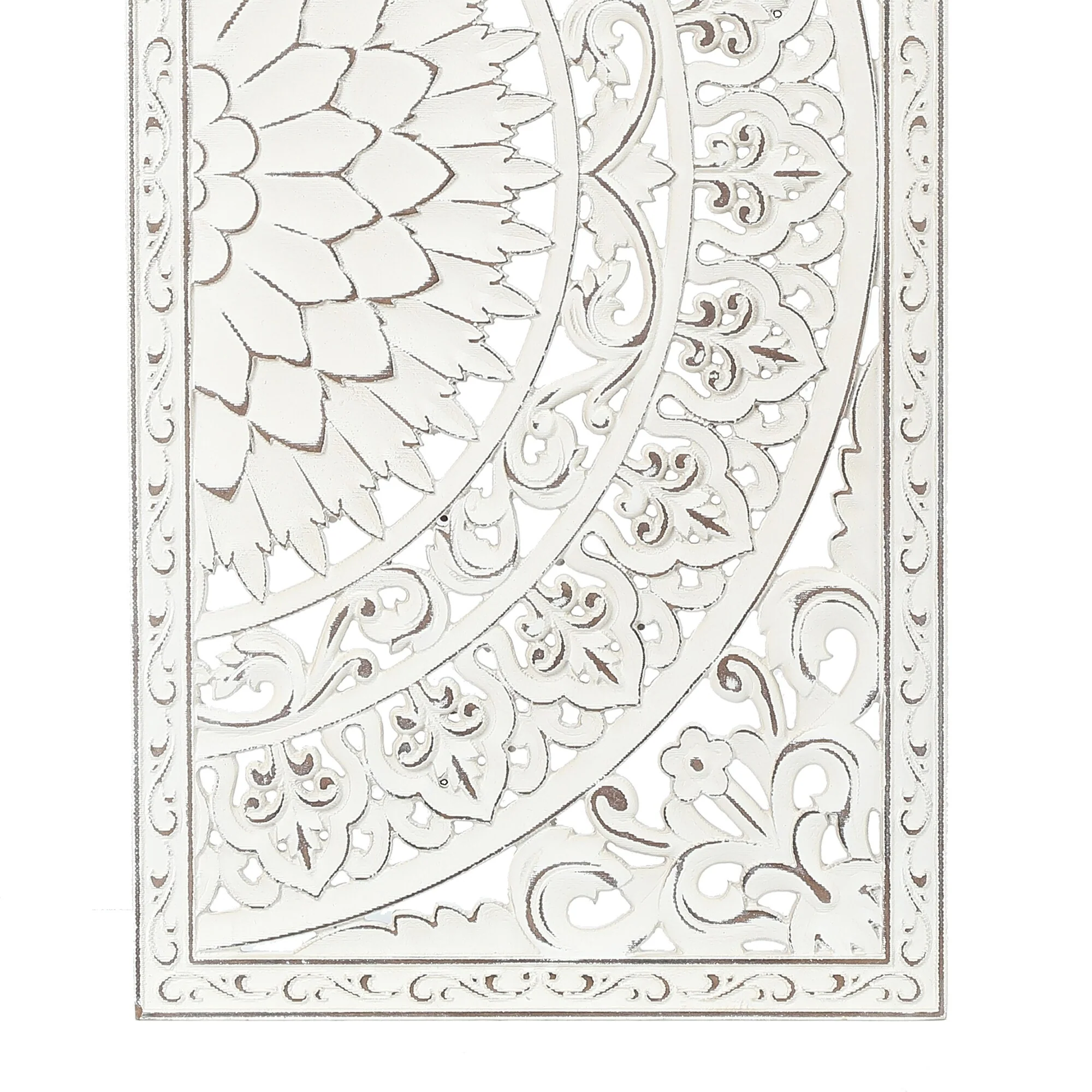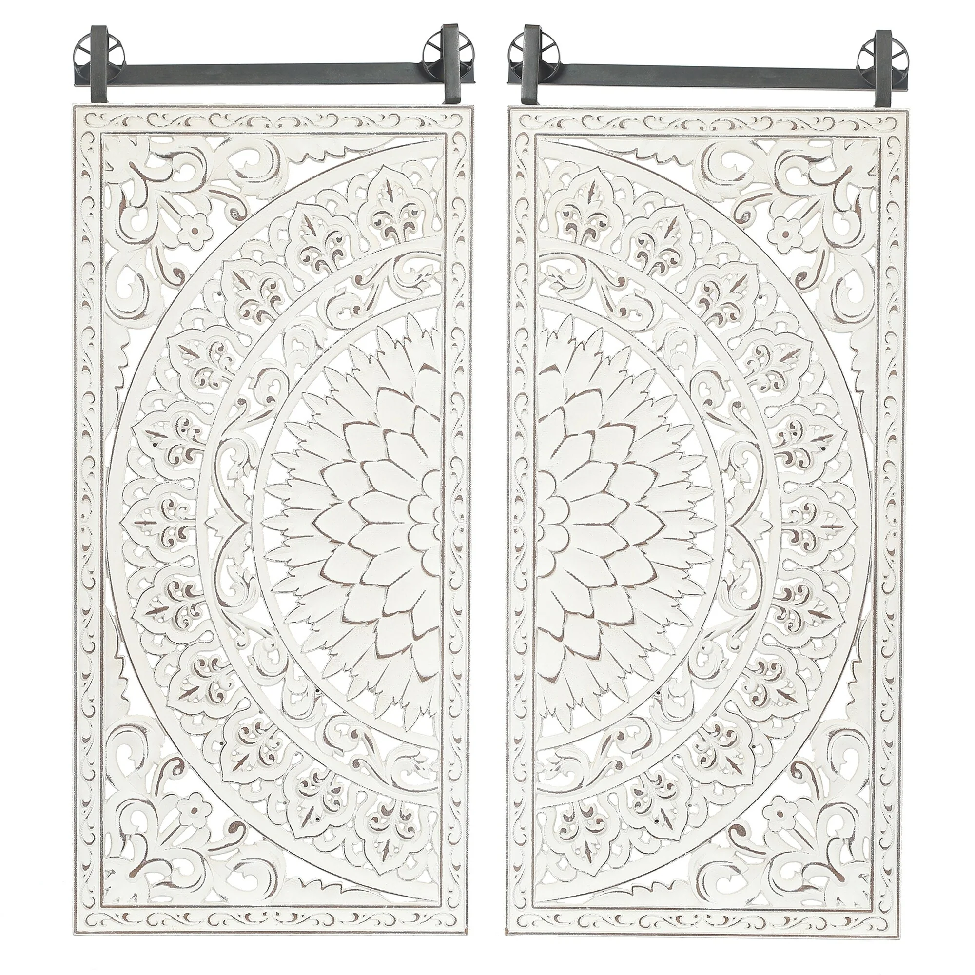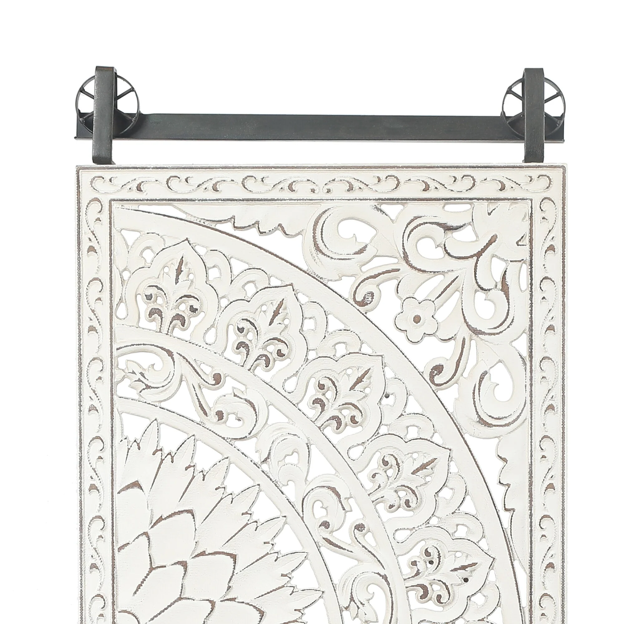 Looking to add some freshness, charm, and romance to your home decor? Look no further than this gorgeous 2-piece hand-carved floral-patterned wall decor set. Each piece is lovingly crafted from high-quality manufactured wood, with a beautiful carved flower design and raised details in soft ivory white with brown highlights for added depth and vintage appeal. The panels are attached to a sturdy weathered black iron bar, giving the set a modern farmhouse feel. Easy to mount with two metal D-ring brackets, this stunning wall art is sure to catch the eye and complement any interior design. Don't settle for a boring empty wall - give it the lift it deserves with this beautiful floral wall decoration.