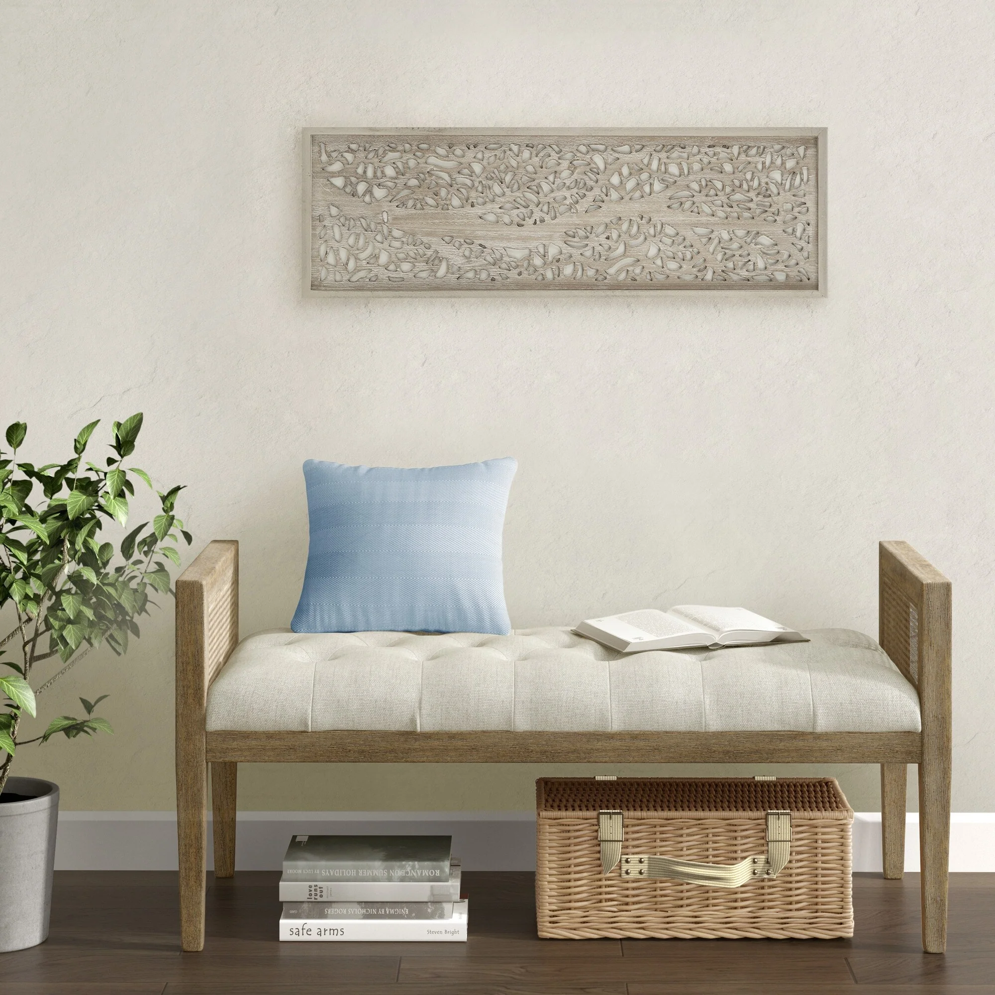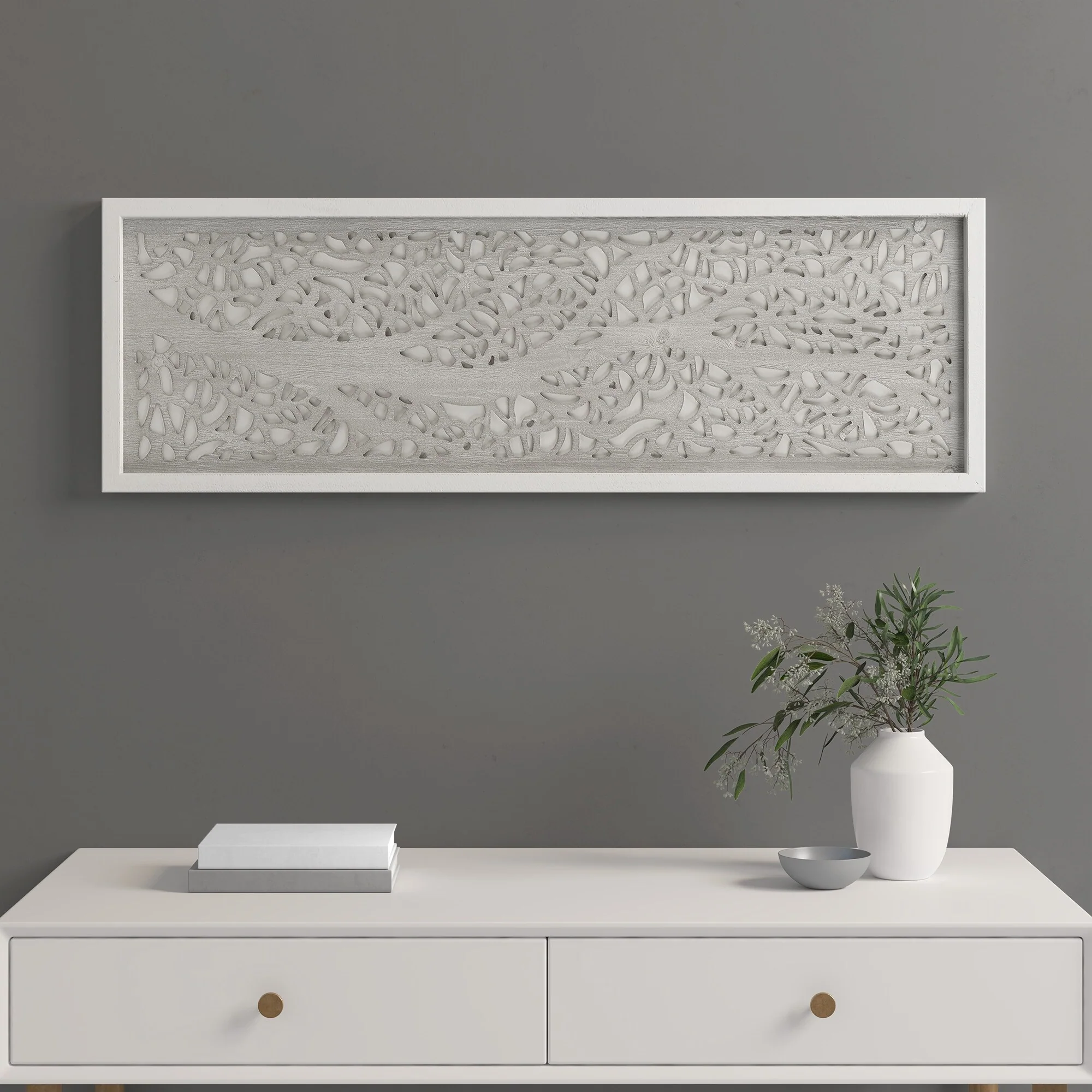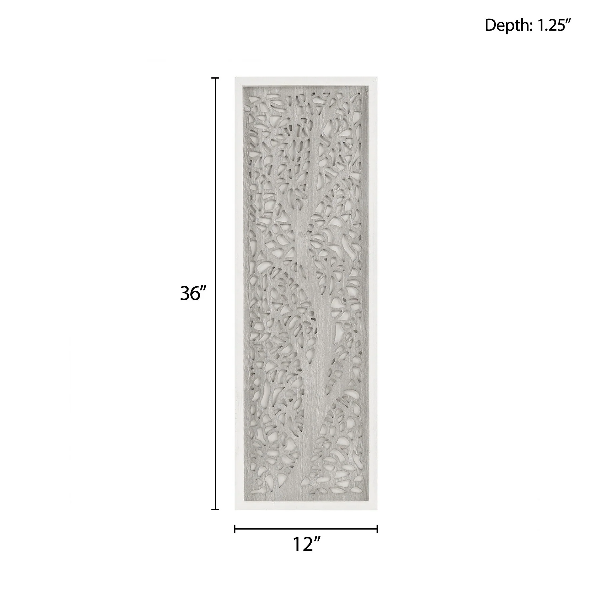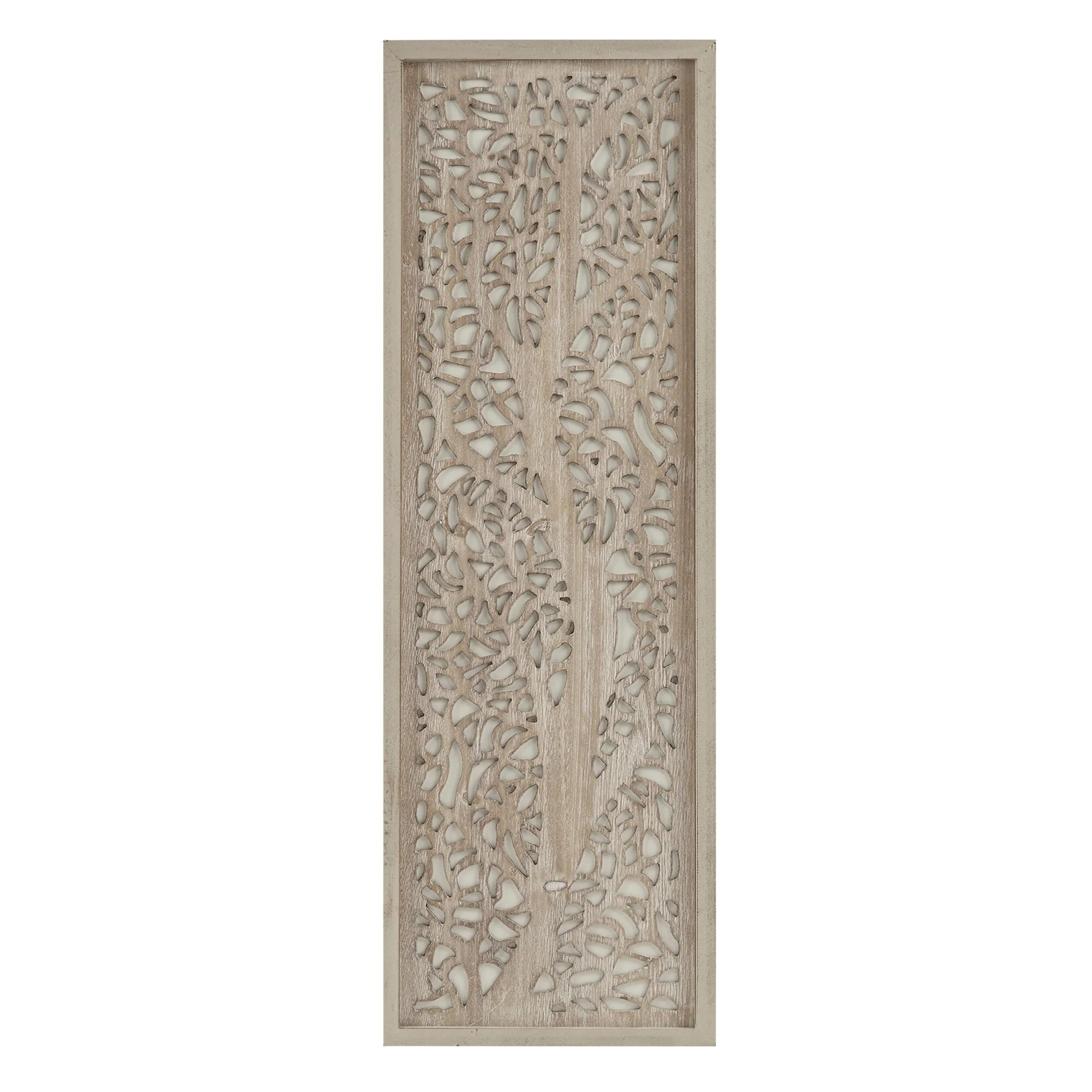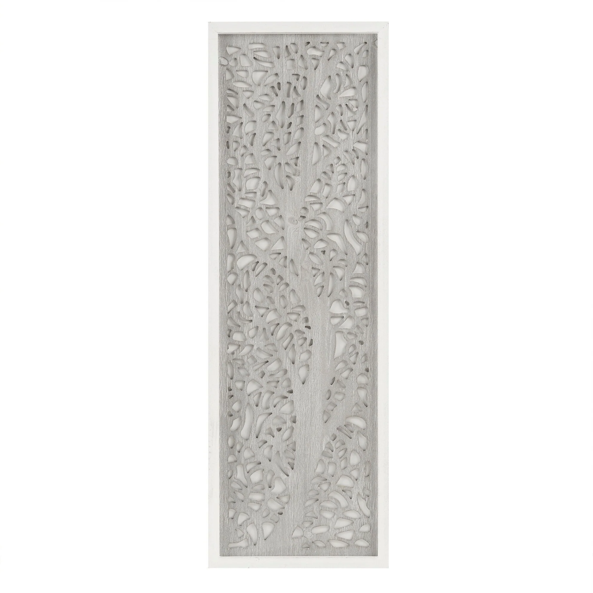 - Dimensional wall art with laser cut tree branch pattern on white background