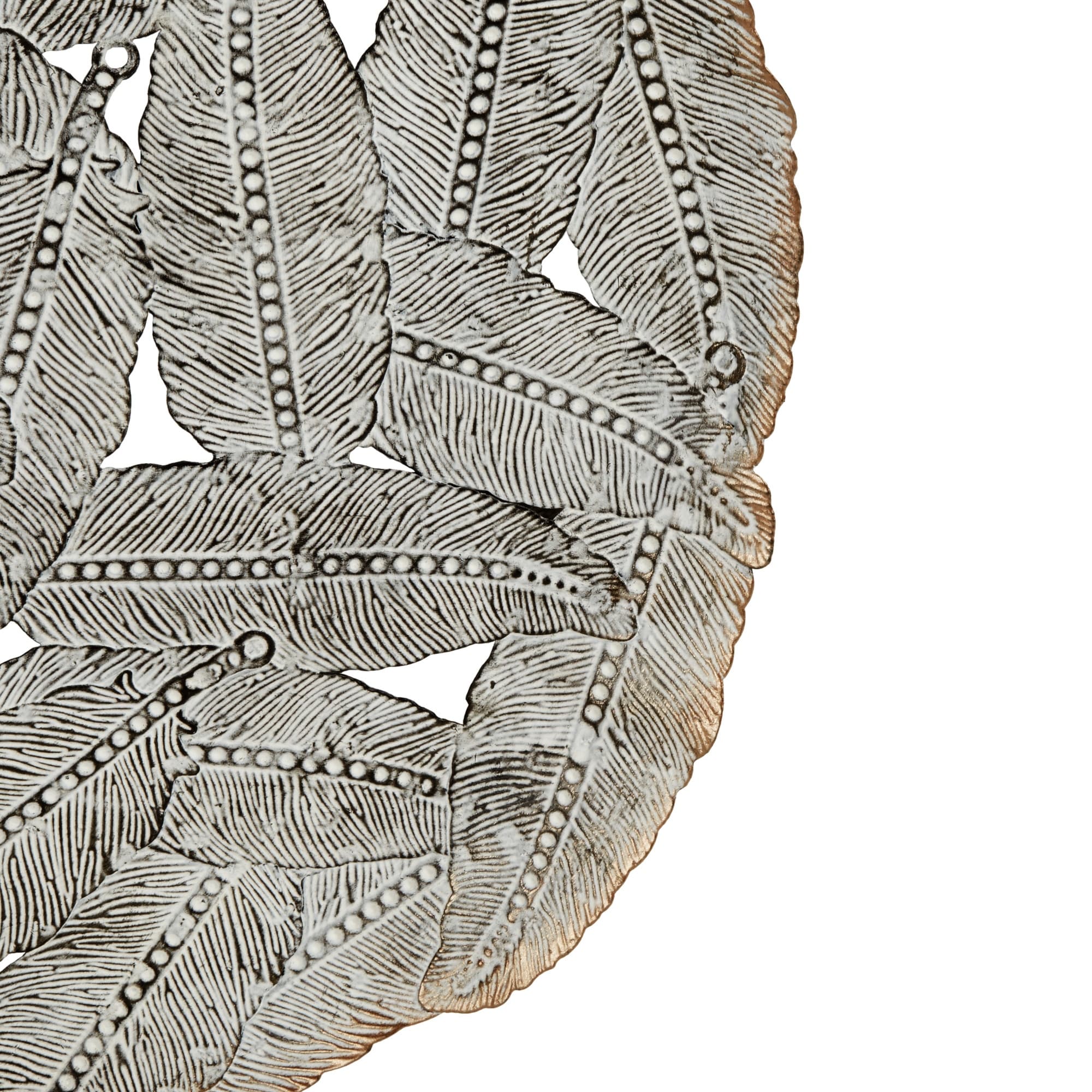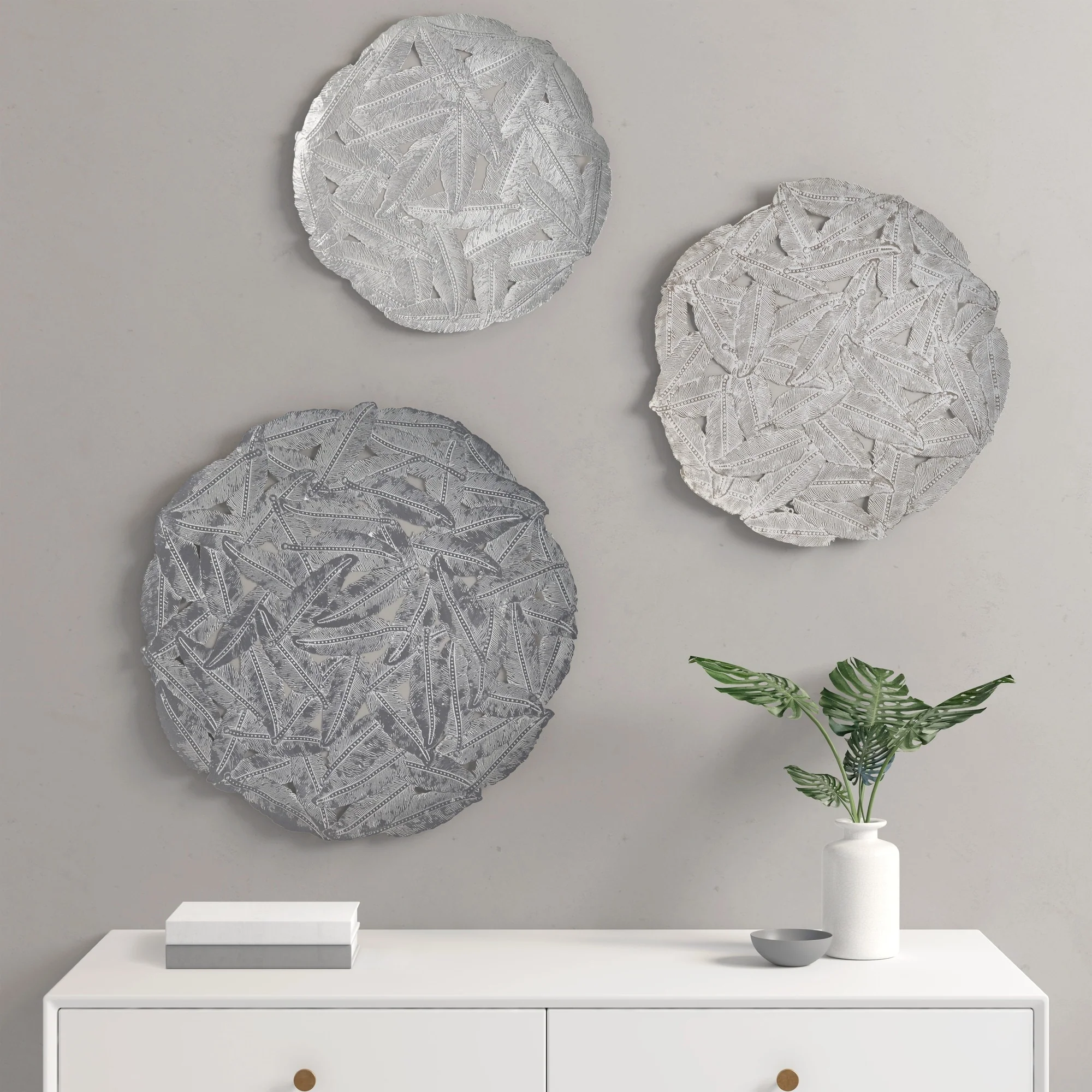 Bring a touch of nature indoors with our Madison Park Rosalie Textured Feather 3-piece Metal Disc Wall Decor Set. Each round feather cutout design is made of 100-percent metal with irregular edges and cutouts that create a textured and dimensional look. The set comes in three colorways, each painted with a beautiful hued iron finish that complements any decor. With hook ring hangers attached to the reverse, these wall decor pieces are easy to mount on any wall. Perfect for indoor use only, add a touch of elegance to your home with this set.