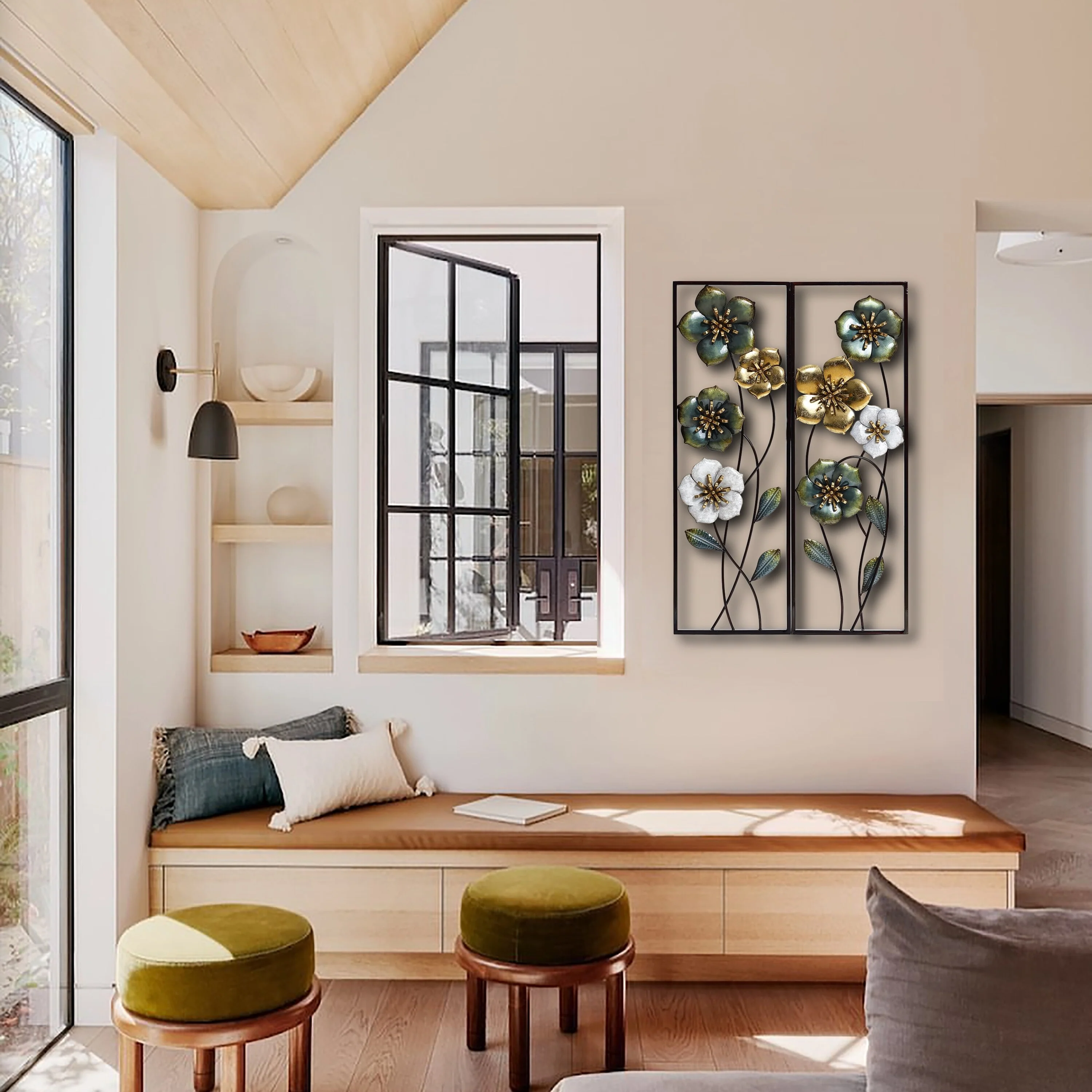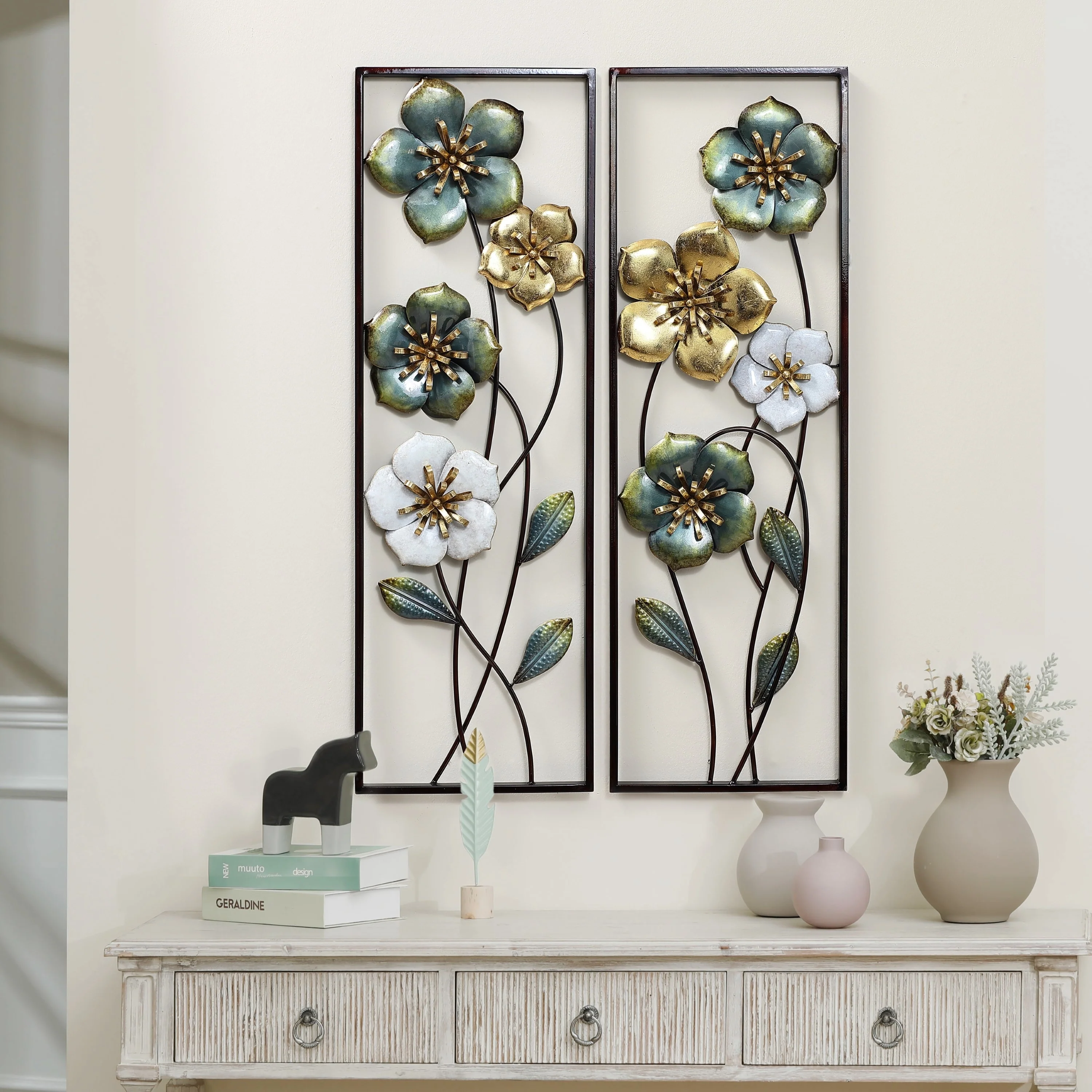 Add a touch of nature's beauty to your home with this stunning set of Metal Green, White, and Gold Wildflowers Wall Decor. The set includes two rectangular panels, each featuring a different bouquet of sculpted flowers in green, gold, and white finishes with gold centers. Mounted on a brown open metal frame, these panels are easy to hang and measure a generous 36 inches tall by 11.8 inches wide. Hang them together or separately in your entryway, living room, bedroom, or dining room to create a fresh and vintage-inspired look.