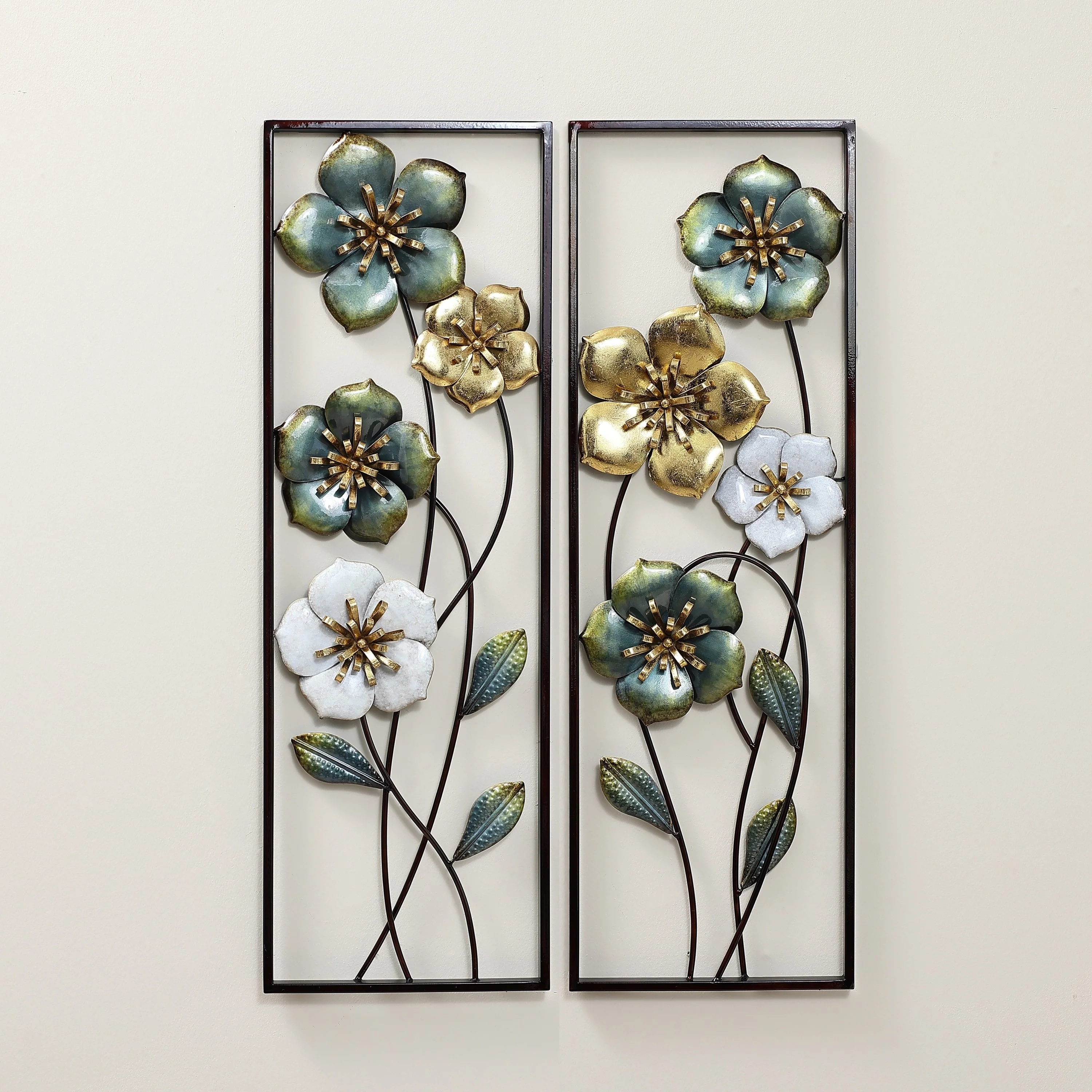 - Set of 2 rectangular floral wall decor panels with attached gold, green, and white flowers.