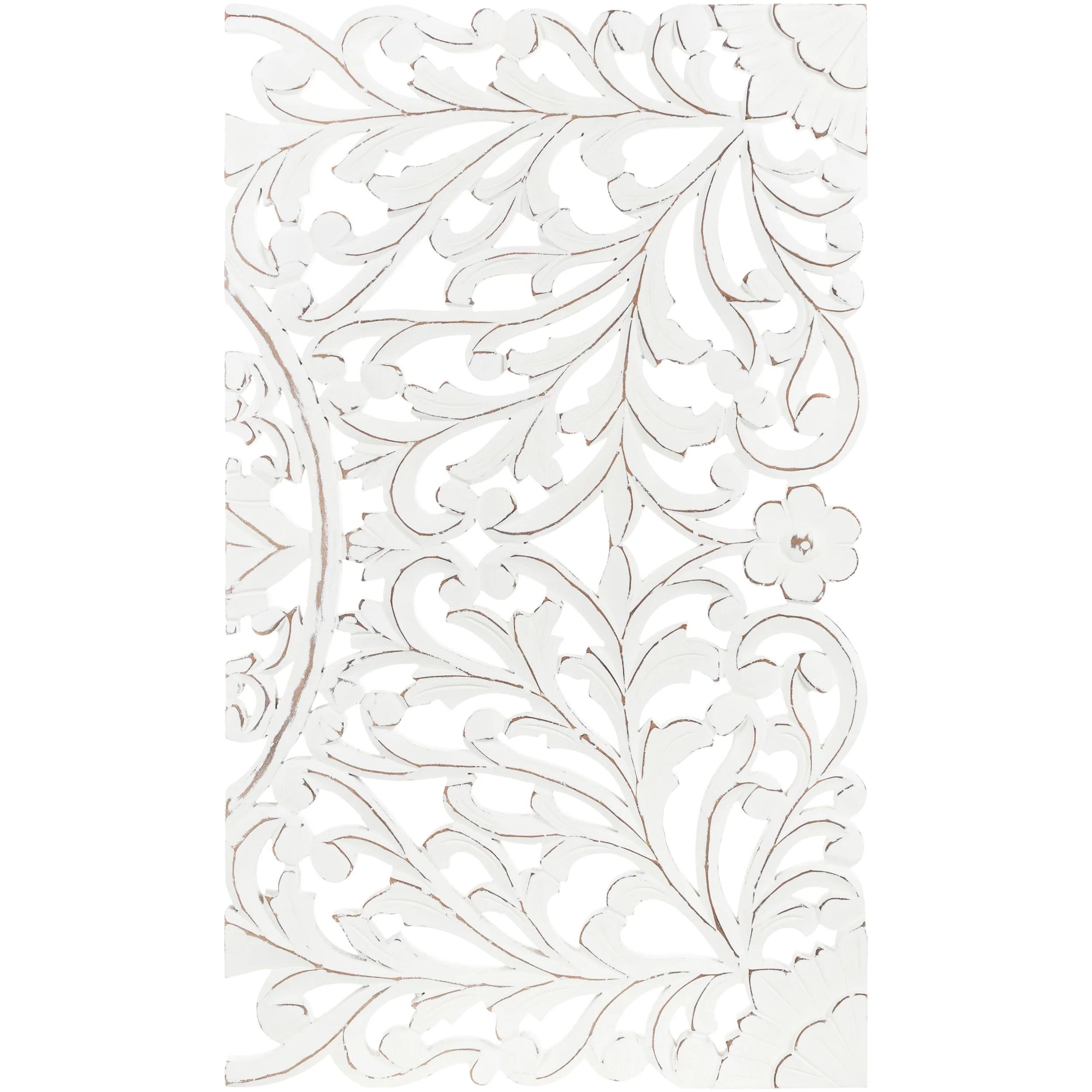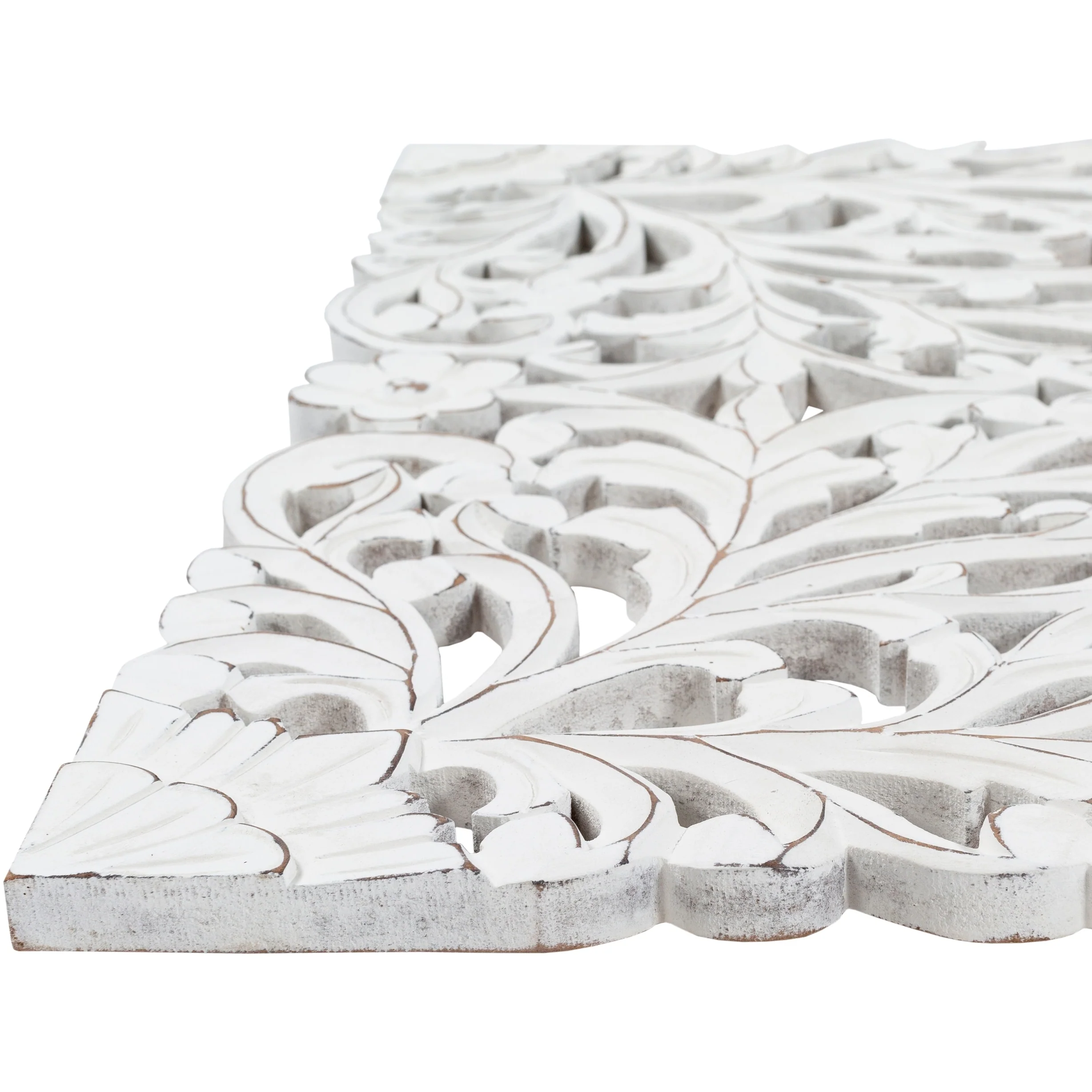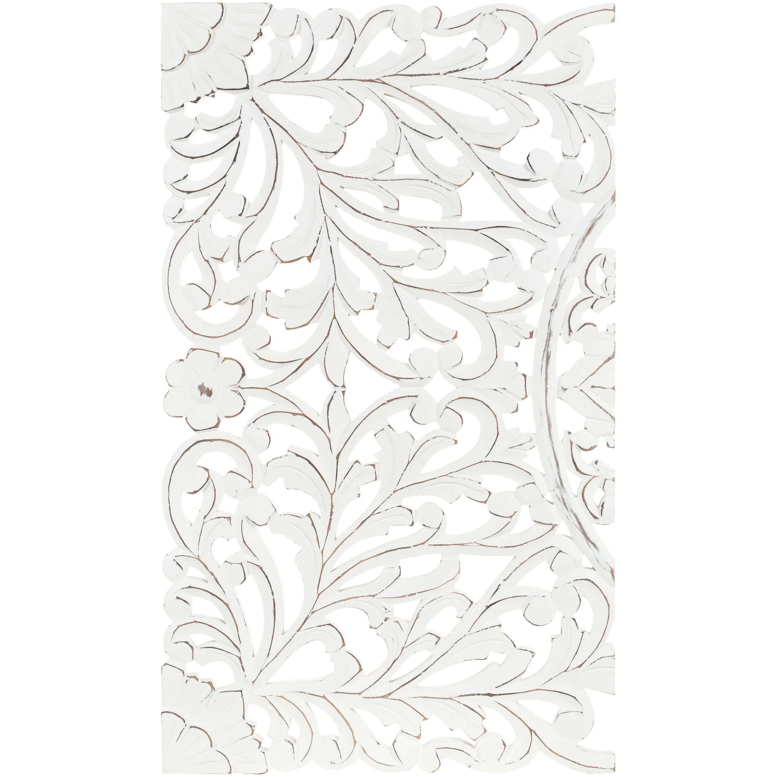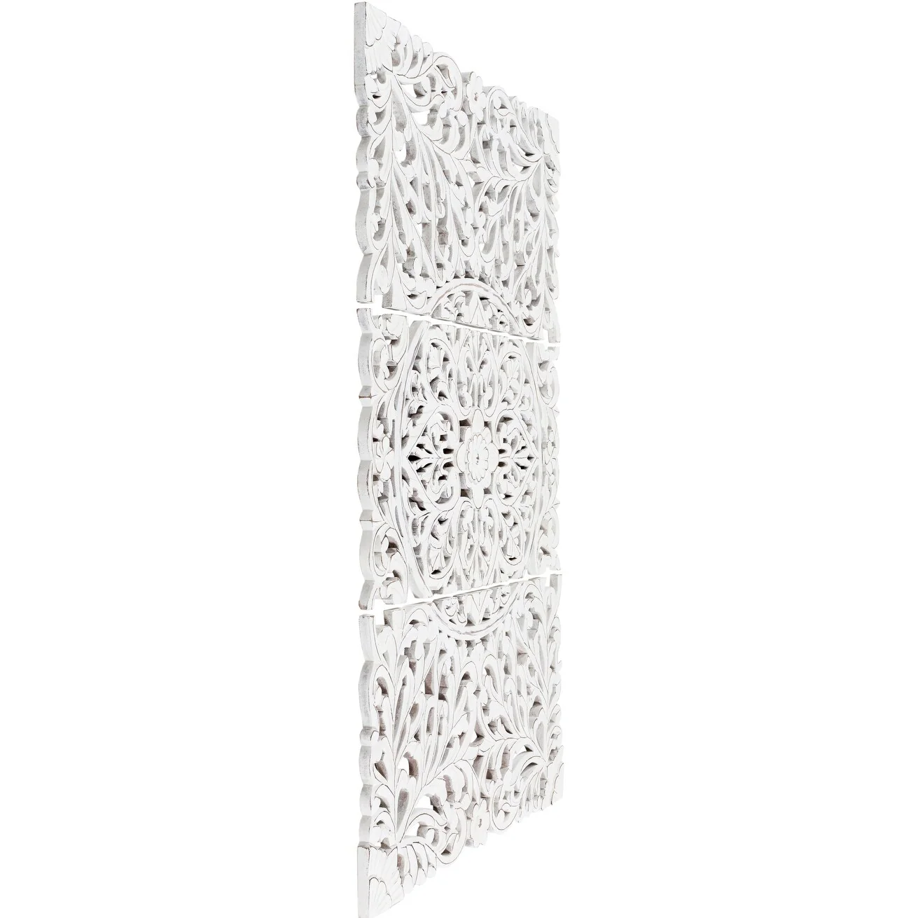 The elevated look of the Norma wall panels brings a wow factor to any space. This ornately-carved wood wall decor consists of 3 large wood panels. Each panel is hand-carved by an artisan giving it an antique feel. The intricate motif consists of festoon and acanthus in a distressed finish. It reinterprets the original, iconic Indian wood carving to an understated yet substantial motif. At 48 by 30 inches in total, it is an impressive addition to any room. To give it a modern appeal these panels are hand-finished by an artisan in tasteful, distressed finishes. Available in in a white wash finish. Individual panels are 16 inches wide. Wipe clean with a dry cloth.