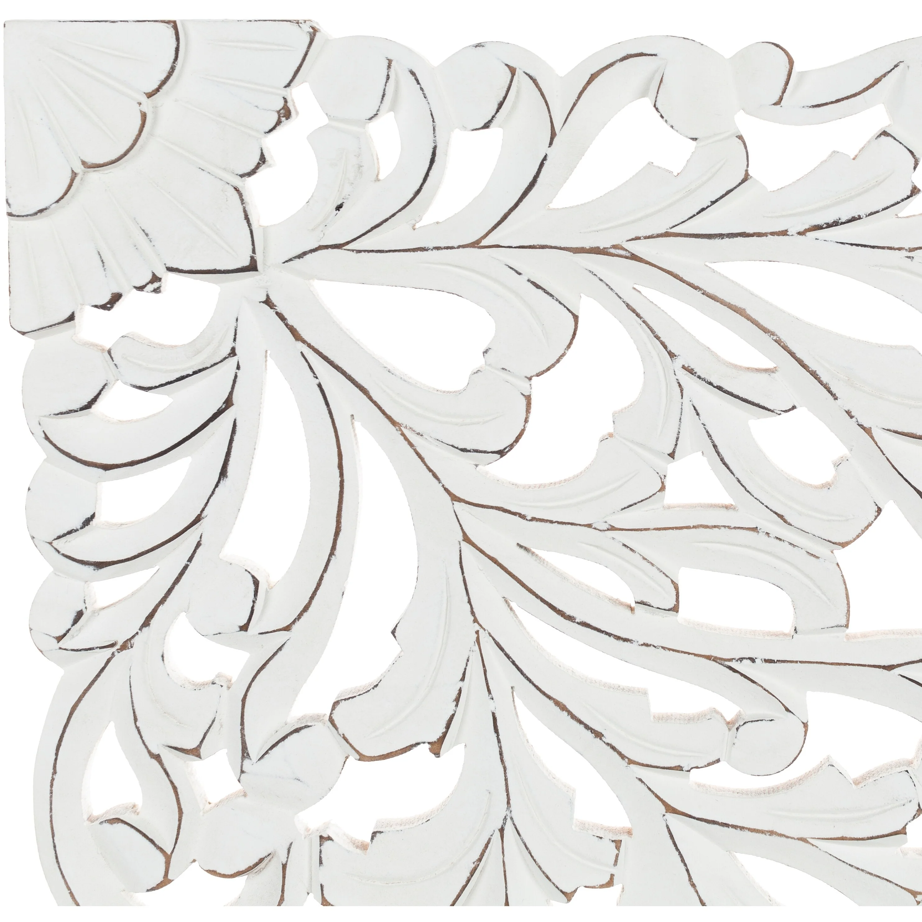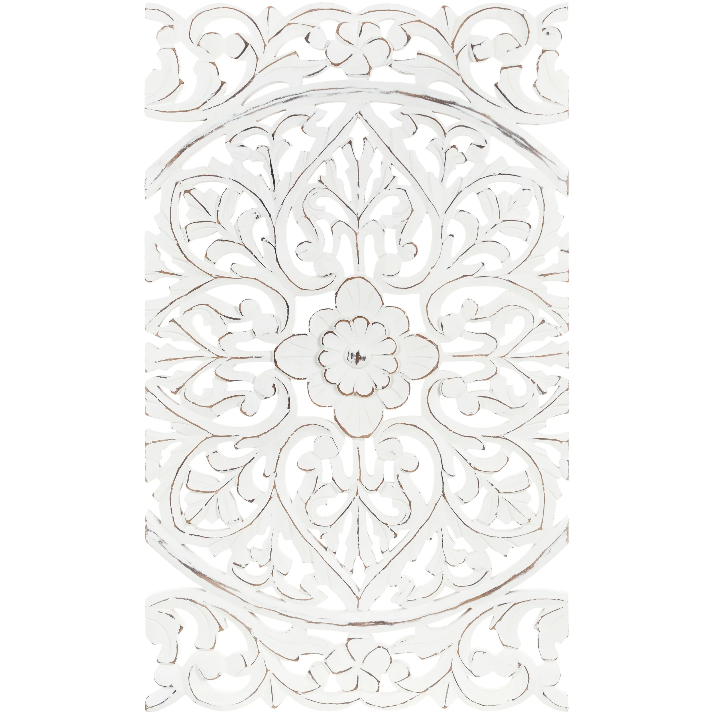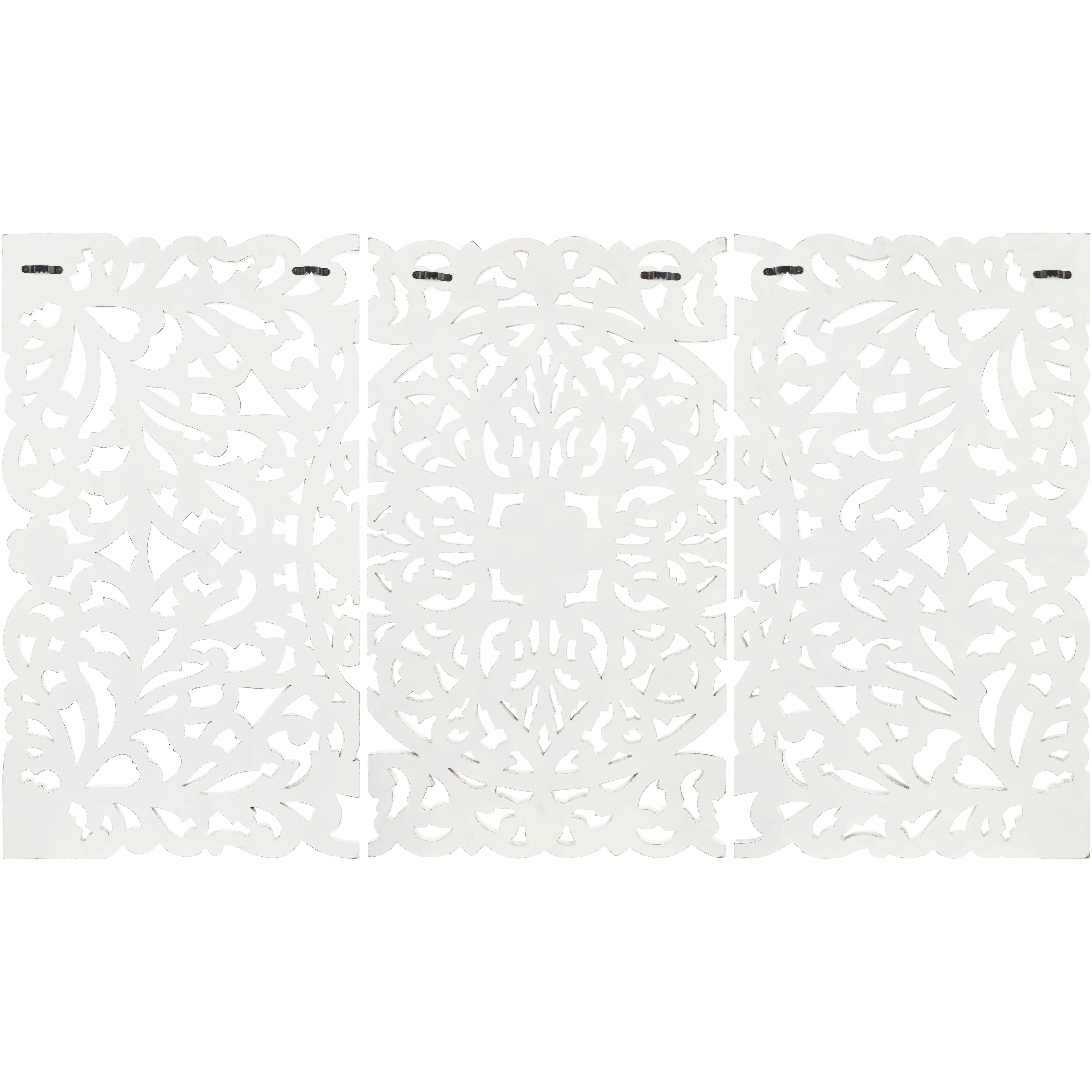 The elevated look of the Norma wall panels brings a wow factor to any space. This ornately-carved wood wall decor consists of 3 large wood panels. Each panel is hand-carved by an artisan giving it an antique feel. The intricate motif consists of festoon and acanthus in a distressed finish. It reinterprets the original, iconic Indian wood carving to an understated yet substantial motif. At 48 by 30 inches in total, it is an impressive addition to any room. To give it a modern appeal these panels are hand-finished by an artisan in tasteful, distressed finishes. Available in in a white wash finish. Individual panels are 16 inches wide. Wipe clean with a dry cloth.