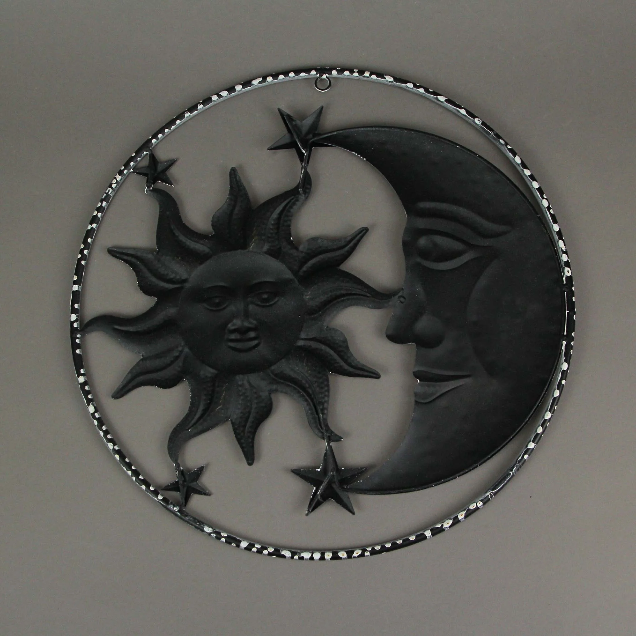 Bring a harmonious balance to your indoor or outdoor space with this celestial inspired wall hanging featuring a smiling moon and sun in a circle of stars. The metal art sculpture brings your space a delightful touch of celestial charm in a distressed white and bronze finish that gives it a wonderfully weathered look. Swirling rays give the sun a sense of motion while the stars bring a soothing sense of calm, and a simple round metal frame completes the look. Display it on a focal wall anywhere indoors or let it greet your guests outside near the front entry. Hang it by the pool, on the patio or on a fence to bring a little life to your yard or garden. This 16.5 inch diameter, .25 inch wide wall sculpture brings personality, character and artful inspiration to your indoor or outdoor decor.