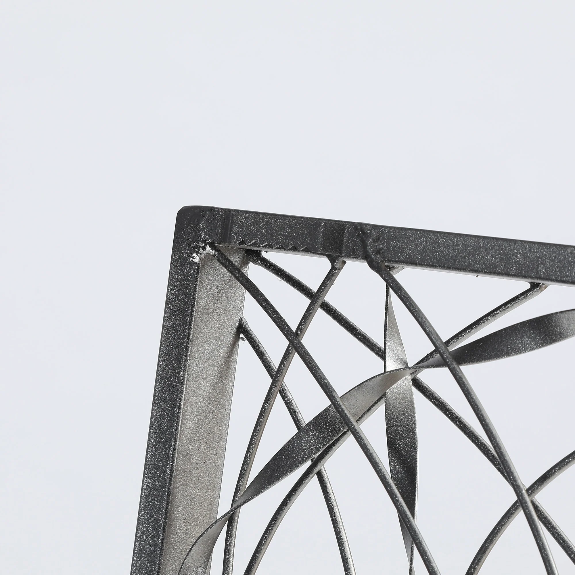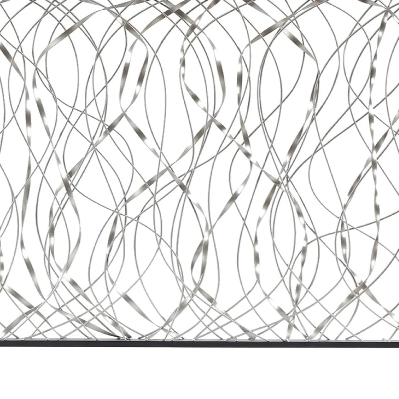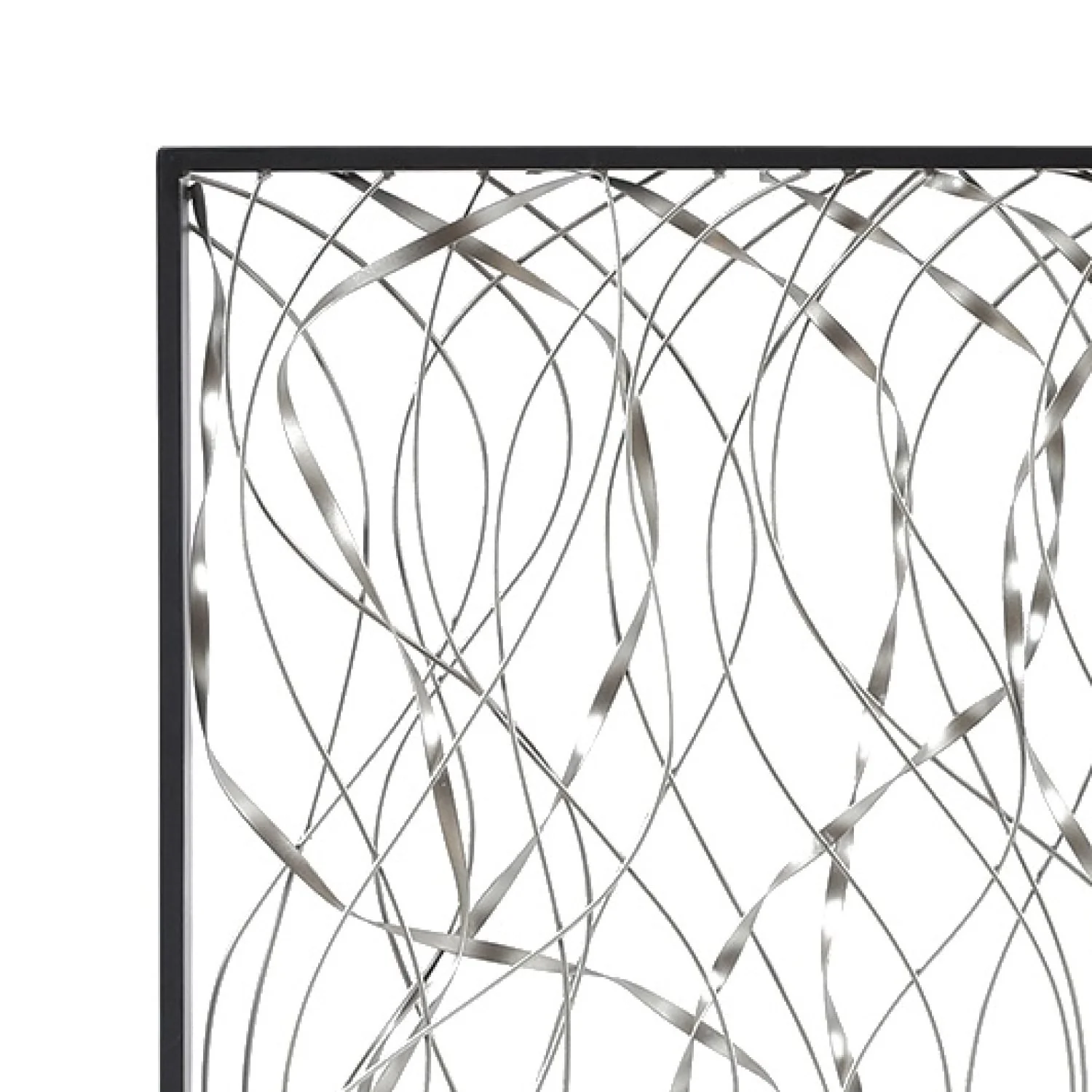 This abstract eye-catching metal sculpture is the best accessory for a wide array of home designs, especially contemporary ones. Add a unique element to your home with this gorgeous piece of wall art with its rectangular black frame and interwoven silver bands that provide its distinct design. The fluid patterns and the combination of silver and black form a genuinely intriguing metal wall decor. It pairs well with a neutral or bright wall color, and the openness of the metal wall decor allows your color palette to peek through. This item hangs horizontally with brackets attached to the back of the frame. This 46-inch-wide piece will look great above your entryway console table, in your family room above the sofa or mantle, or in your bedroom above the bed.