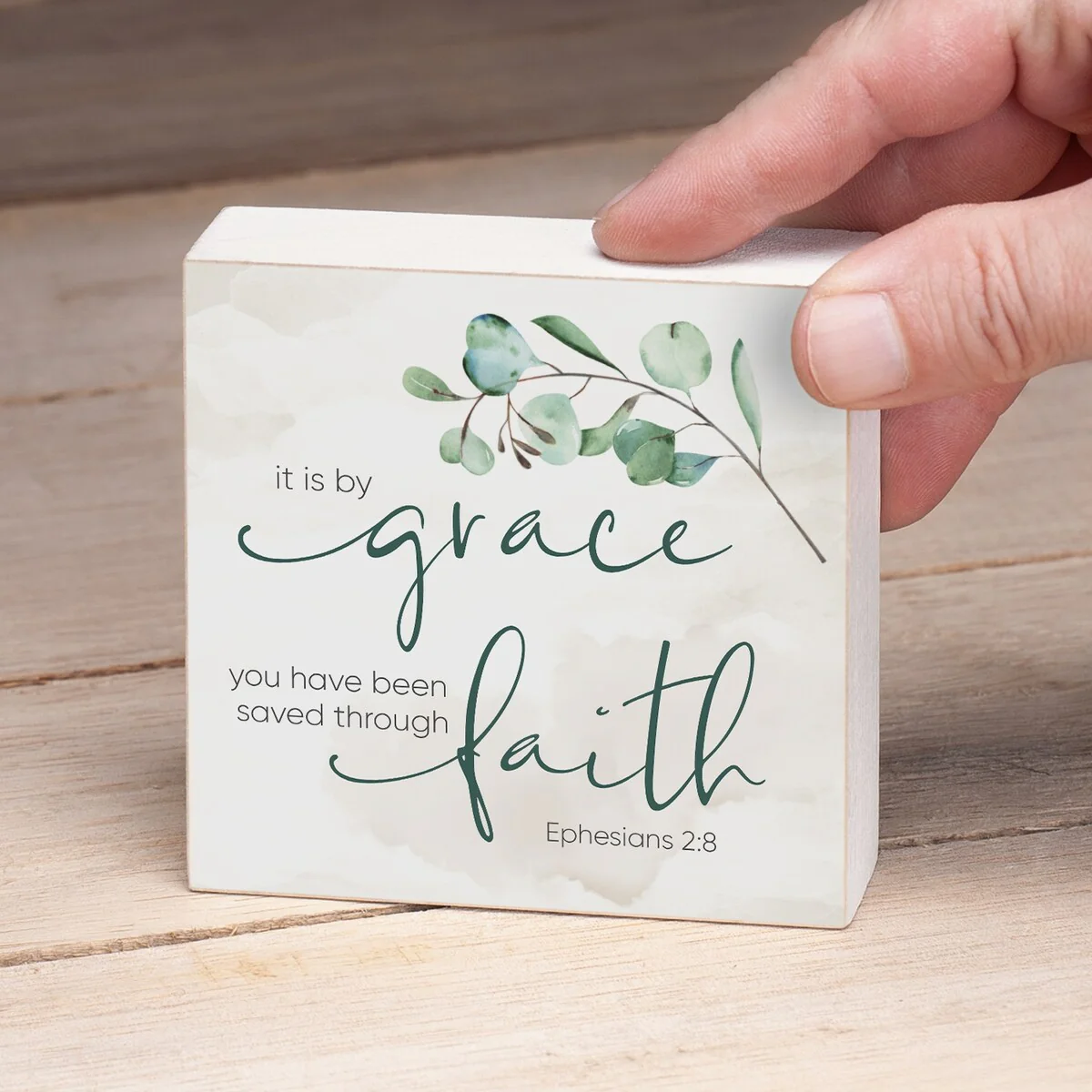 • Wood Block Décor Message by Grace Saved Through Faith Sign, 3.75 inches Square, Made in The USA - Multi-38