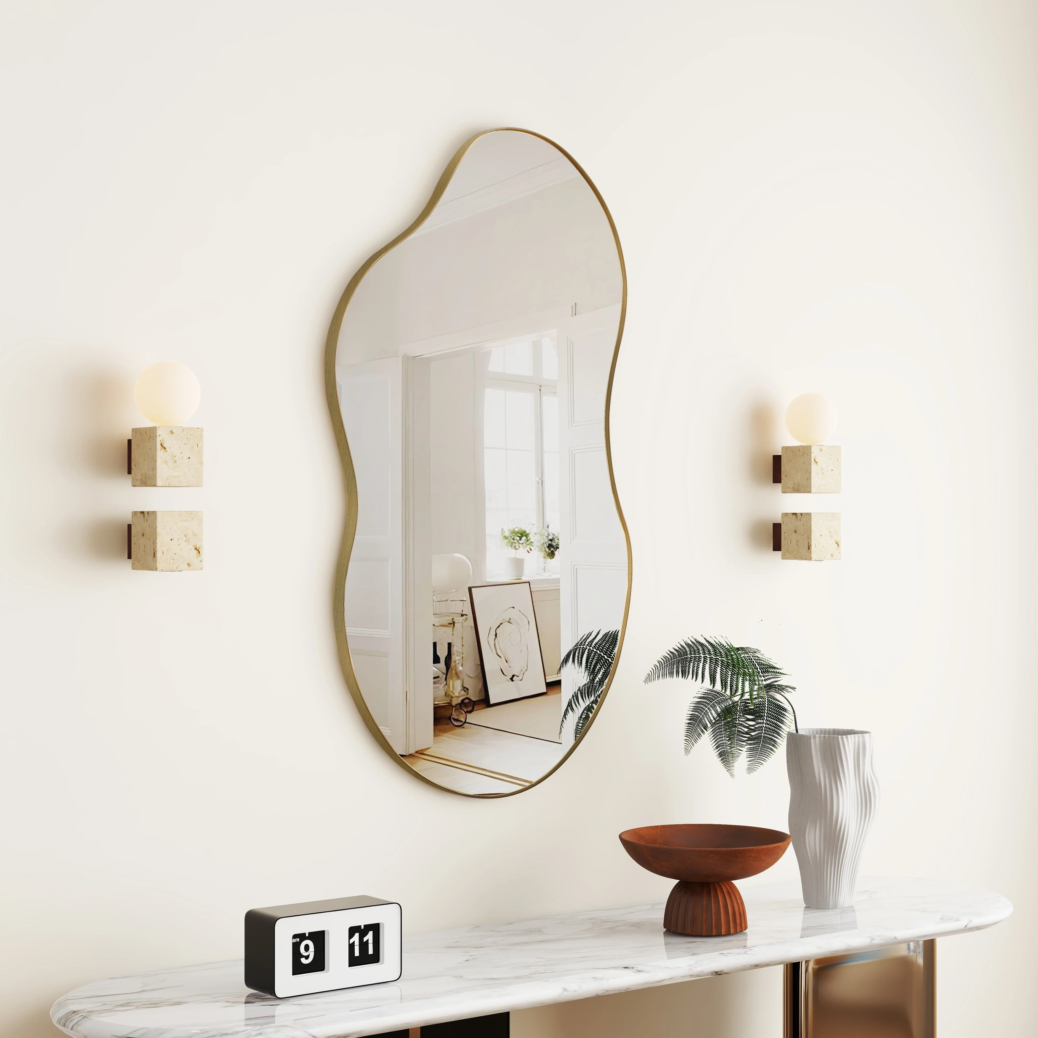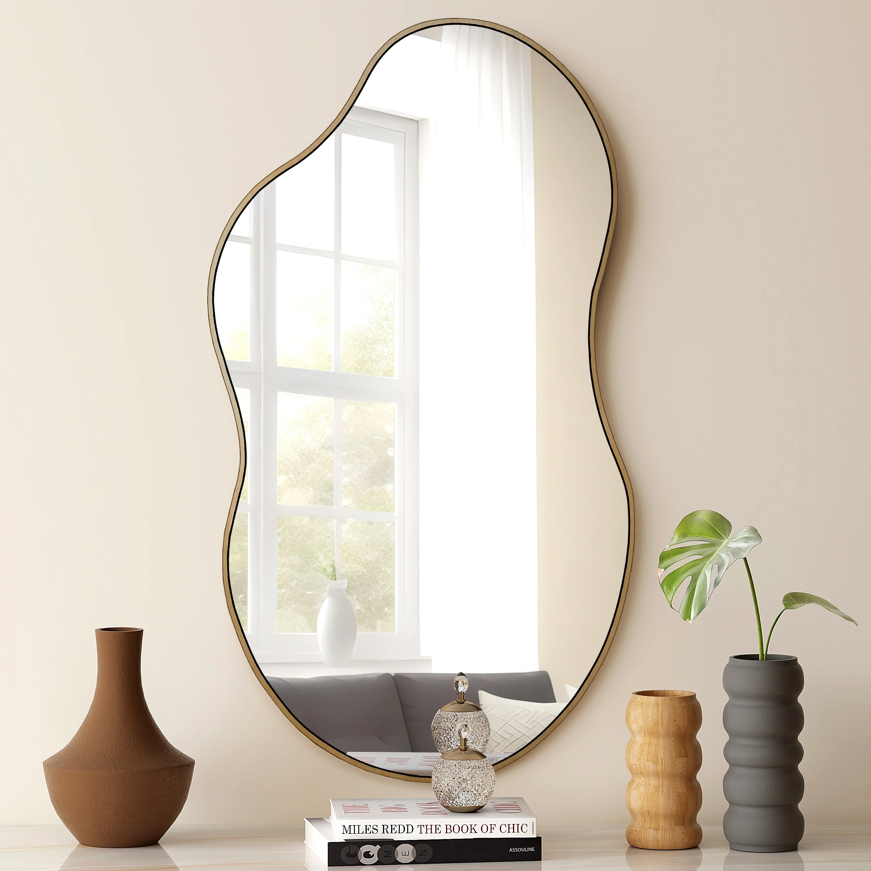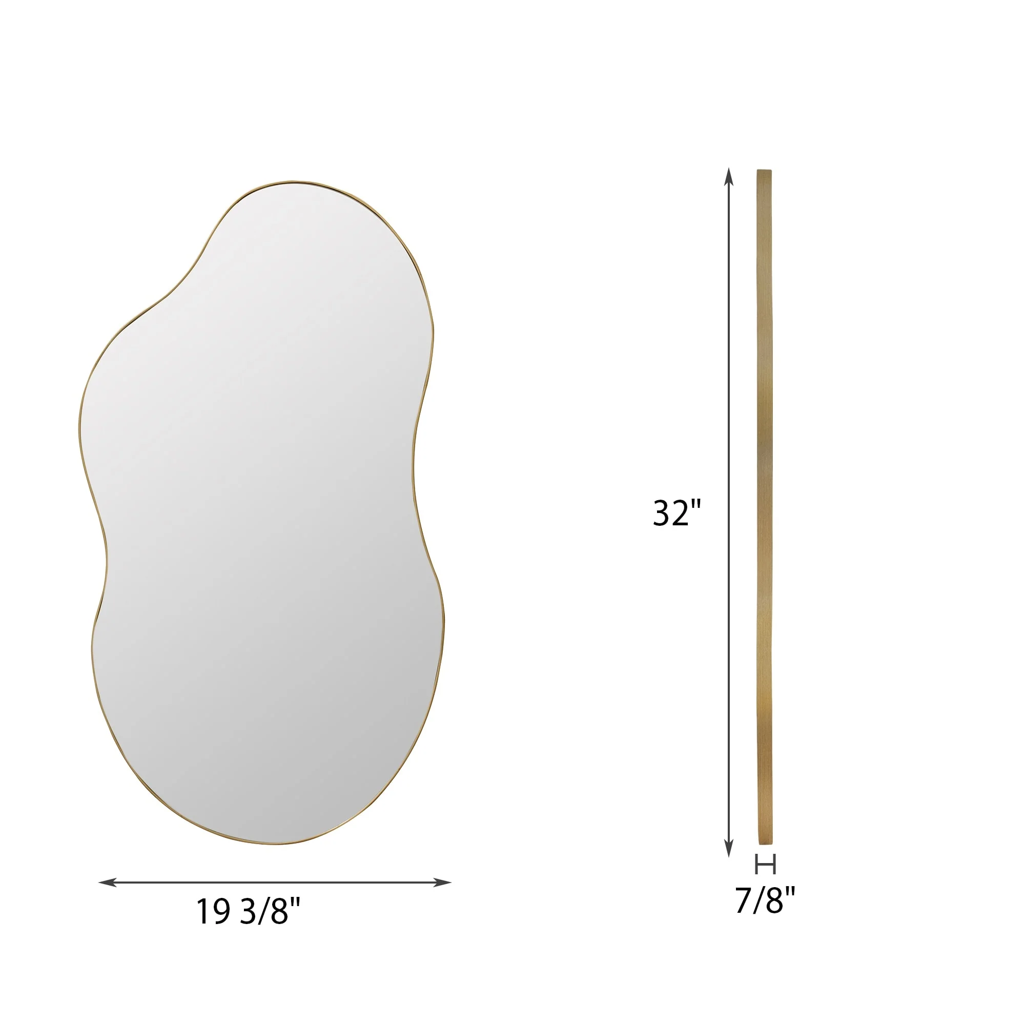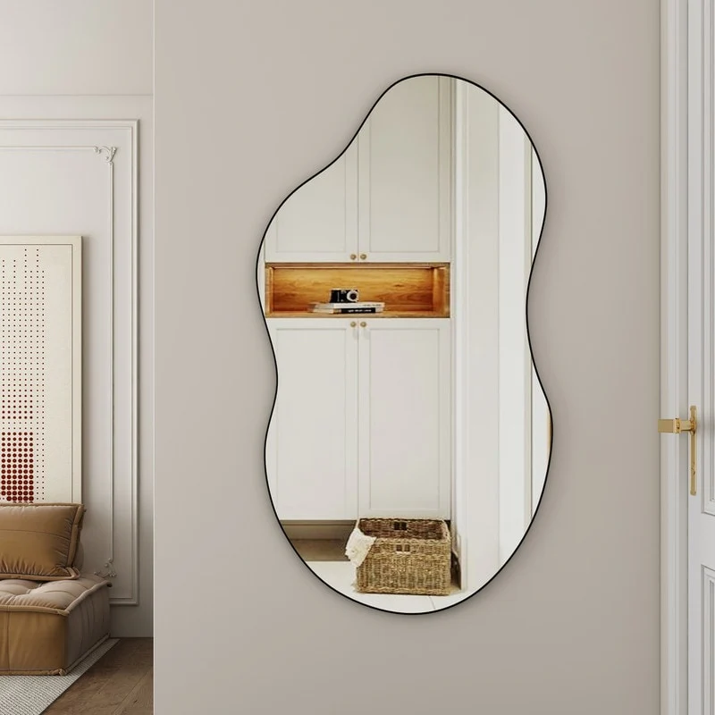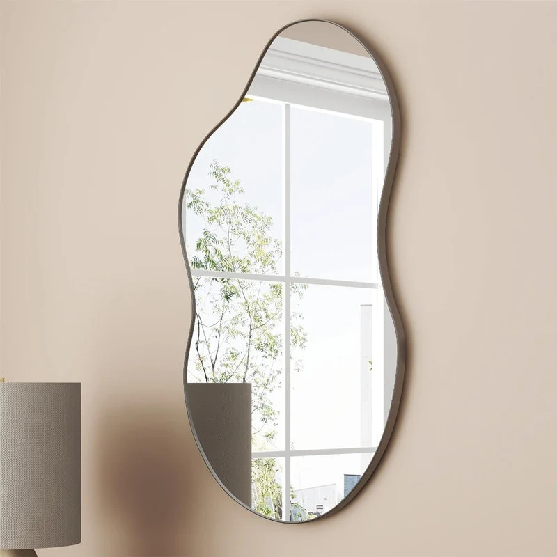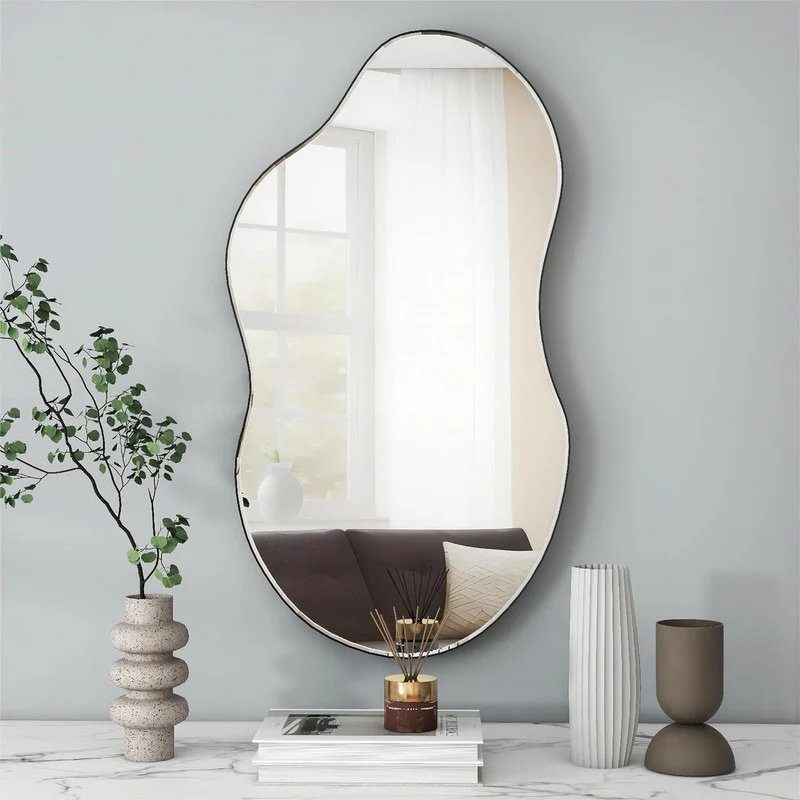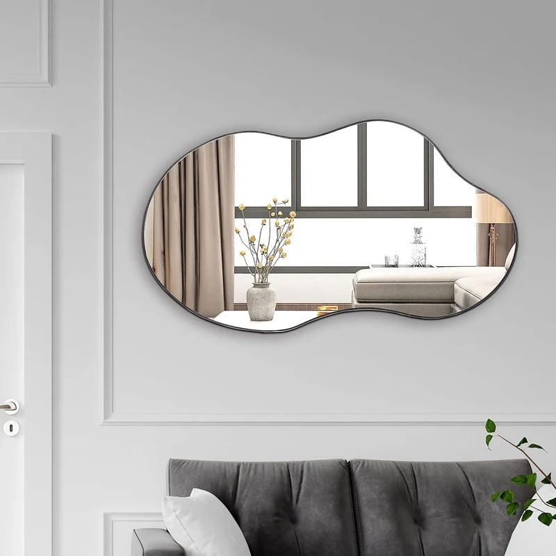 Discover the epitome of elegance with our sophisticated irregular mirror, expertly crafted from eco-friendly glass and MDF. This stylish and durable frame features a unique cloud-inspired design with wavy lines, adding a touch of simple yet refined elegance to any room decor. The asymmetrical shape not only enhances the aesthetic appeal but also provides a high-definition reflection, making it a practical choice for organizing your looks. Available in luxurious antique brass, classic black, and sleek silver, this mirror comes in three versatile sizes: 32 inches, 36 inches, and 43 inches. Transform your space with this exquisite wall mirror that effortlessly blends beauty and functionality.