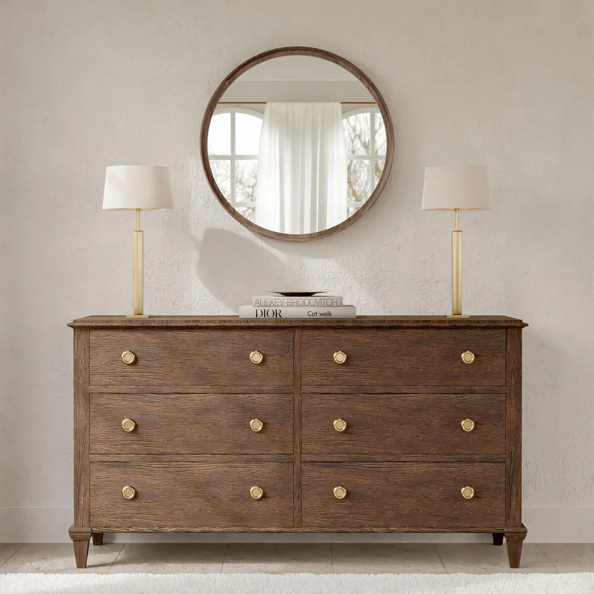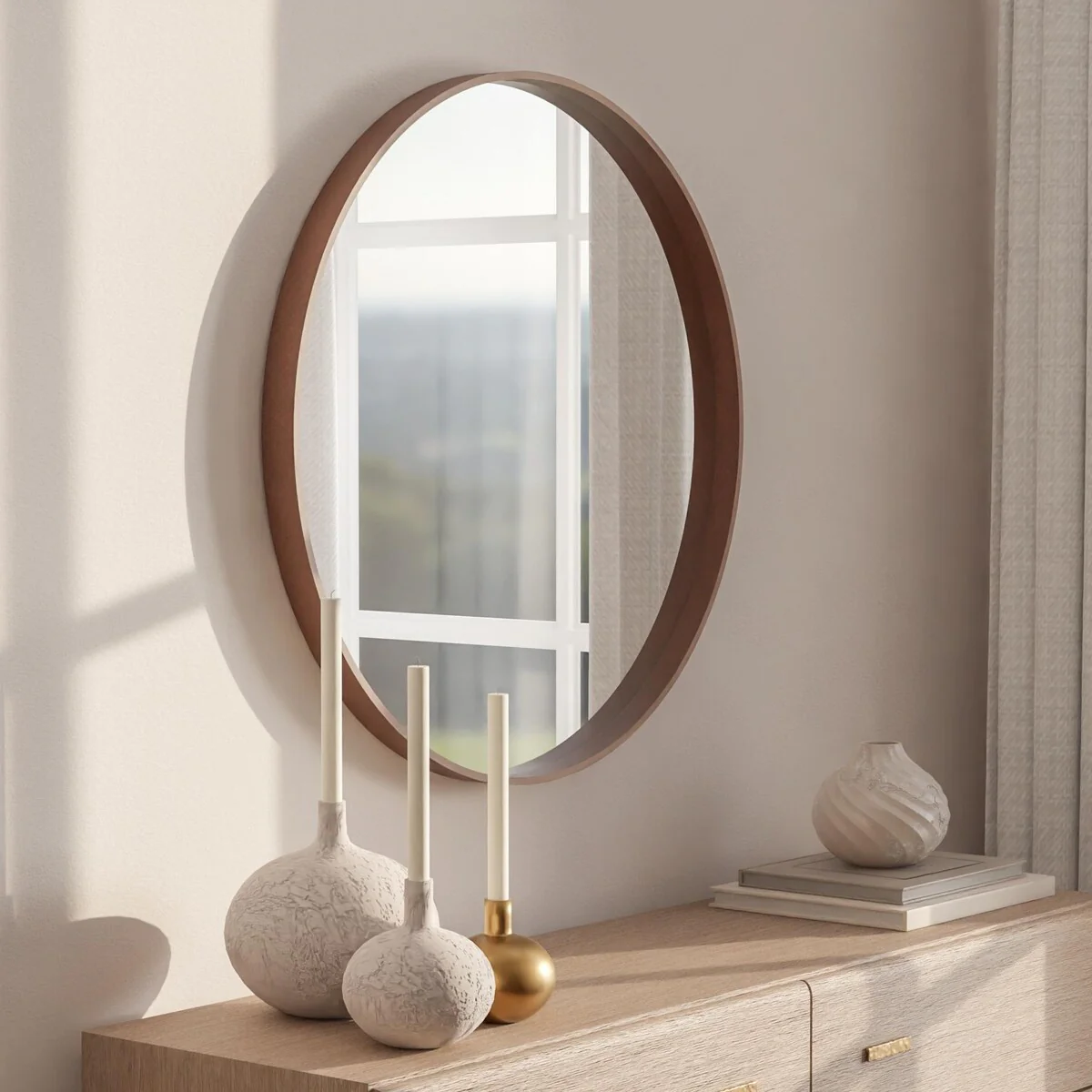 Elevate the elegance of your abode with this exquisite circular mirror. Not only does it enhance the aesthetic appeal, but it also serves the practical purpose of assisting you in your grooming routine. Its contemporary design seamlessly blends with any modern décor, and its size variations make it a versatile addition to any room. You can select from a range of stunning colors, including the charming Washed Gray, the classic Light Oak, the sleek Satin Black, and the rich Satin Walnut. The installation process is effortless, and it will create an illusion of spaciousness and luminosity in your living space.