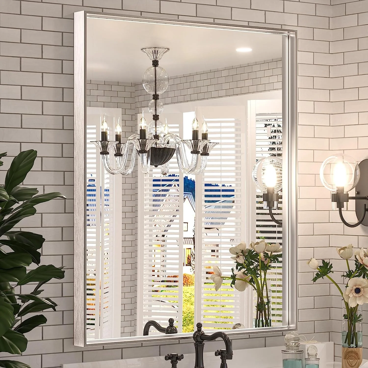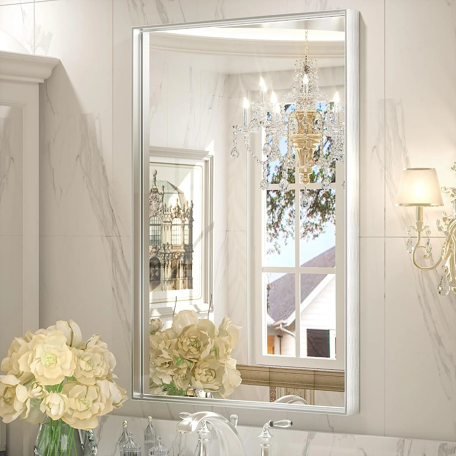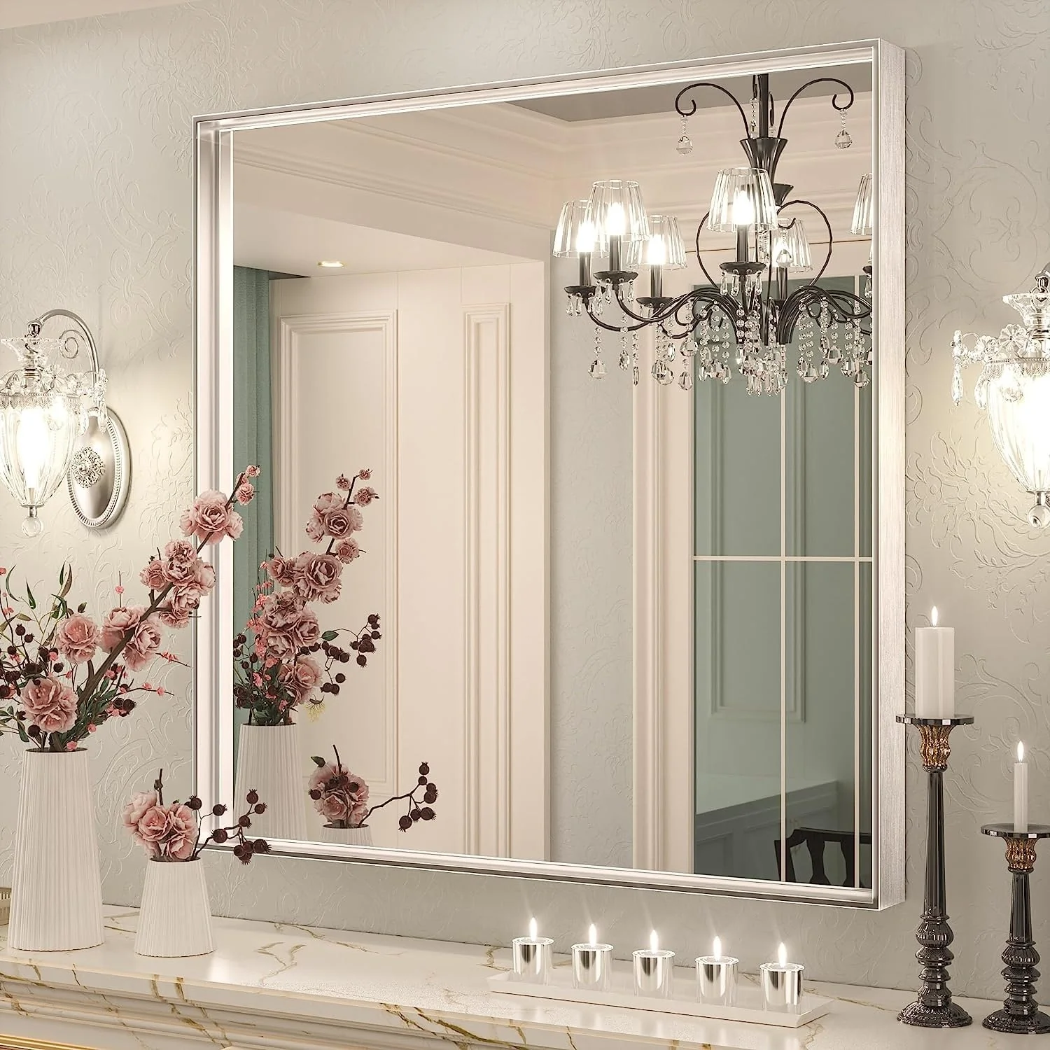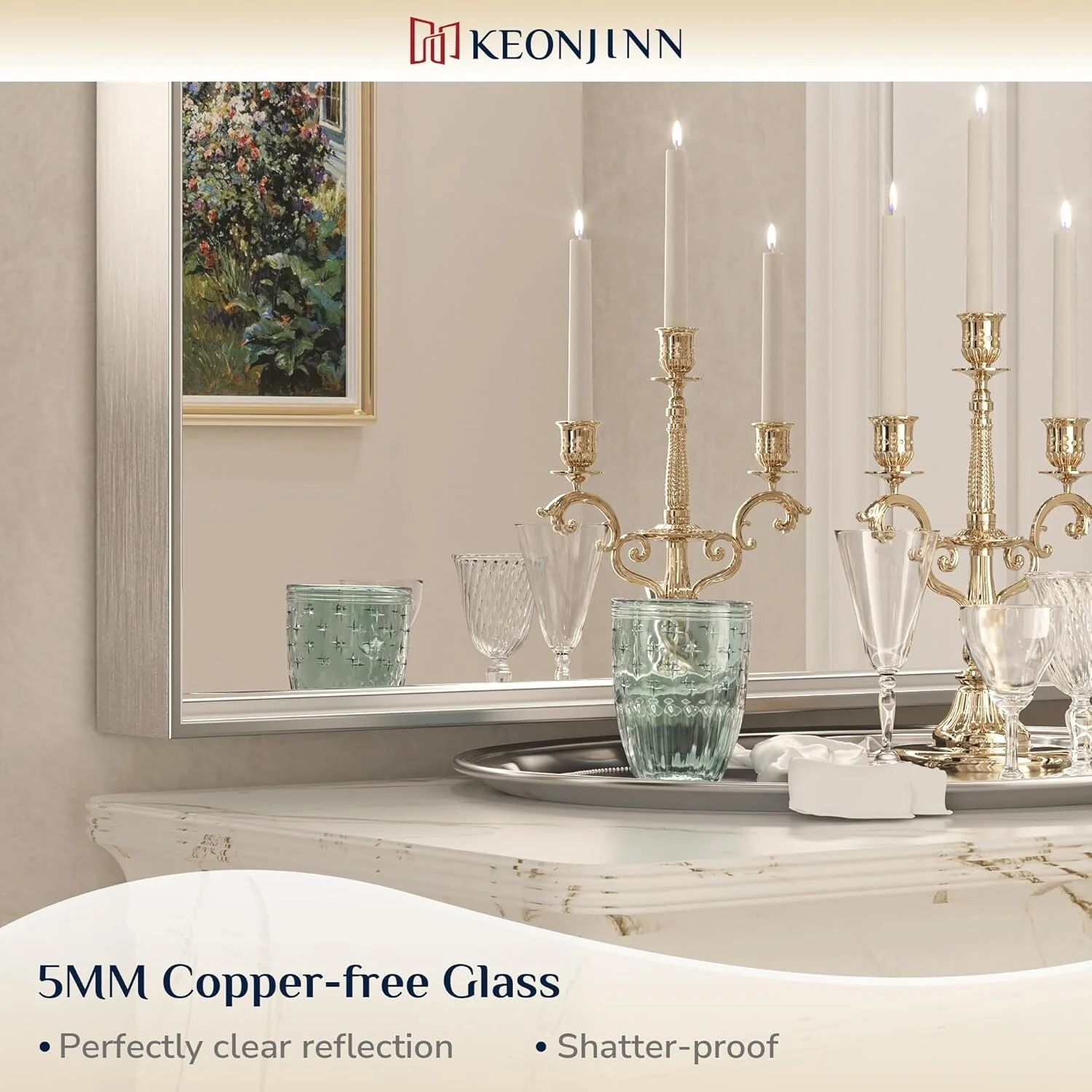 ▶The brushed metal mirror designed with 4 built-in slots on the back for hanging horizontally or vertically. Super easy to install with one French cleat bracket. Hardware Included. We have designed a sturdy 4-layer packaging for mirrors, so you don't have to worry about receiving a broken mirror.