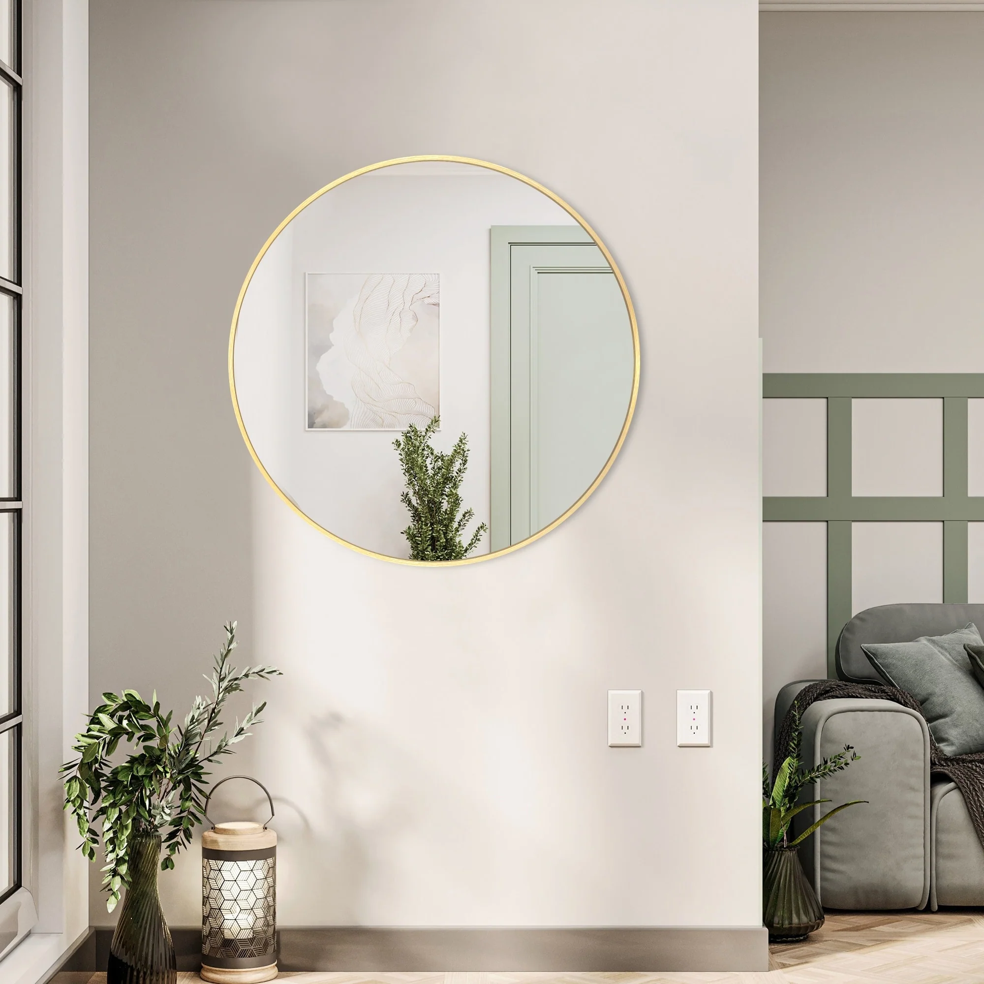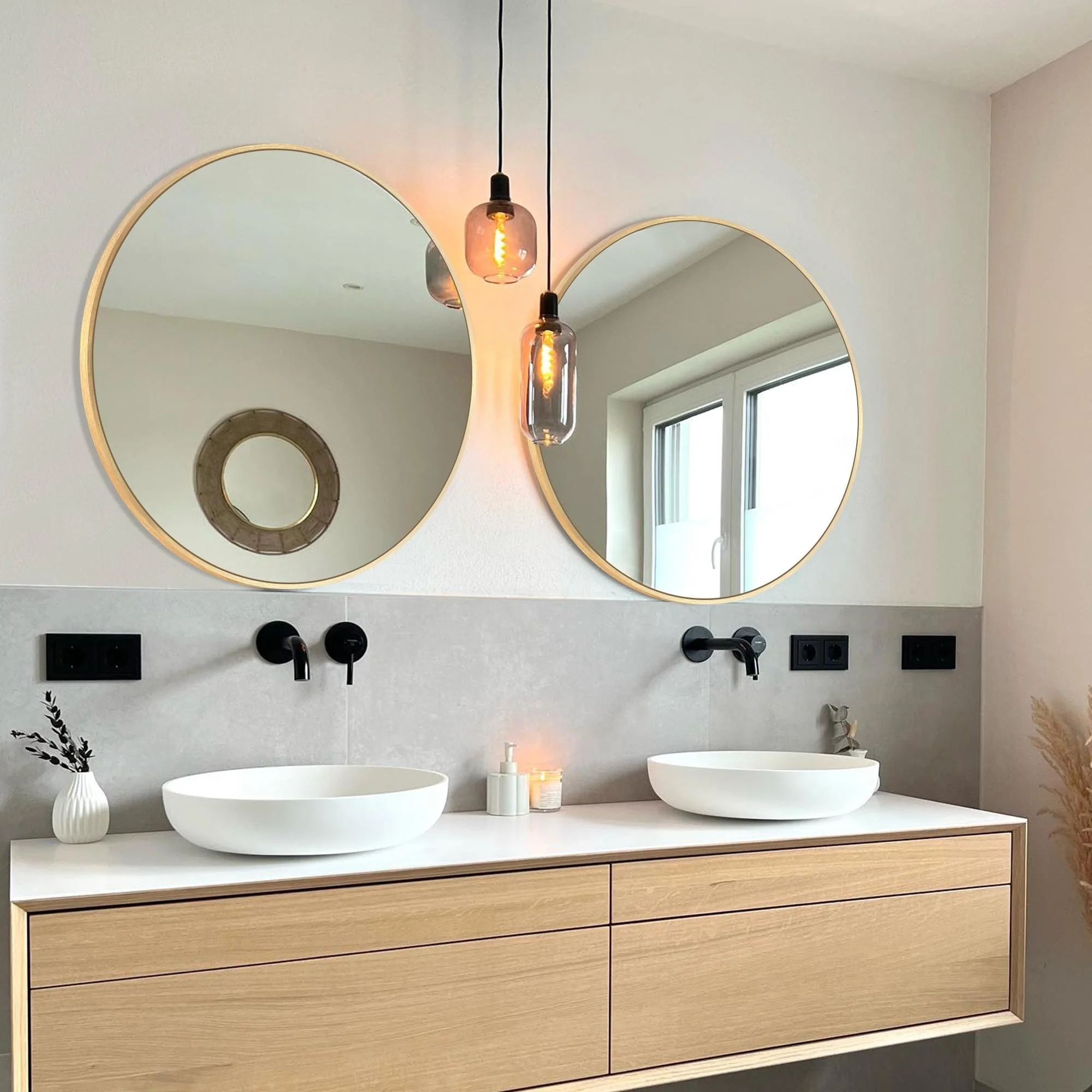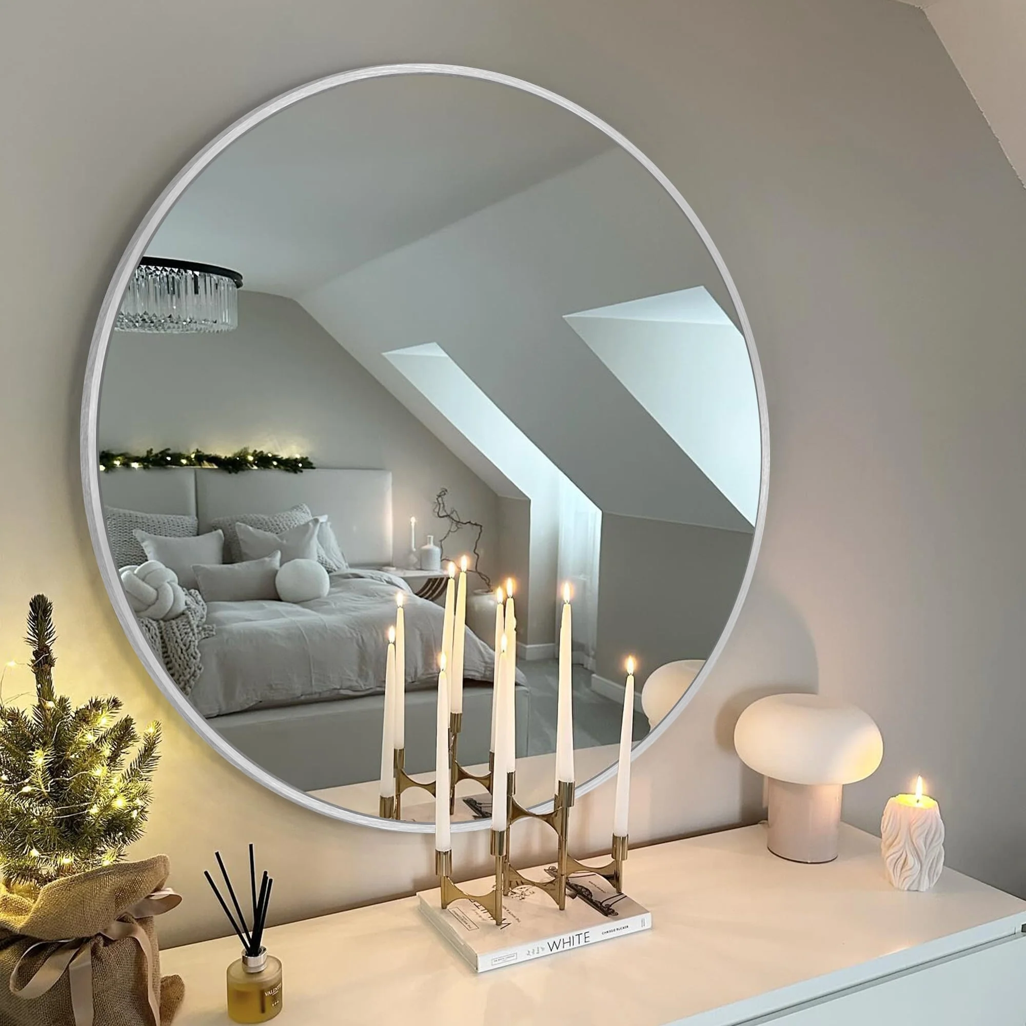 If you love the round mirror trend, and are looking for some inspiration - this is the best for you. The soft shape allows the eye to move effortlessly around the room and makes a statement all at the same time. Beautifully handcrafted, our round mirror for wall hanging is handcrafted with care and attention to detail and design. The round shape and the super-thin frame create a sense of solemn order, extending visually space, depth, and light. A round mirror is placed in the center, and the totals in the surrounding area help to accentuate the three dimensionality of the composition. The American Style Minimalist Bathroom Mirror reflects mottled light and shadow when illuminated, creating a dramatic three dimensional appearance. It adds a charming accent to your walls while serving as functional wall art, completing your modern, rustic, or farmhouse room decor.