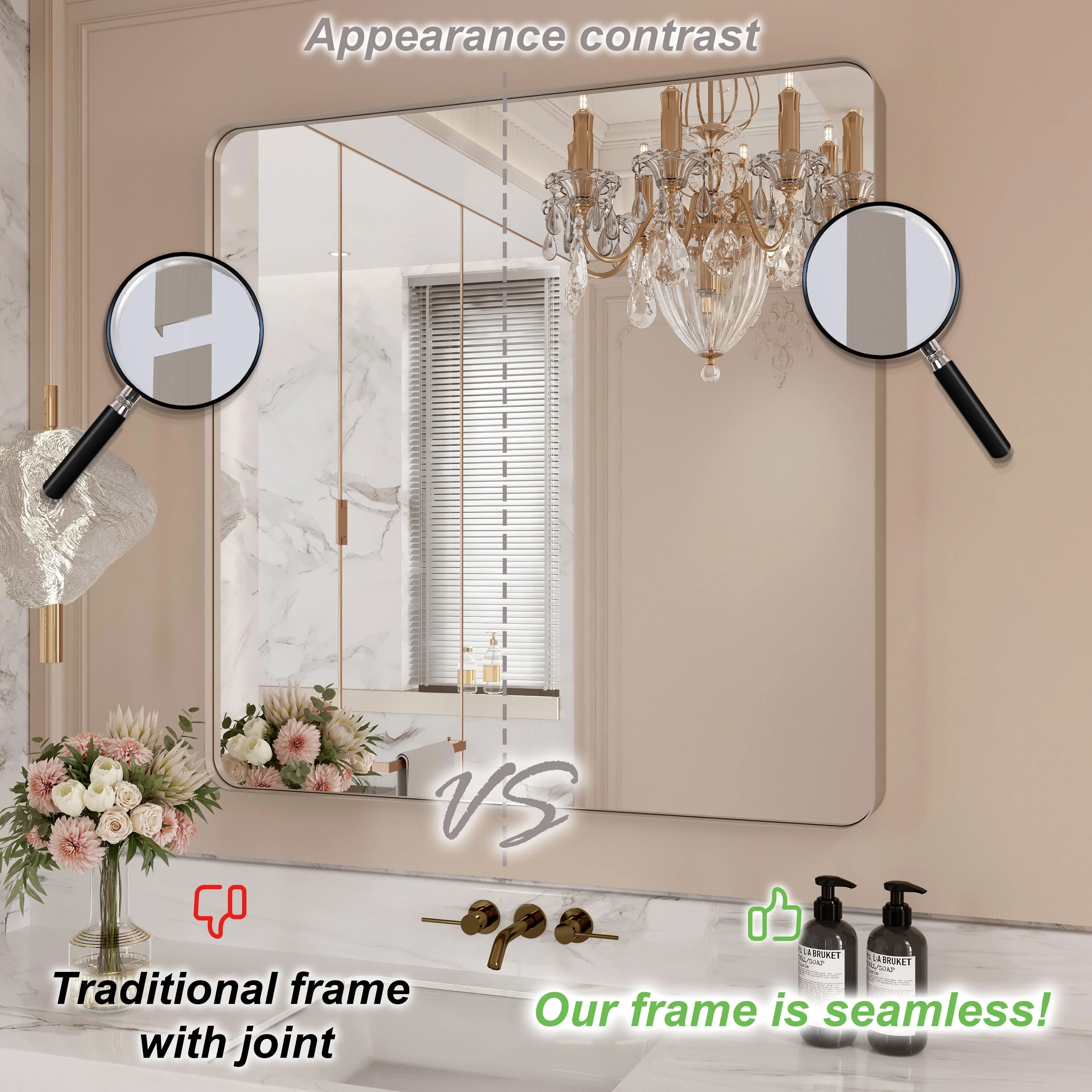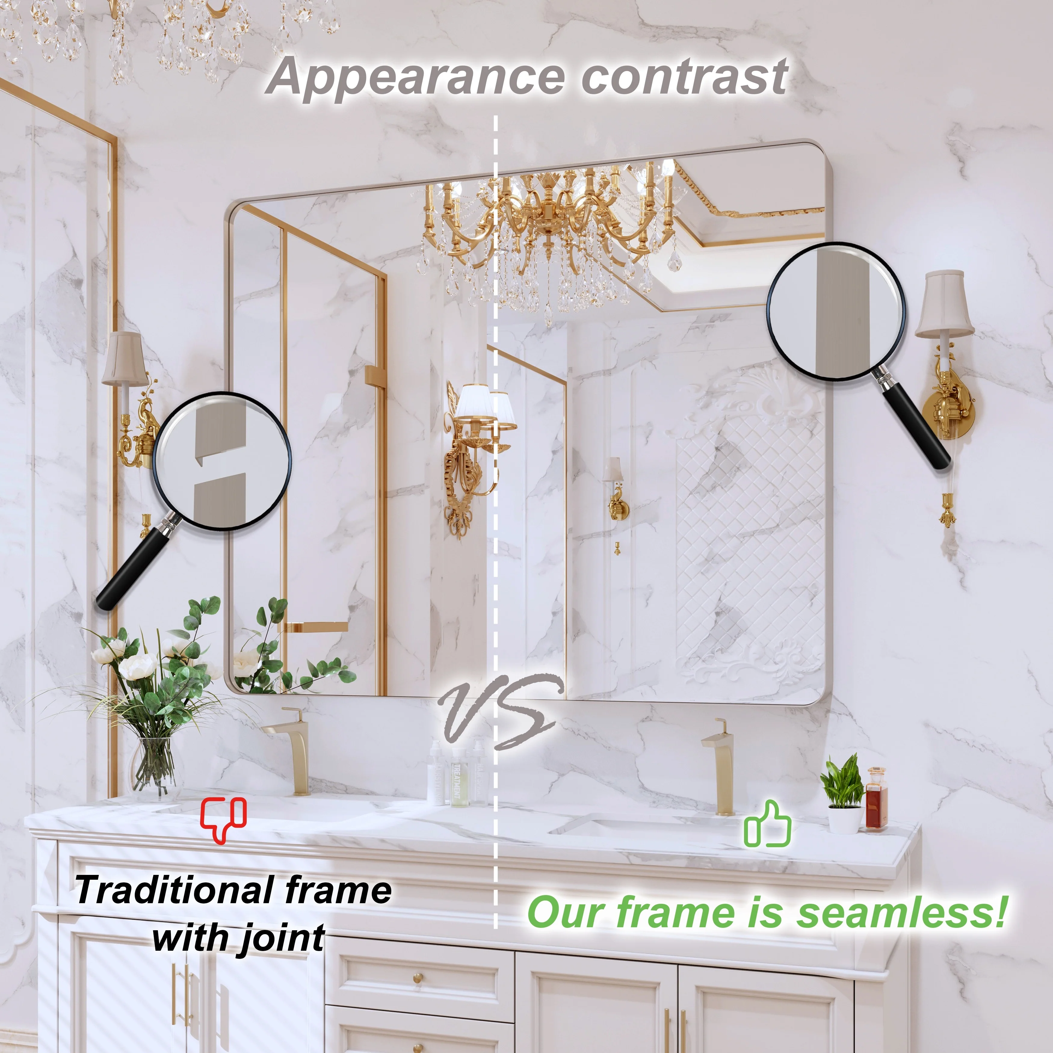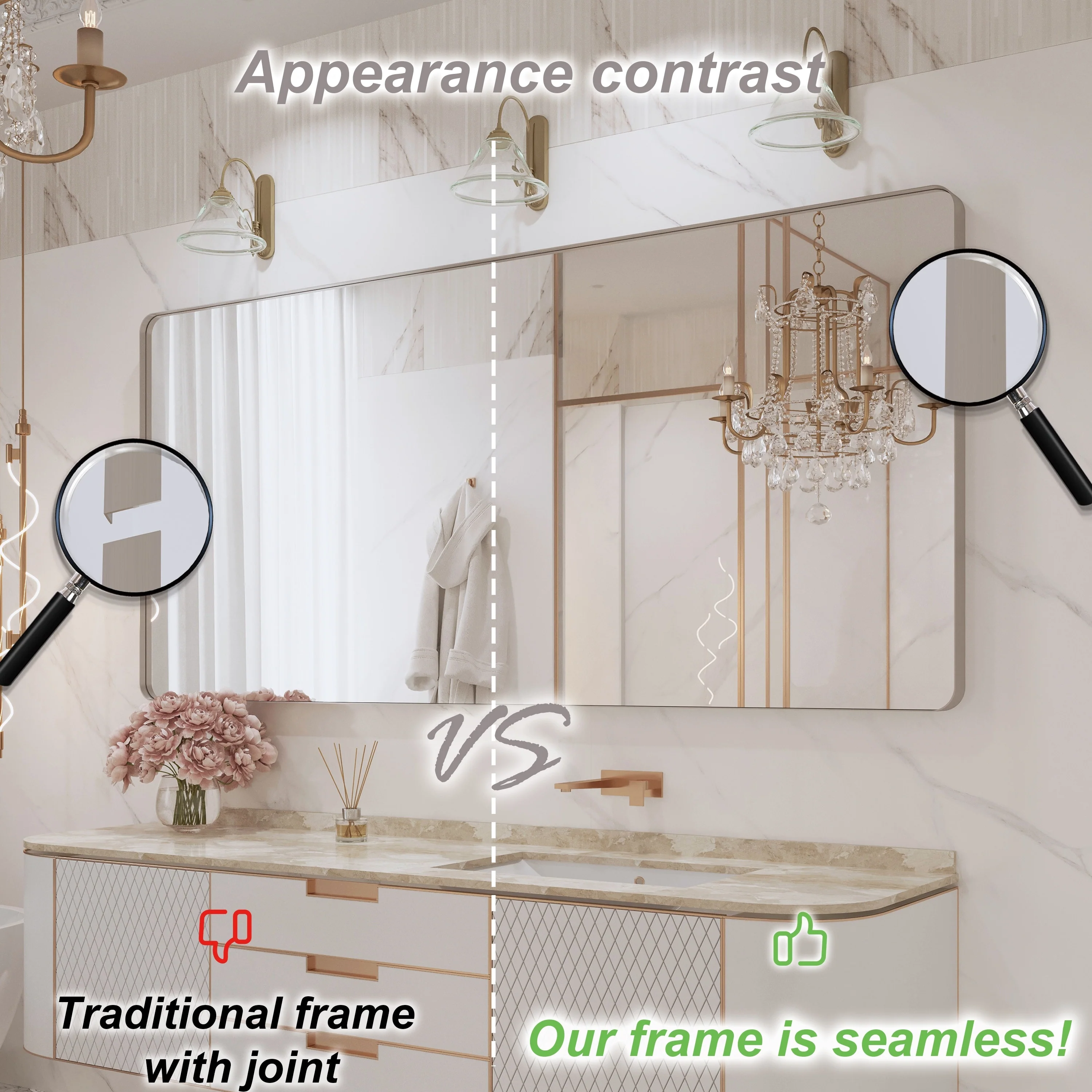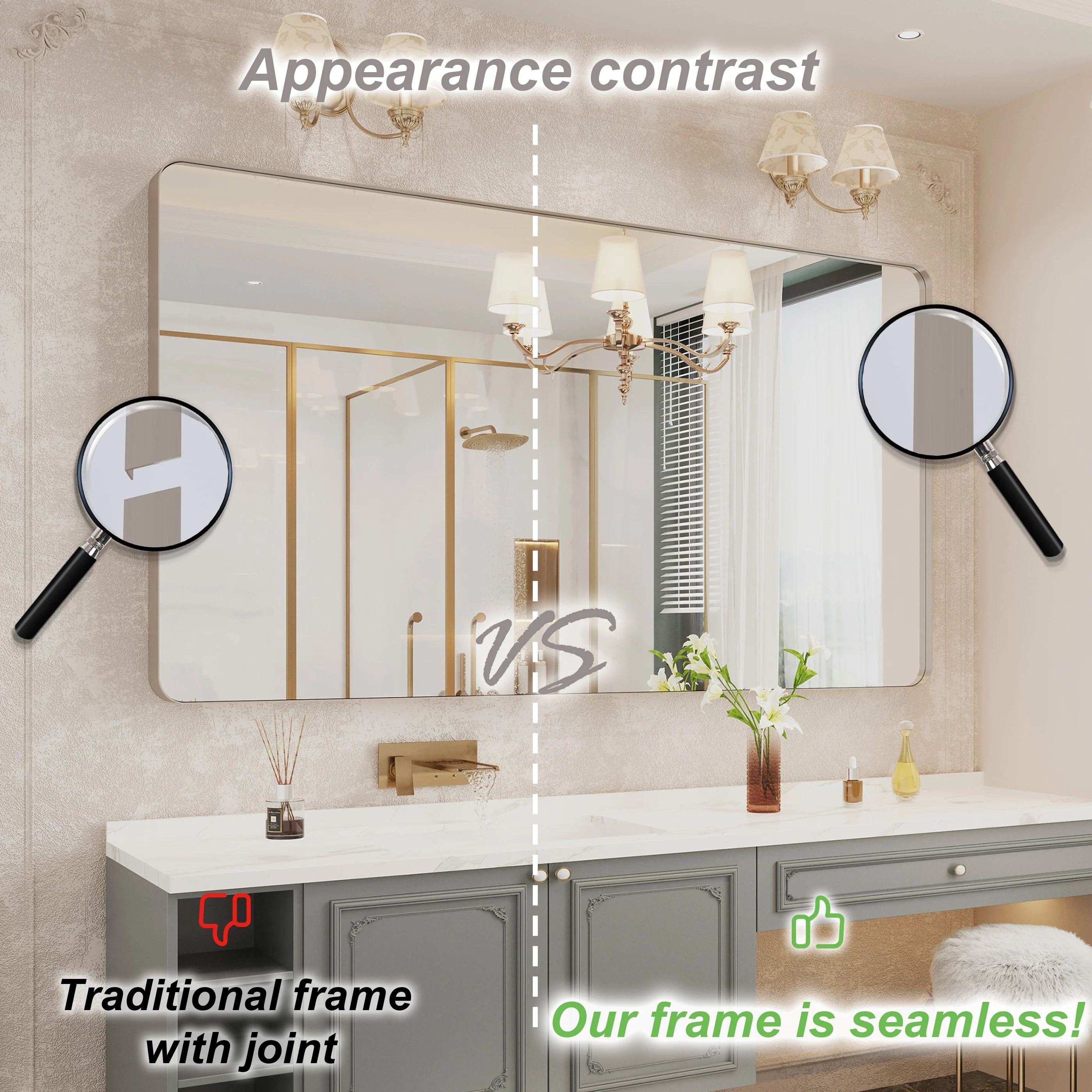 Seamless: the Frame is seamless. with this beautiful mirror, can upgrade your room to become more modern and beautiful.