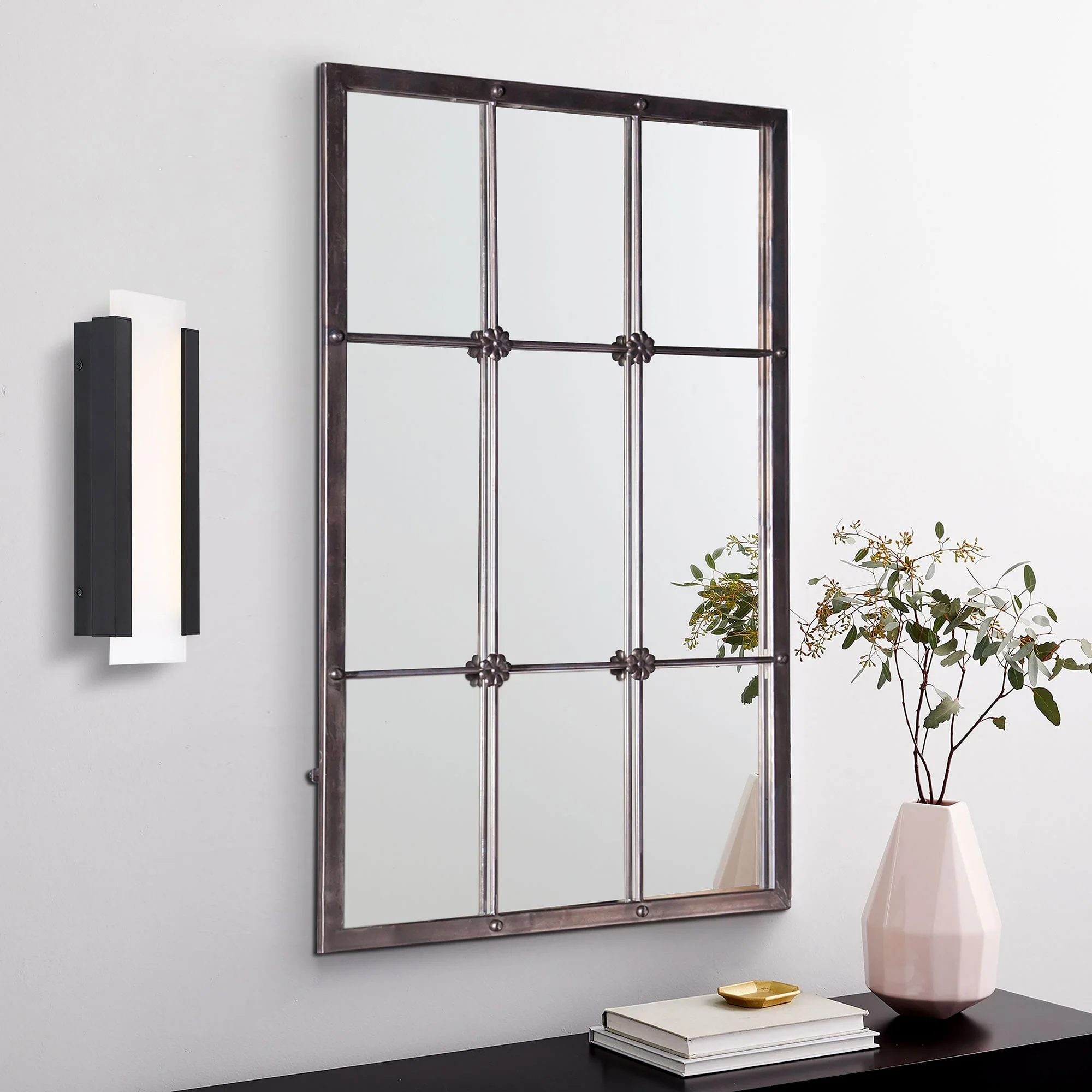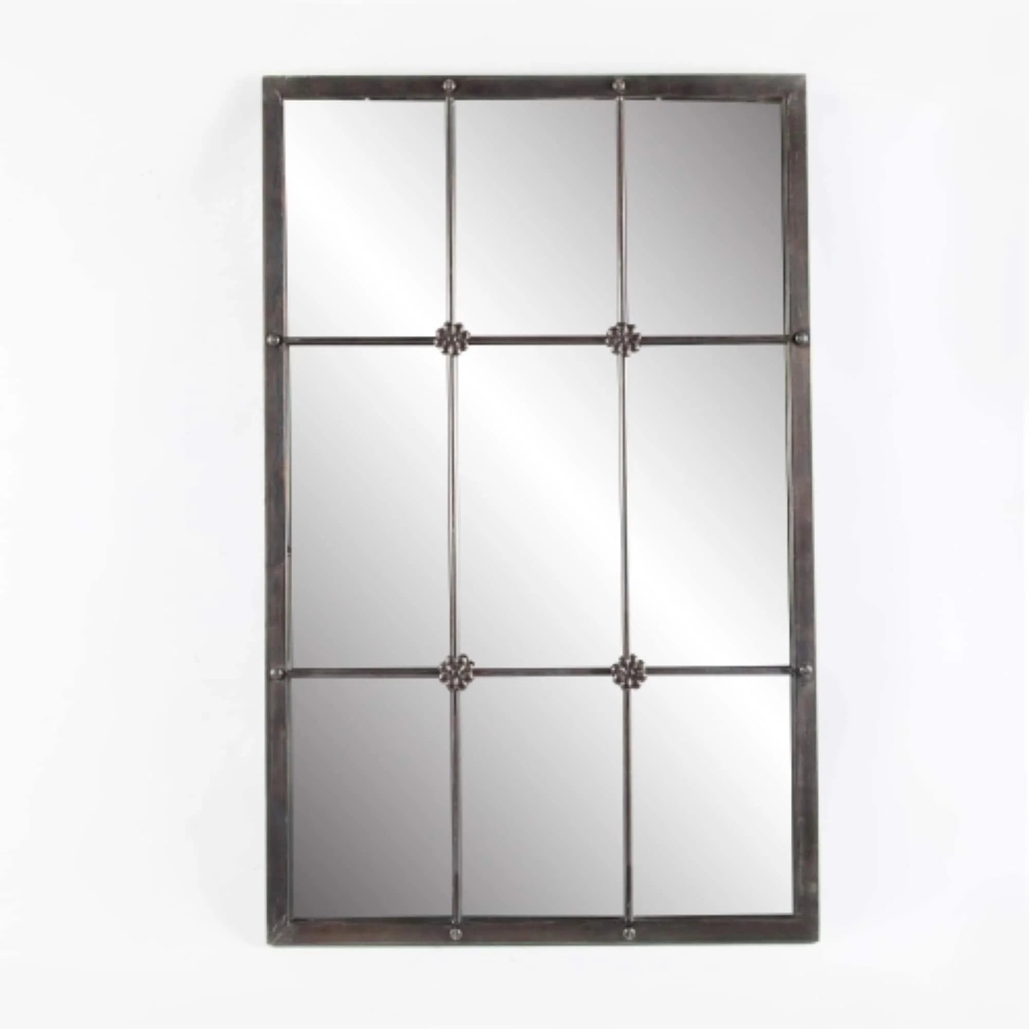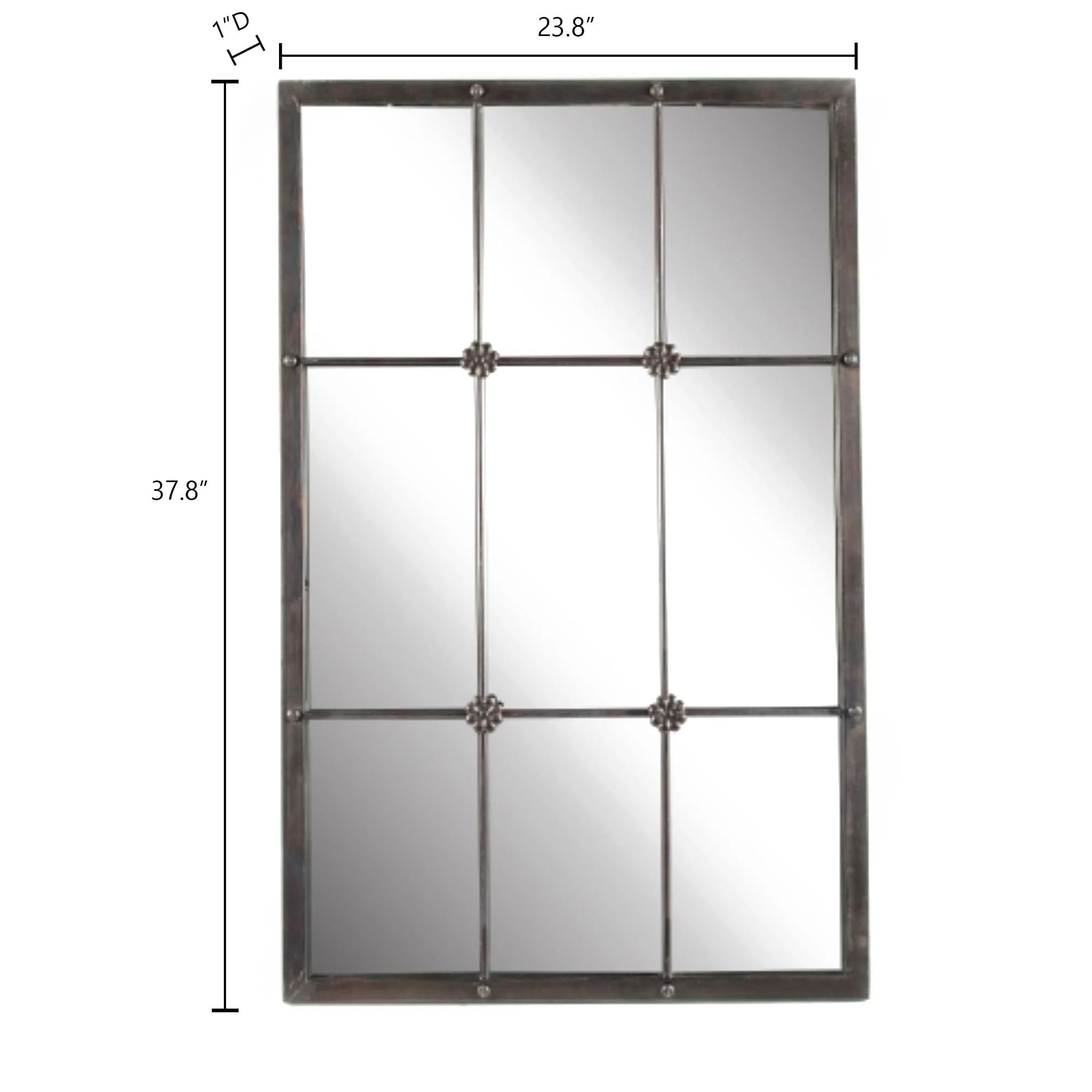 Tired of boring walls? This classic windowpane wall mirror will instantly bring light in your home and create the illusion of space. This rectangular window wall mirror features a single piece mirror behind nine windowpane sections and arrives ready to hang with the hardware included. The wall mirror is ready to mount to any flat surface with the metal tabs attached to the back of the frame. The mirror can be hung horizontally or vertically as you please. The frame is metal with one piece mirror divided into sections to look like a window. Brighten your home with this beautiful windowpane wall mirror. The mirror has a metal frame in a rustic brown finish. The panes are adorned with a metal flower in the center. The wall mirror will make a wonderful focal point for your entryway, living space, hallway, or bedroom.