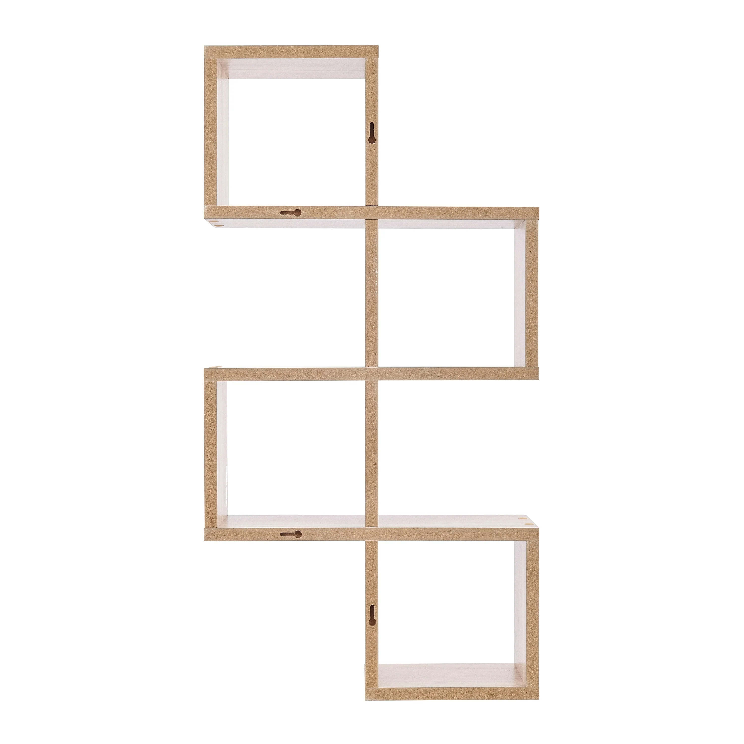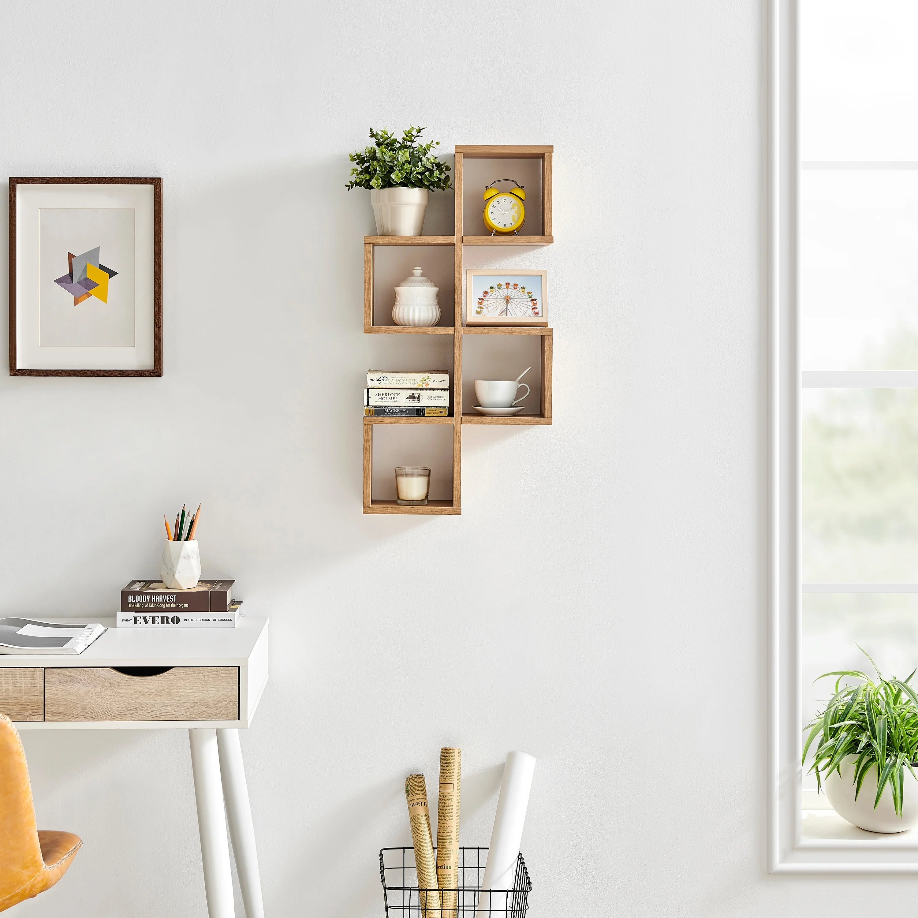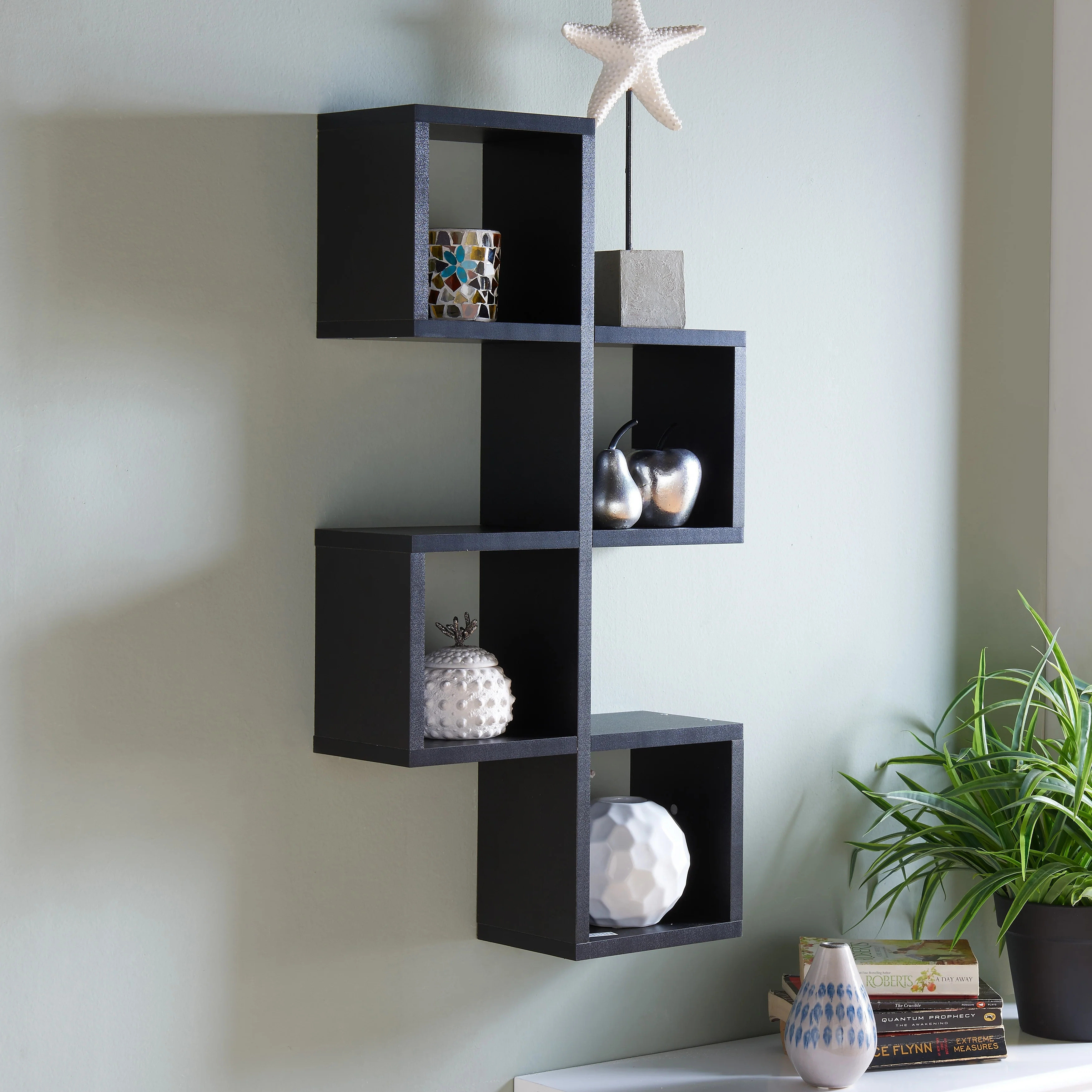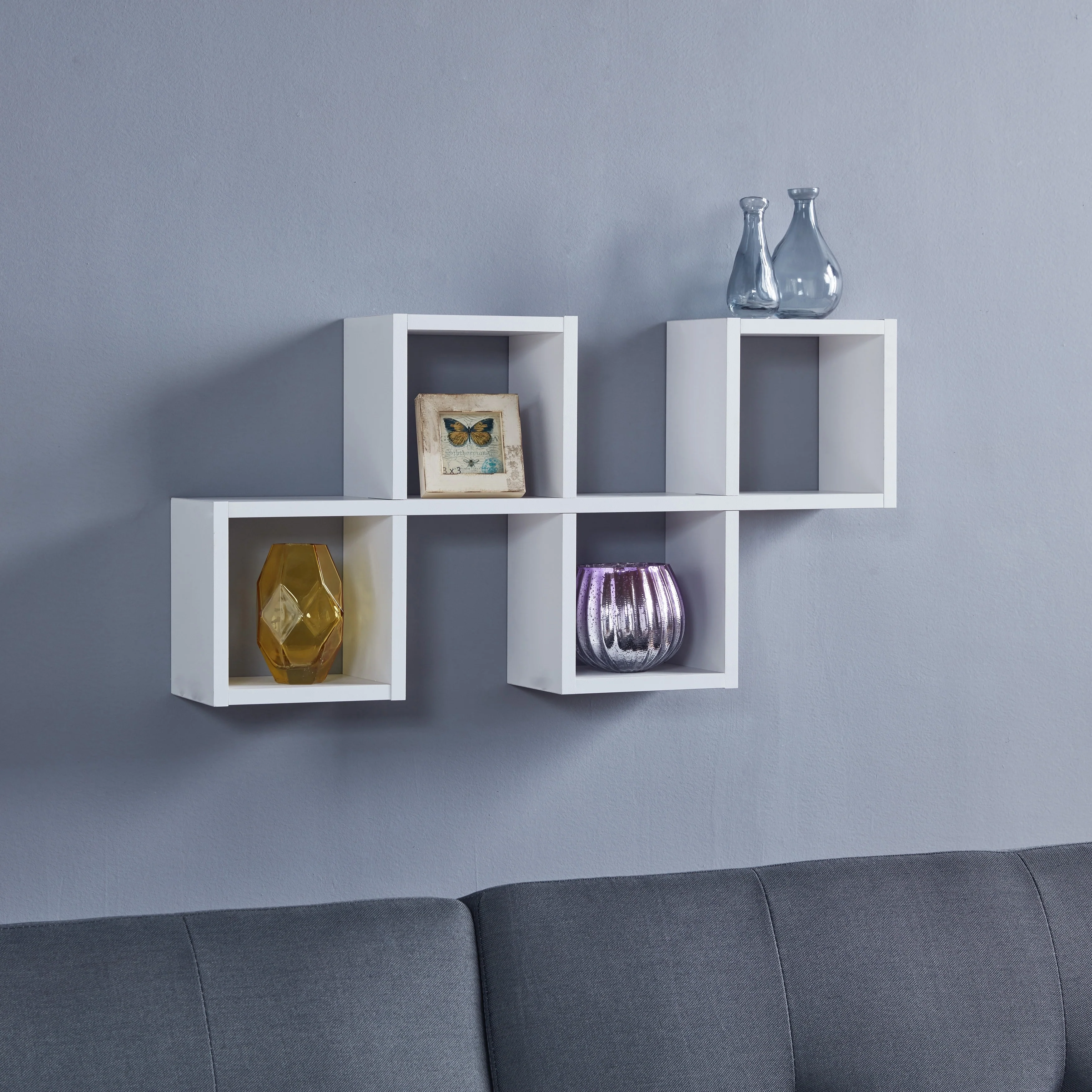 - Contemporary floating cube shelf design provides 4 storage cubbies plus 4 floating shelf surfaces to store and display your favorite items and décor