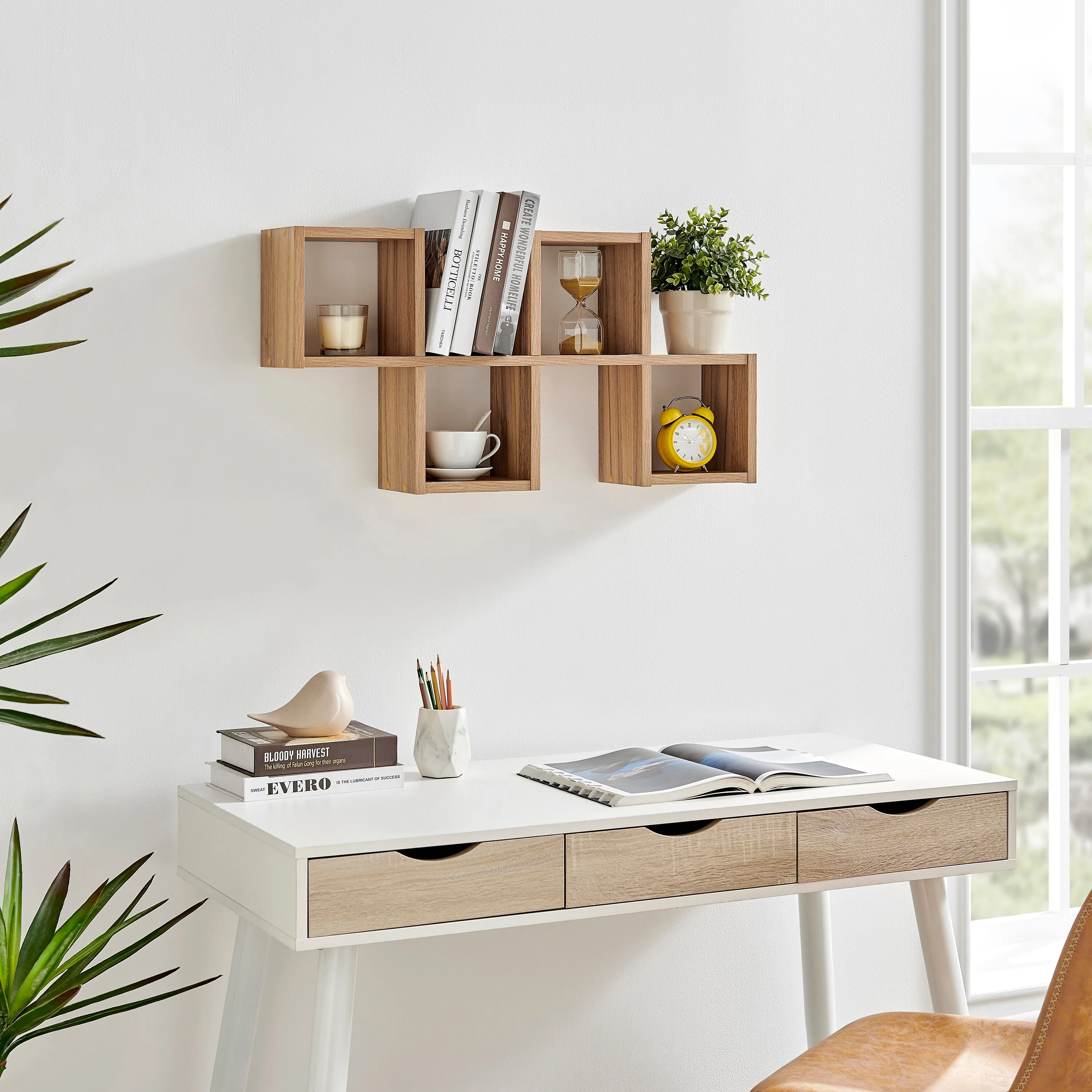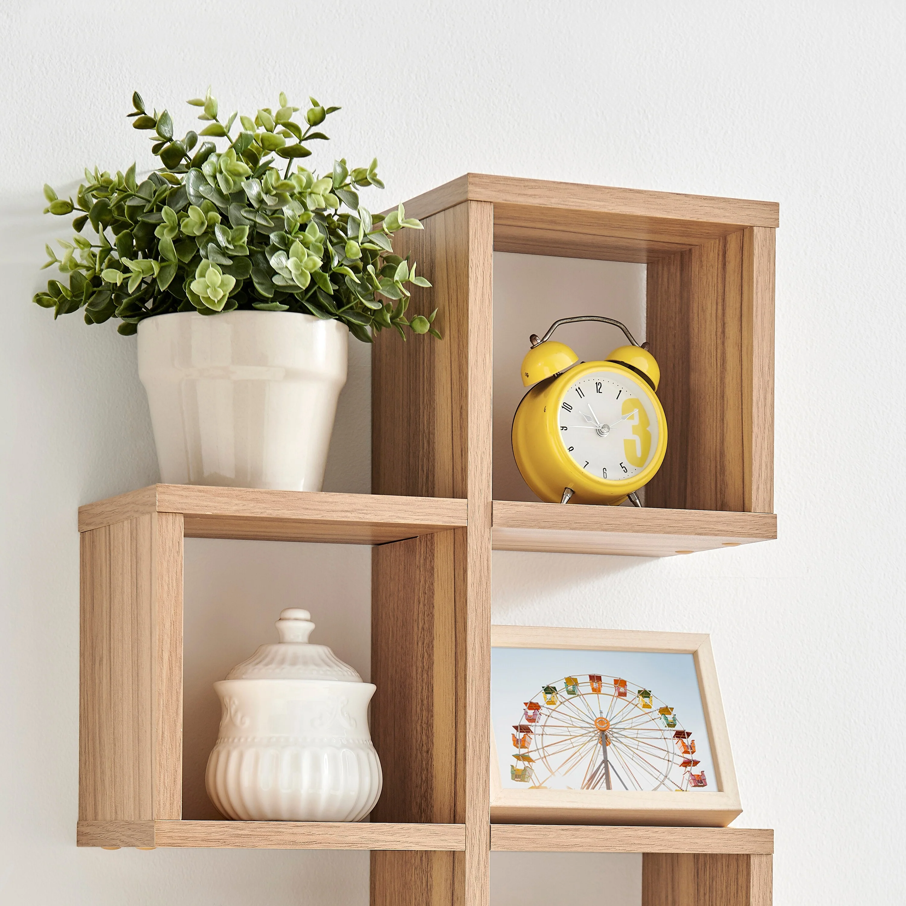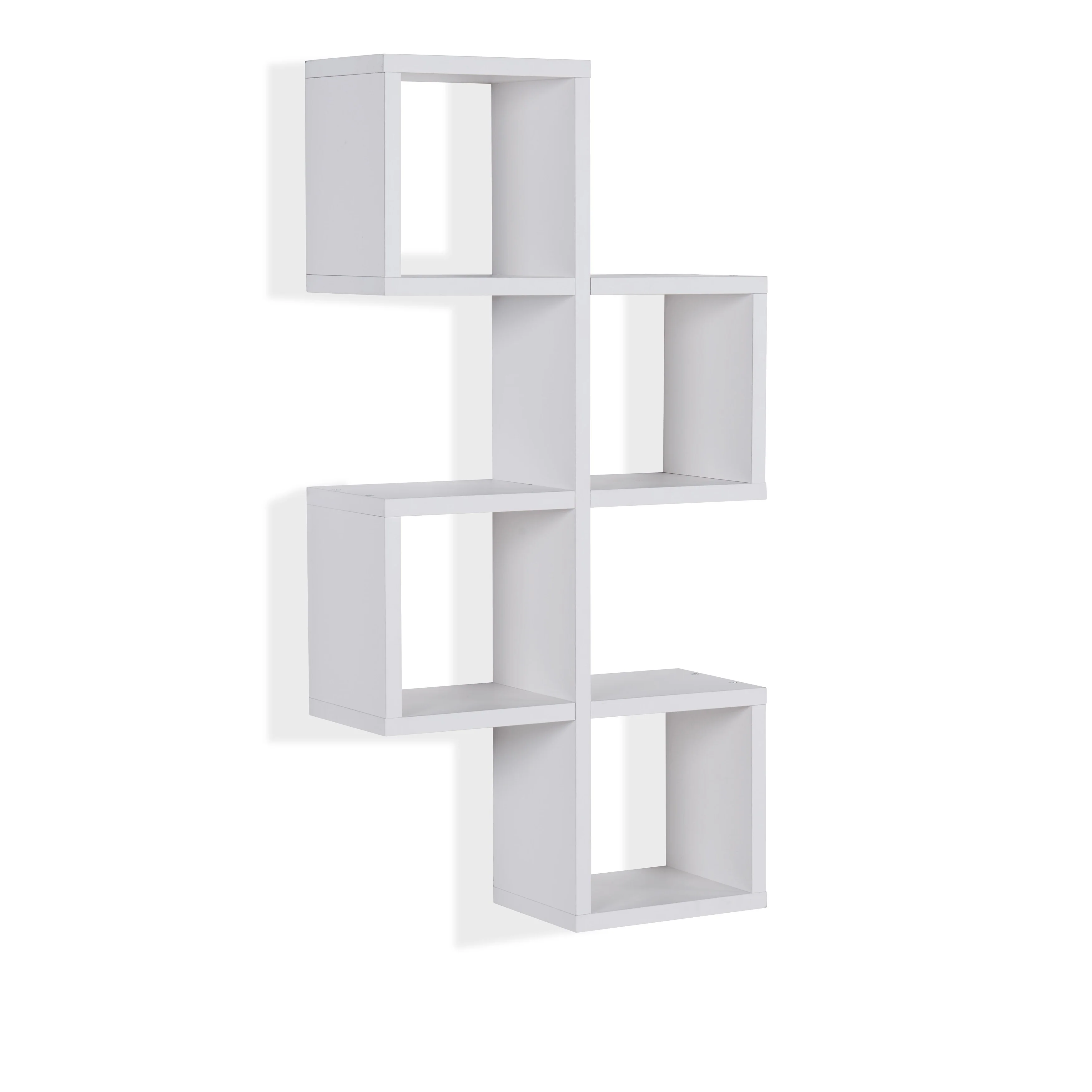 - Contemporary floating cube shelf design provides 4 storage cubbies plus 4 floating shelf surfaces to store and display your favorite items and décor